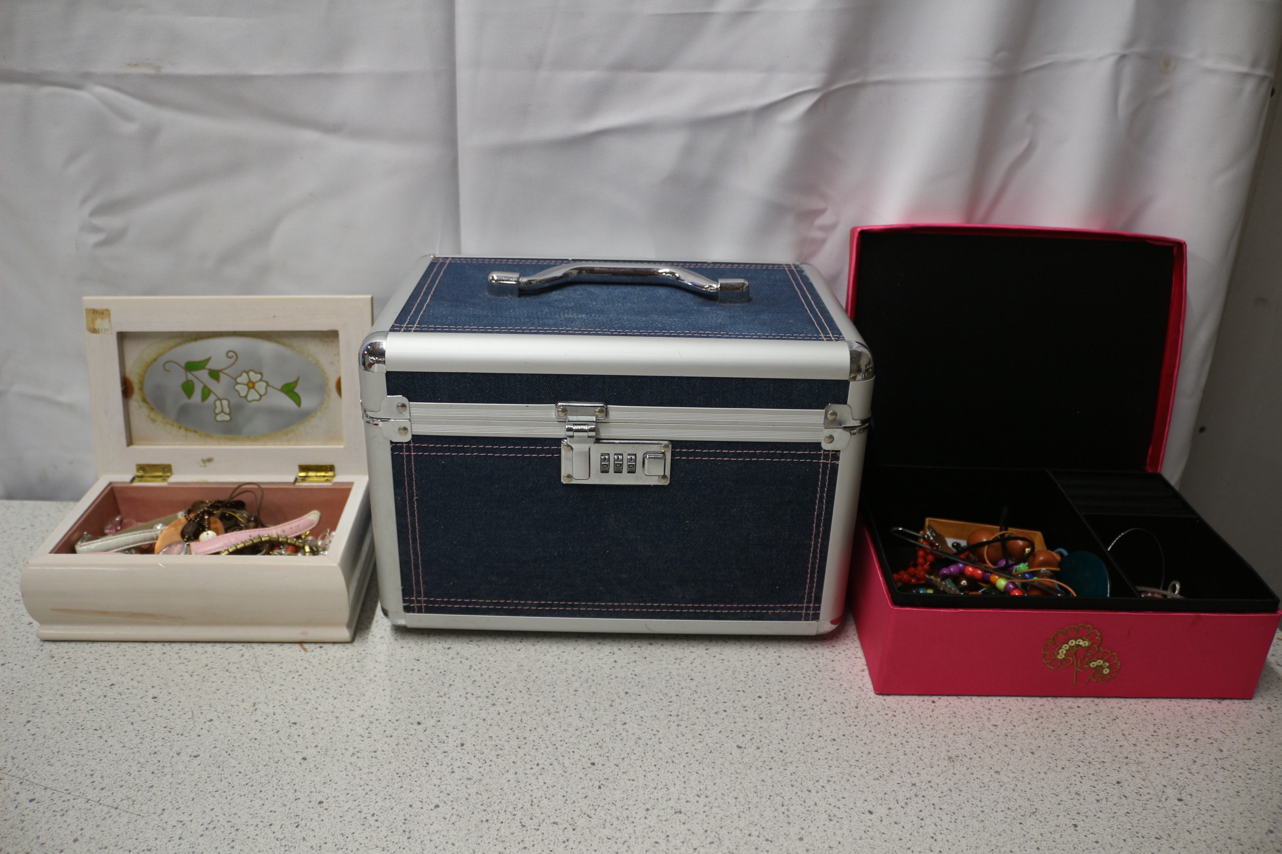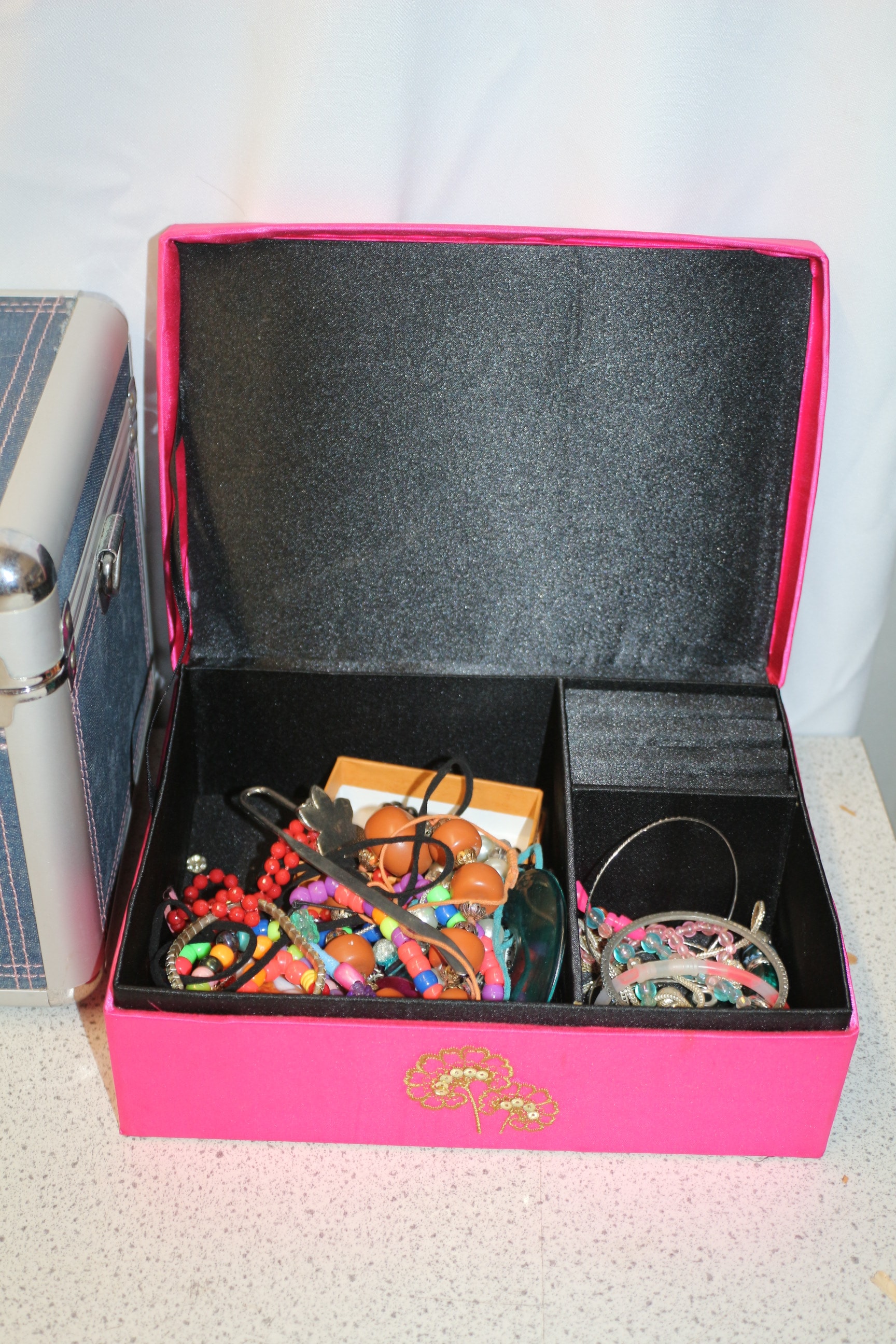 A cream-coloured wooden jewellery box with a floral glass insert on the lid, lined with pink fabric and filled with various pieces of multi-coloured jewellery. Pink Box containing costume jewellery and empty vanity case