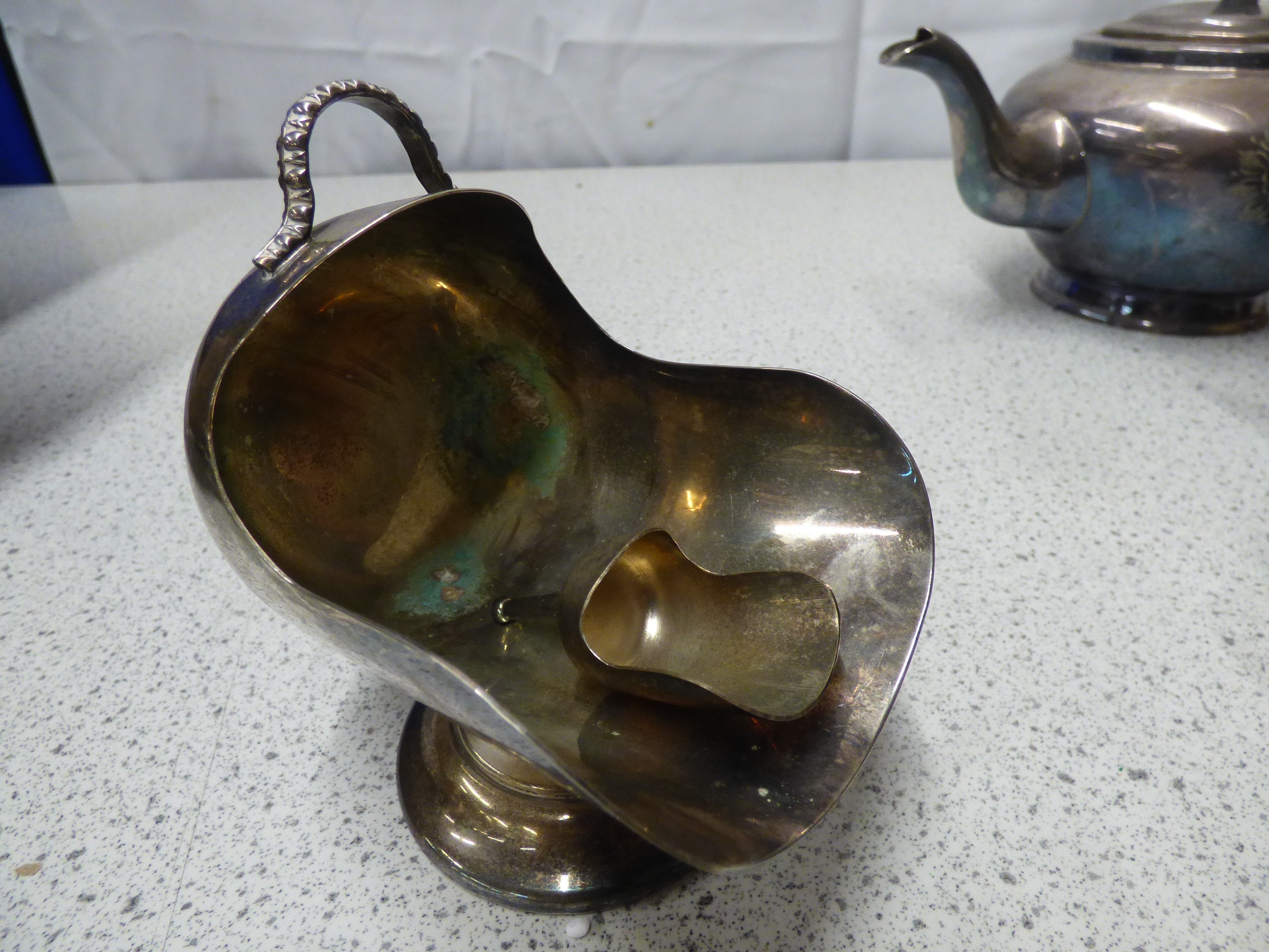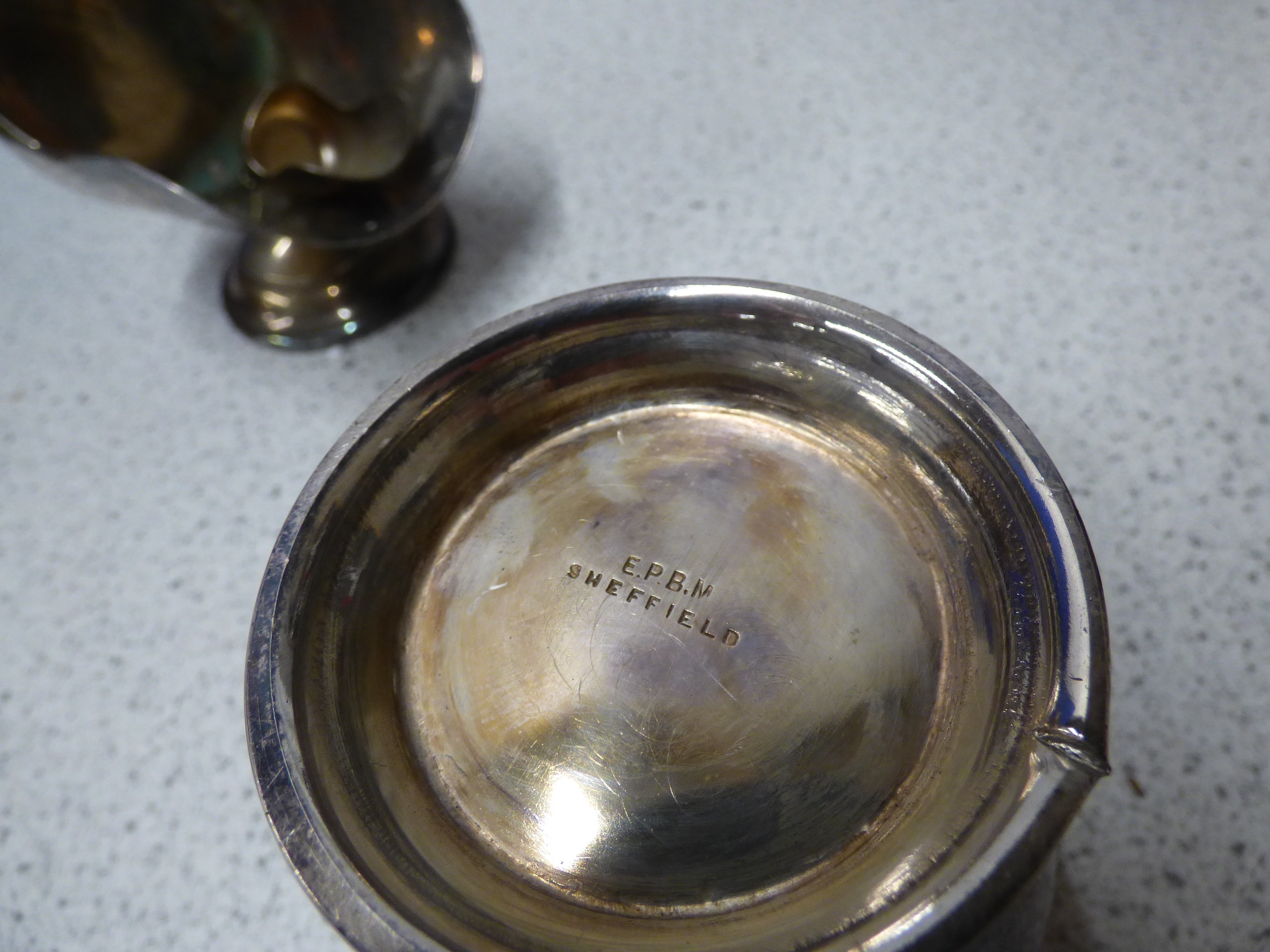 A five-piece silver-coloured tea set, comprising a teapot with black accents, a sugar scuttle, a lidded sugar bowl, a creamer, and a small scoop, with the creamer and sugar bowl bottoms marked “E.P.B.M SHEFFIELD” and the sugar bowl additionally marked “ITALIAN 710”.