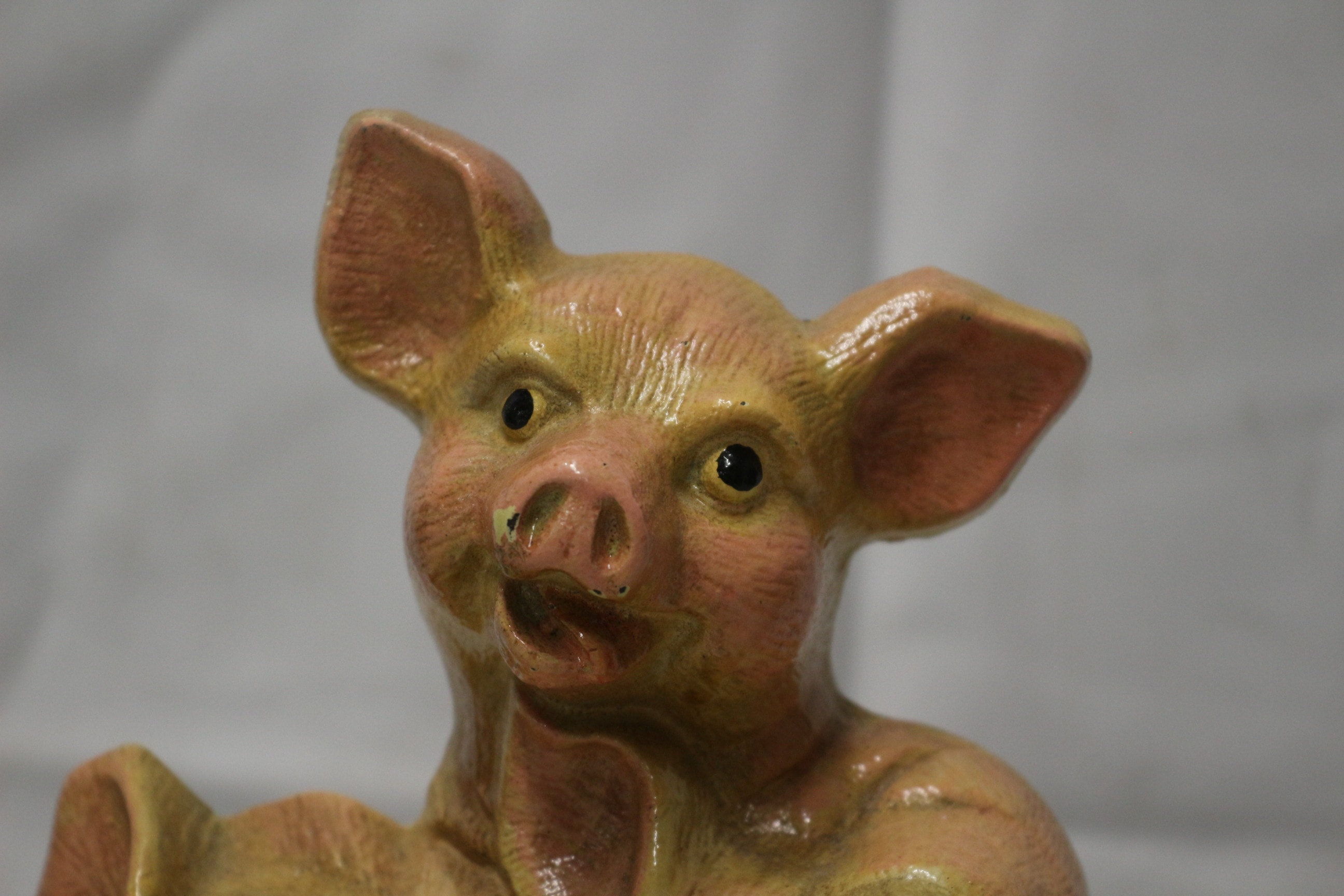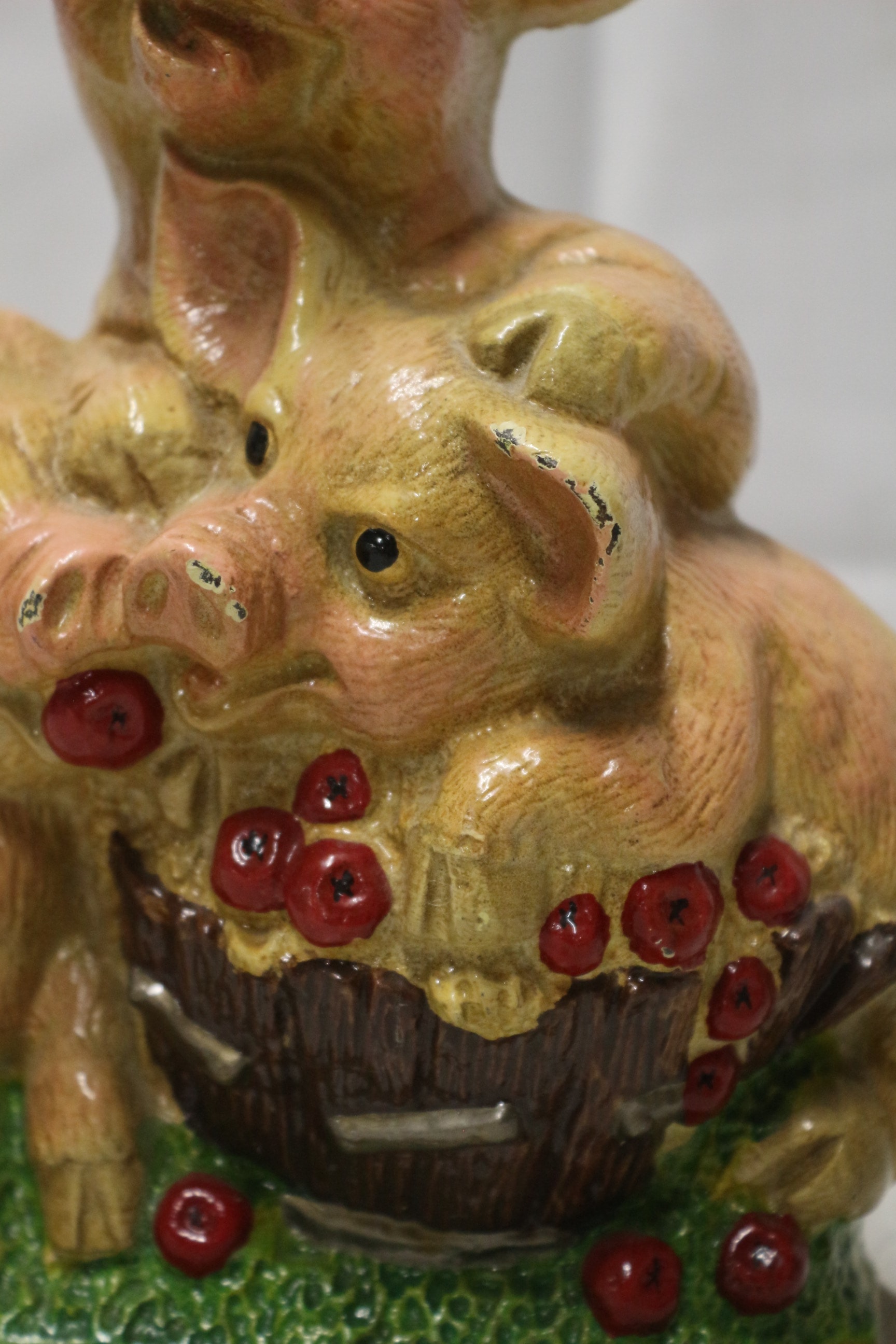 A hand-painted cast iron figurine depicts three pinkish-beige pigs surrounding a brown basket filled with red berries, all set on a green base with gold trim. 23cm tall