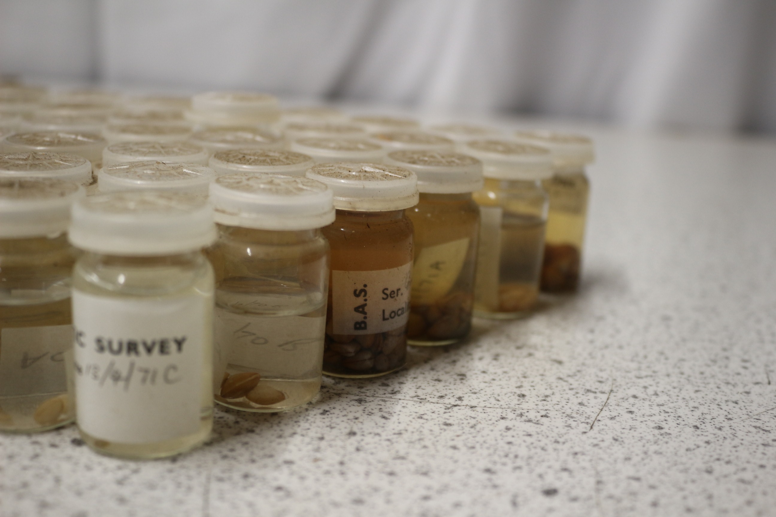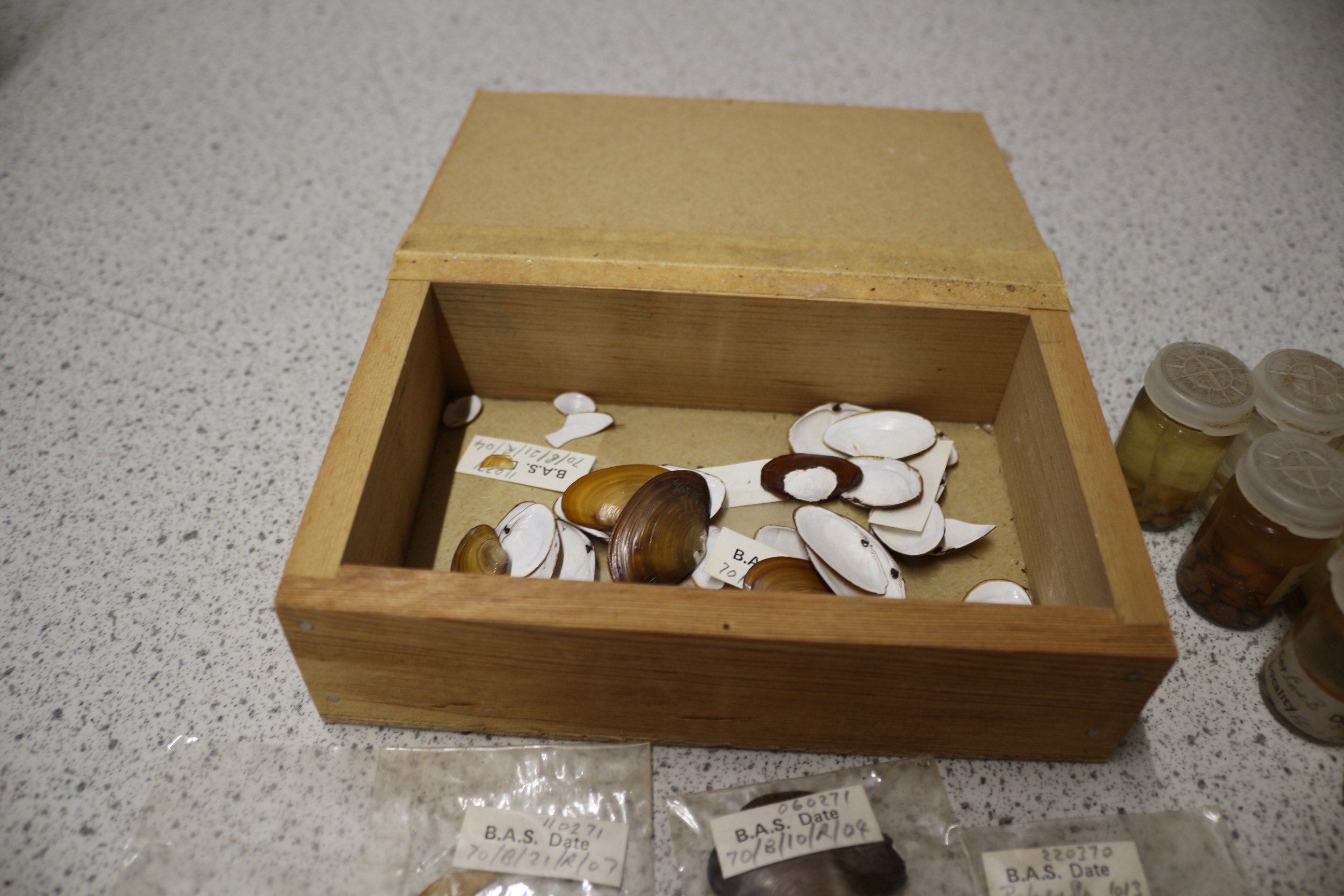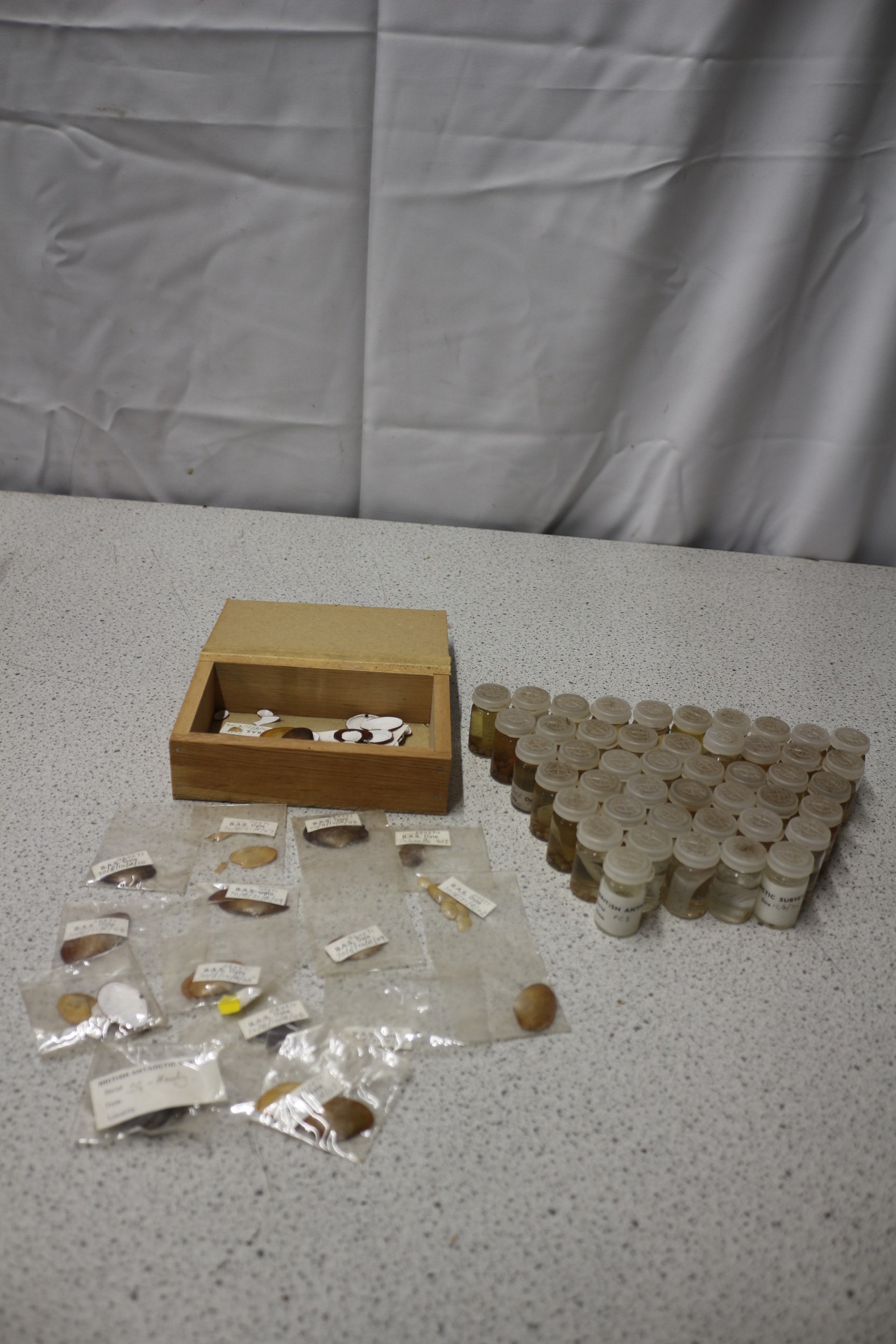 A collection of British Antarctic Survey biological specimens, including shells and granules, in bags, vials, and a wooden box.