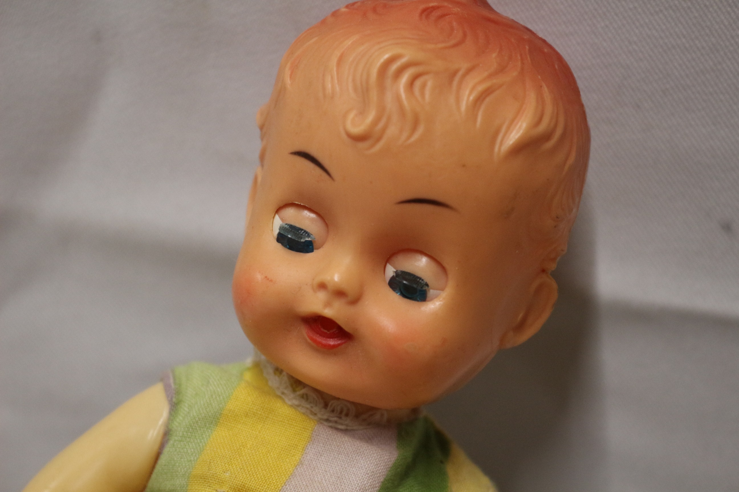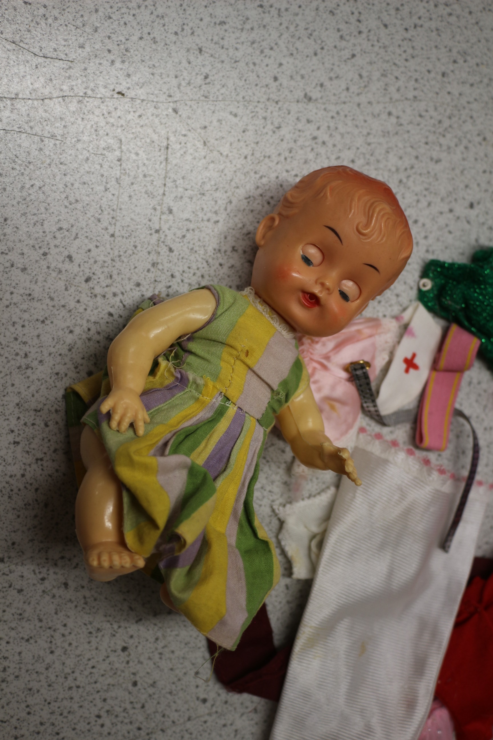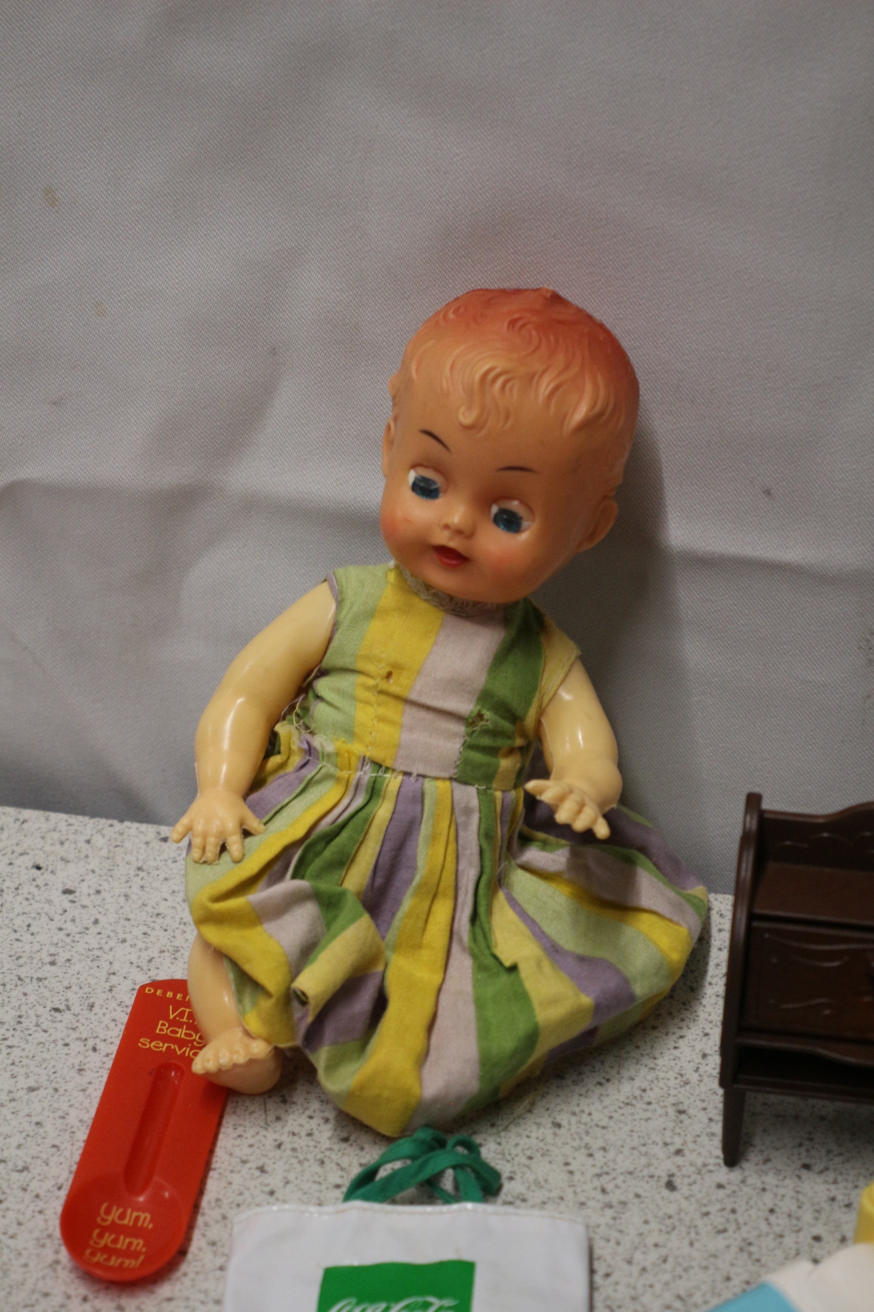 A peach-toned baby doll marked “MADE IN HONG KONG”, “1975”, and “BLUE-BOX” on its back, wearing a green, yellow, and purple striped dress, accompanied by dozens of doll clothes in various colors, and numerous doll furniture pieces and accessories including four beds, a dresser, a vanity, a red couch, a treadmill, a chair, a refrigerator, multiple plates (some with a red heart), a red ‘DEREK’S MILK & BABY SERVICE’ tray, and a white “Coca-Cola” bag.