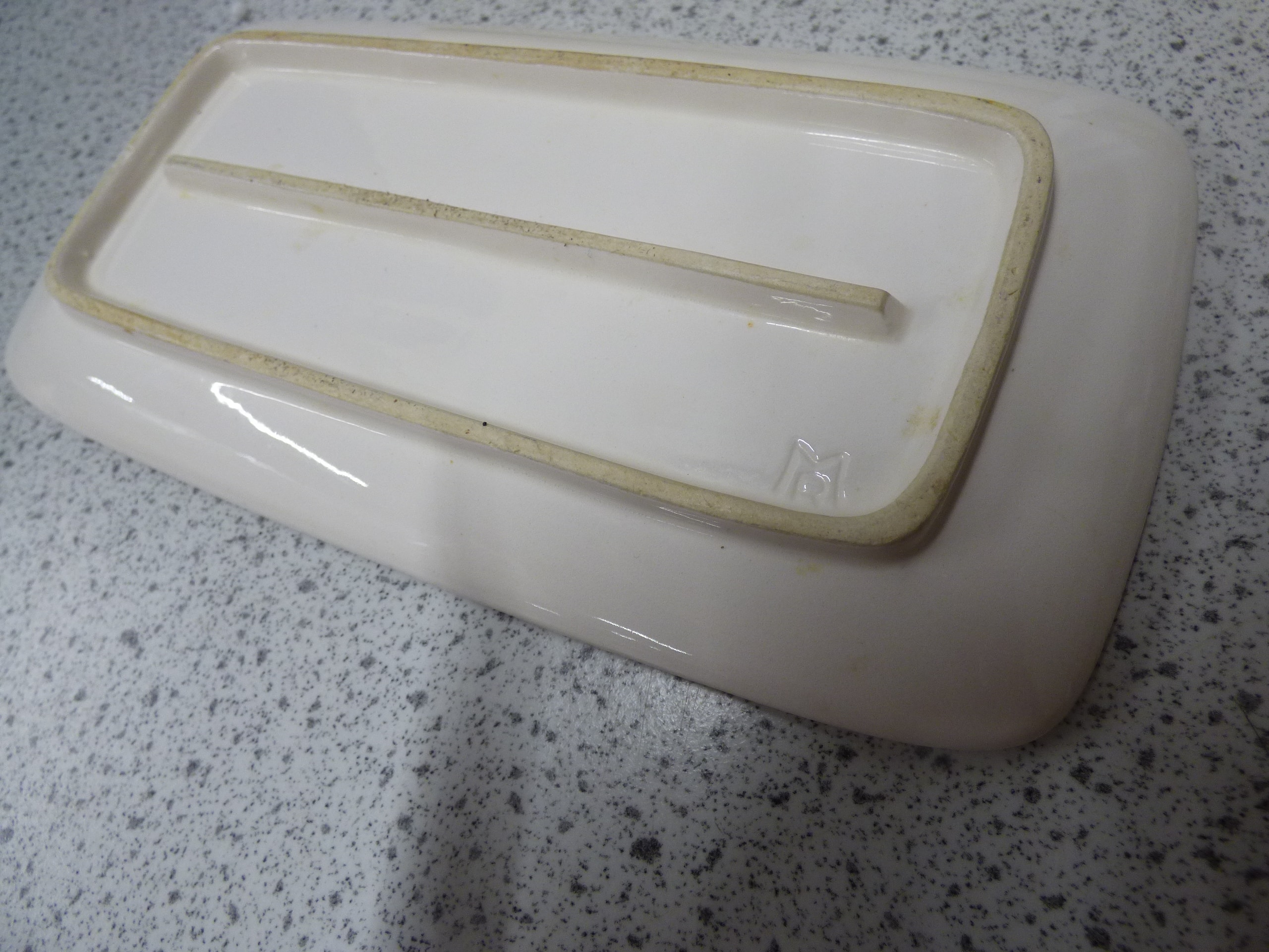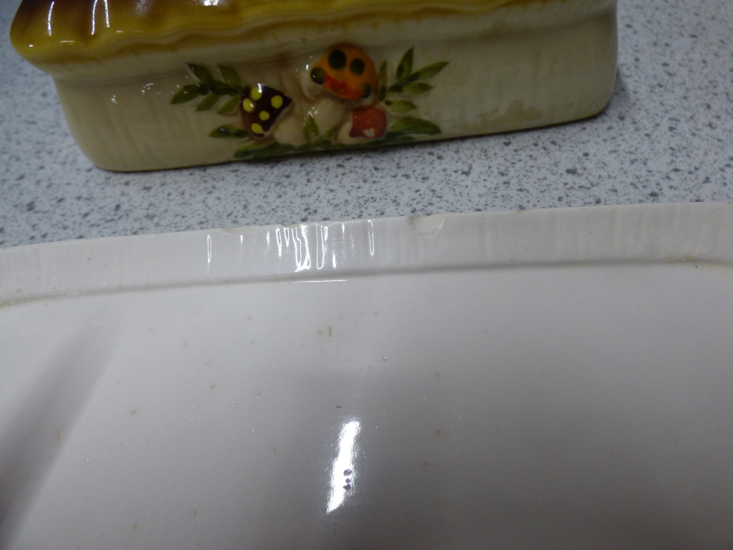 A cream-coloured 70s Sears and Roebuck Merry Mushroom ceramic butter dish with a yellow-brown mushroom-decorated lid and tray, which has a raised “M” mark on its underside, and a brown ceramic hand painted covered casserole dish decorated with white and yellow daisies and green leaves.