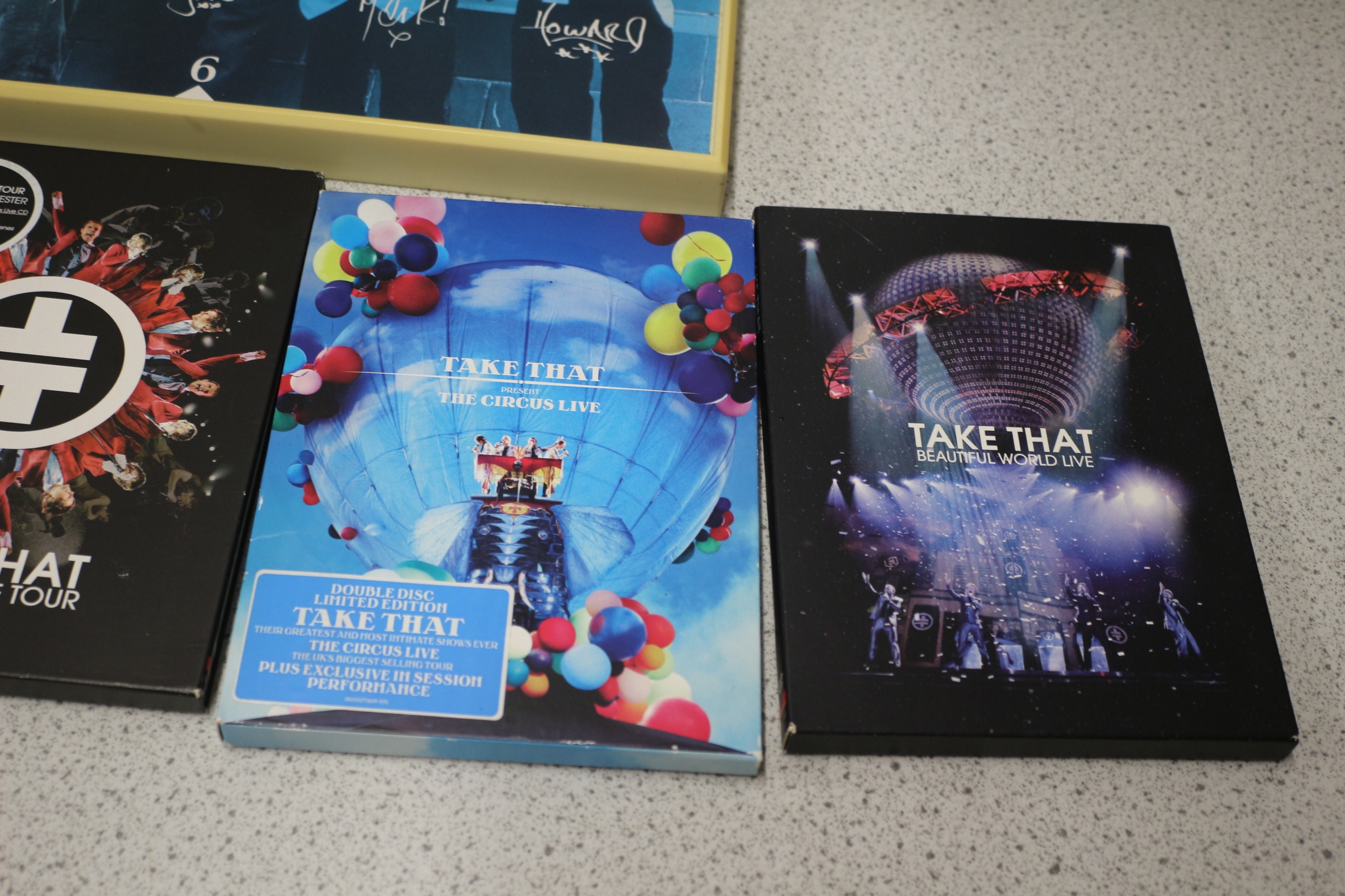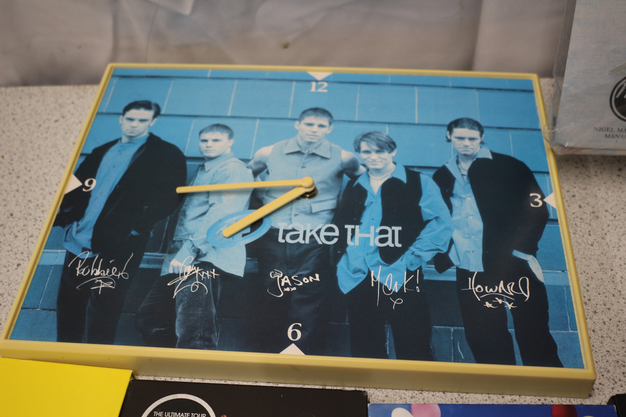 A Take That official merchandise duvet cover and pillowcase set, featuring the band on a cream/beige background with blue, red, and white branding, sold in a white and light blue plastic package labeled “take that”, “OFFICIAL MERCHANDISE”, “NIGEL MARTIN-SMITH MANAGEMENT”, “ZAP ME LTD”, “DUVET COVER AND PILLOWCASE TO FIT SINGLE BED”, “EASYCARE POLYESTER COTTON”, and “100% COTTON”, accompanied by a Take That wall clock and four Take That concert DVD/CD sets.