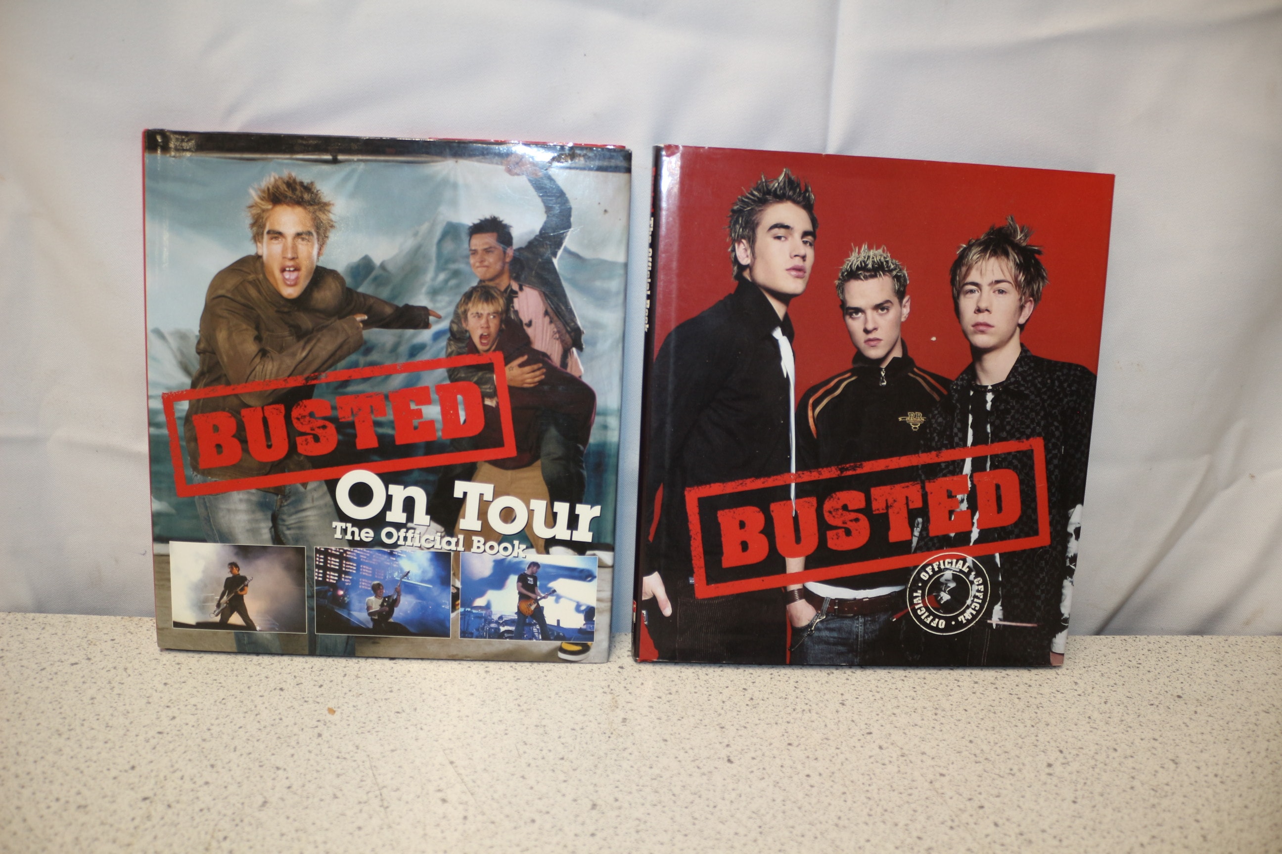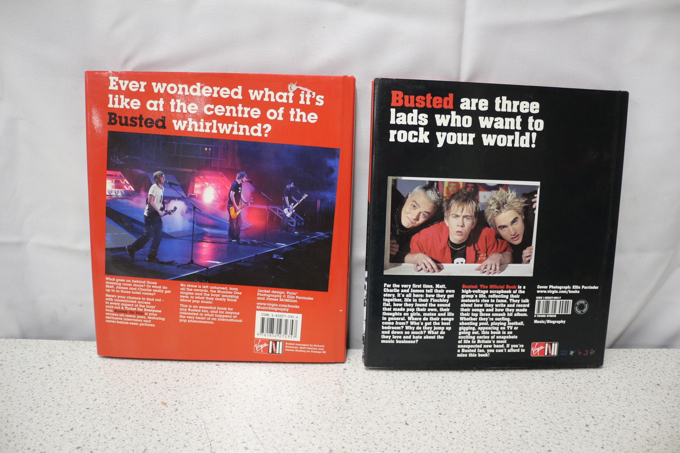Two softcover Busted band books, ‘On Tour The Official Book’ (light blue/brown, ISBN 0-7535-0739-X) and ‘Official Book’ (red/black, ISBN 0-7535-0818-3), both published by Virgin books.