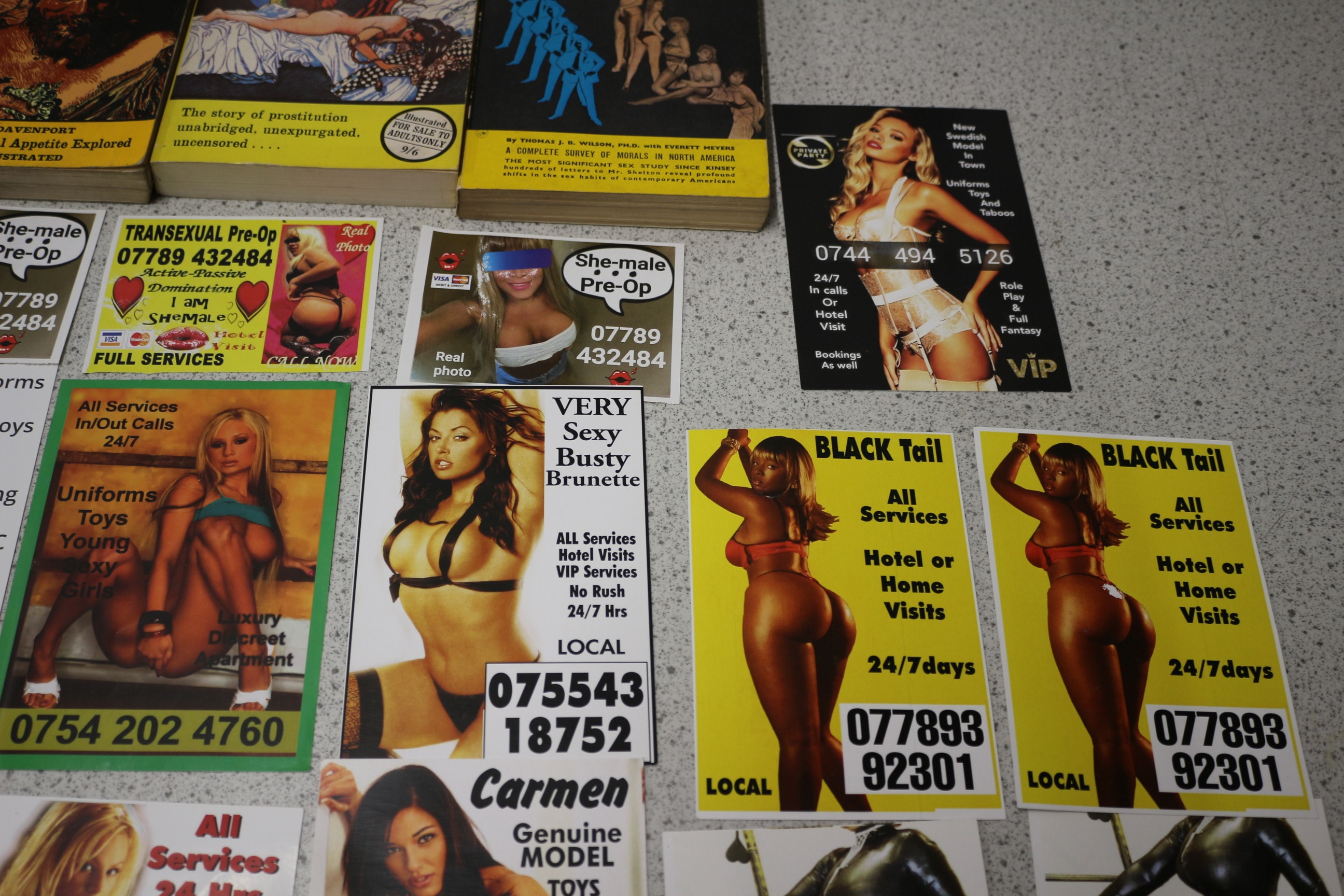 A square pop art glass piece depicting a woman, accompanied by four vintage adult-themed books and a collection of numerous adult services advertisement cards.