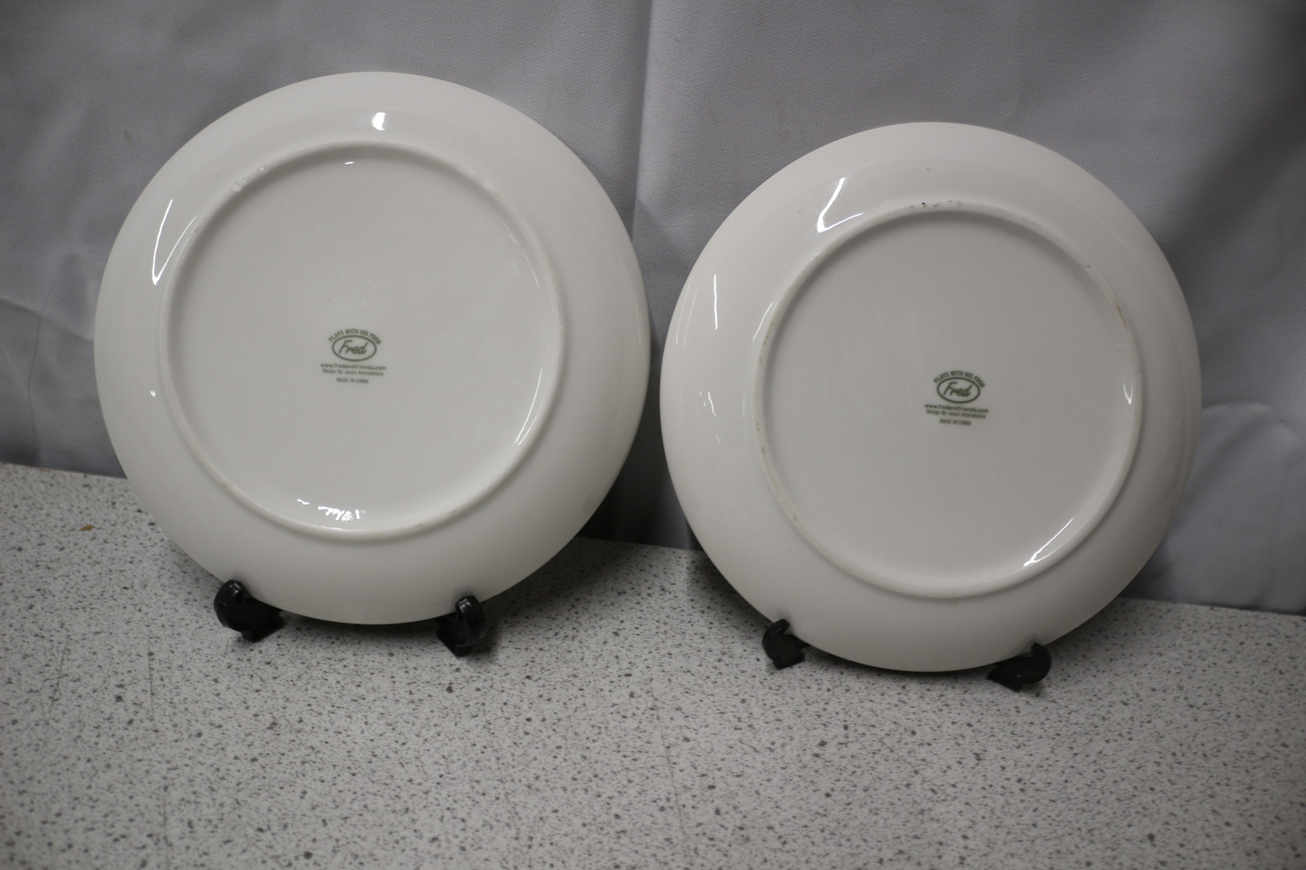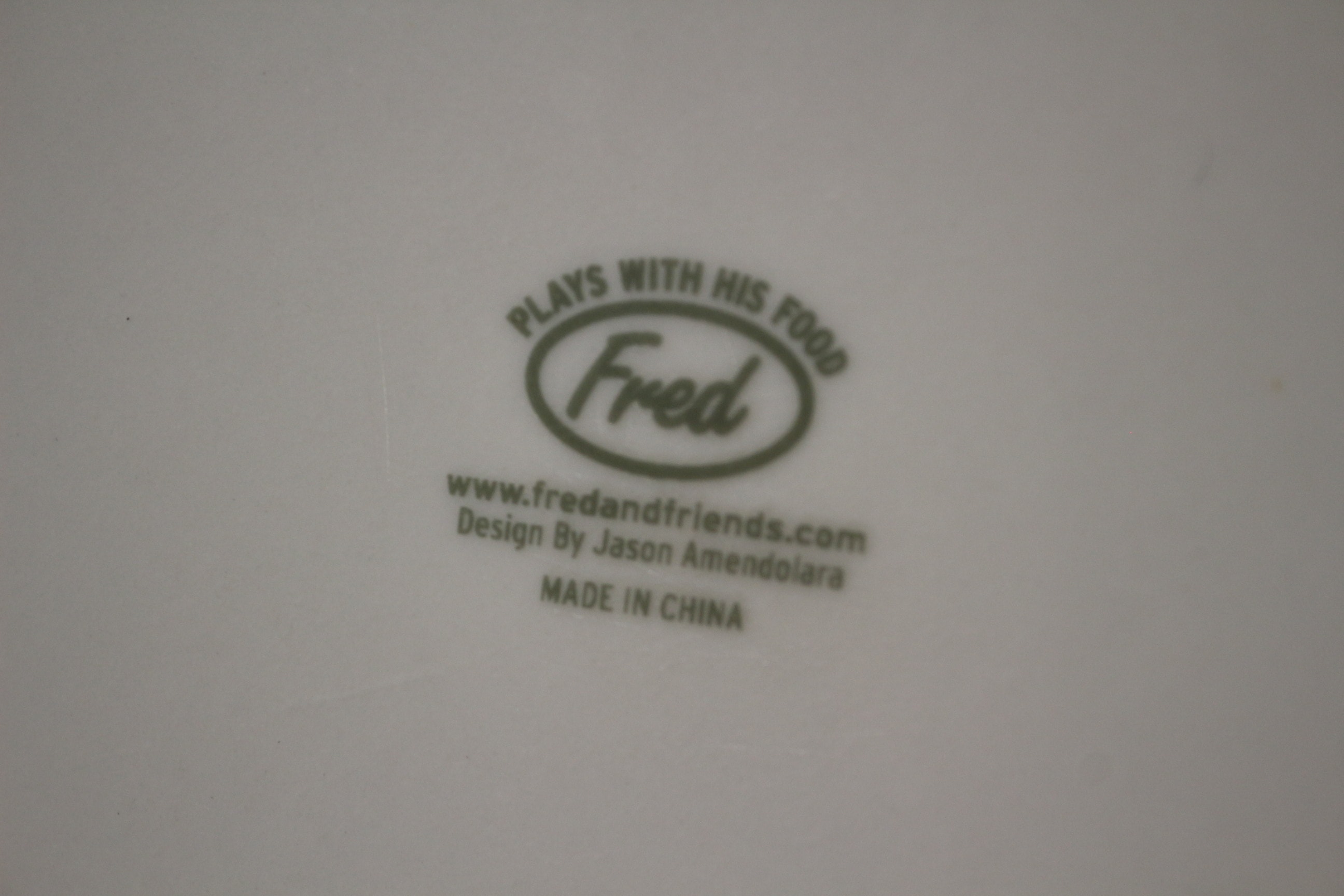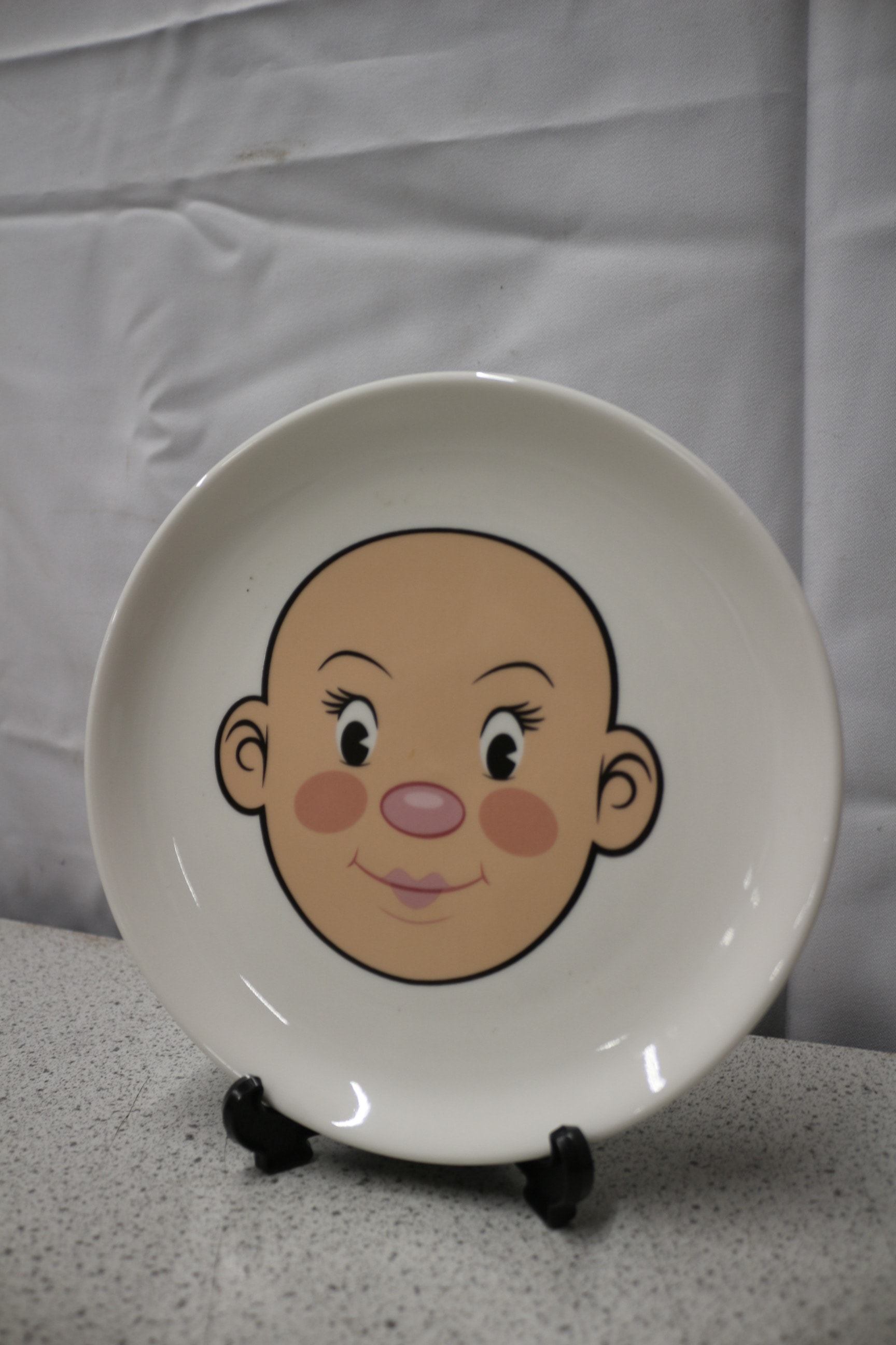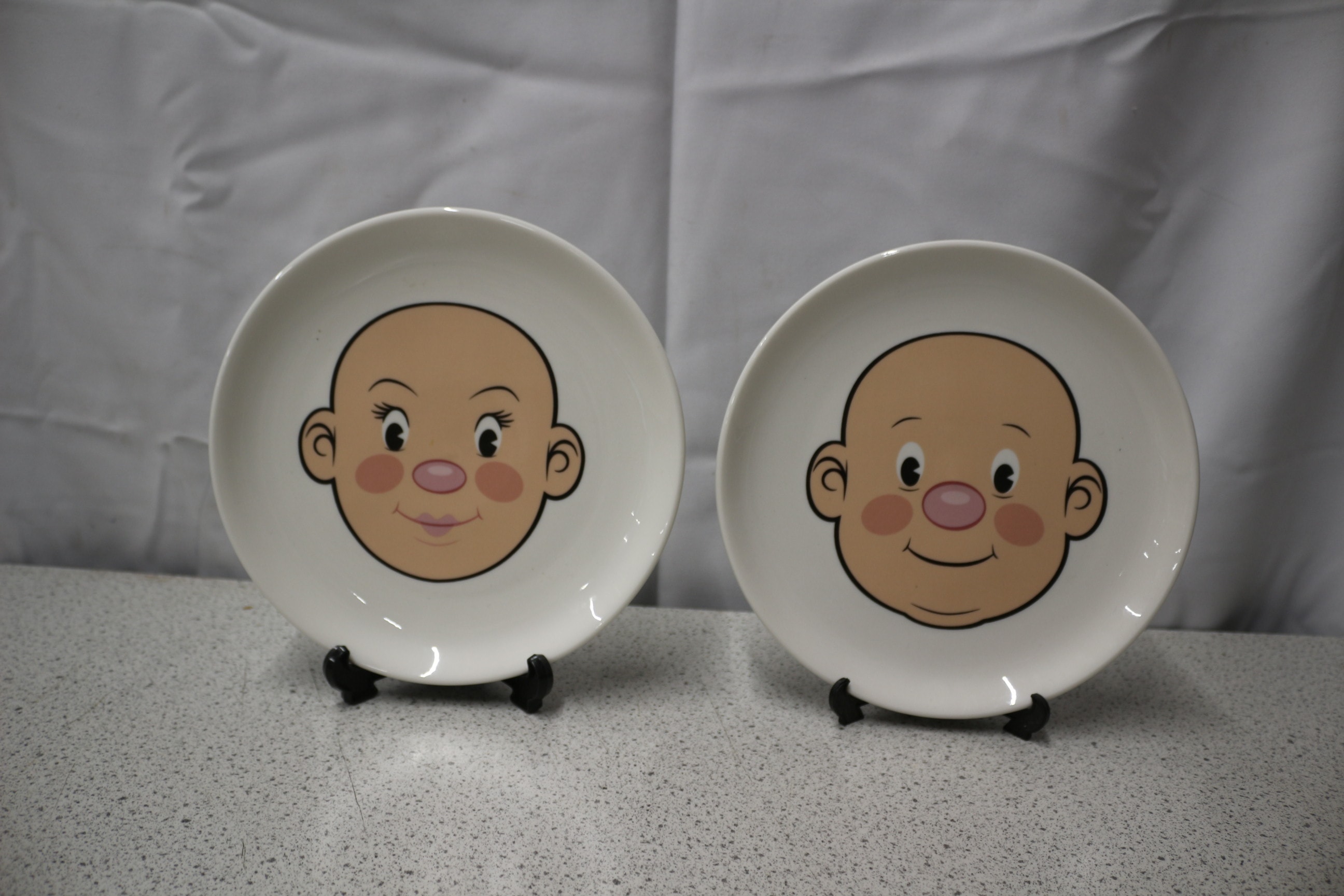 A pair of white ceramic plates featuring cartoon baby faces in beige, pink, and black, marked ‘PLAYS WITH HIS FOOD’ and ‘Fred’ on the reverse.