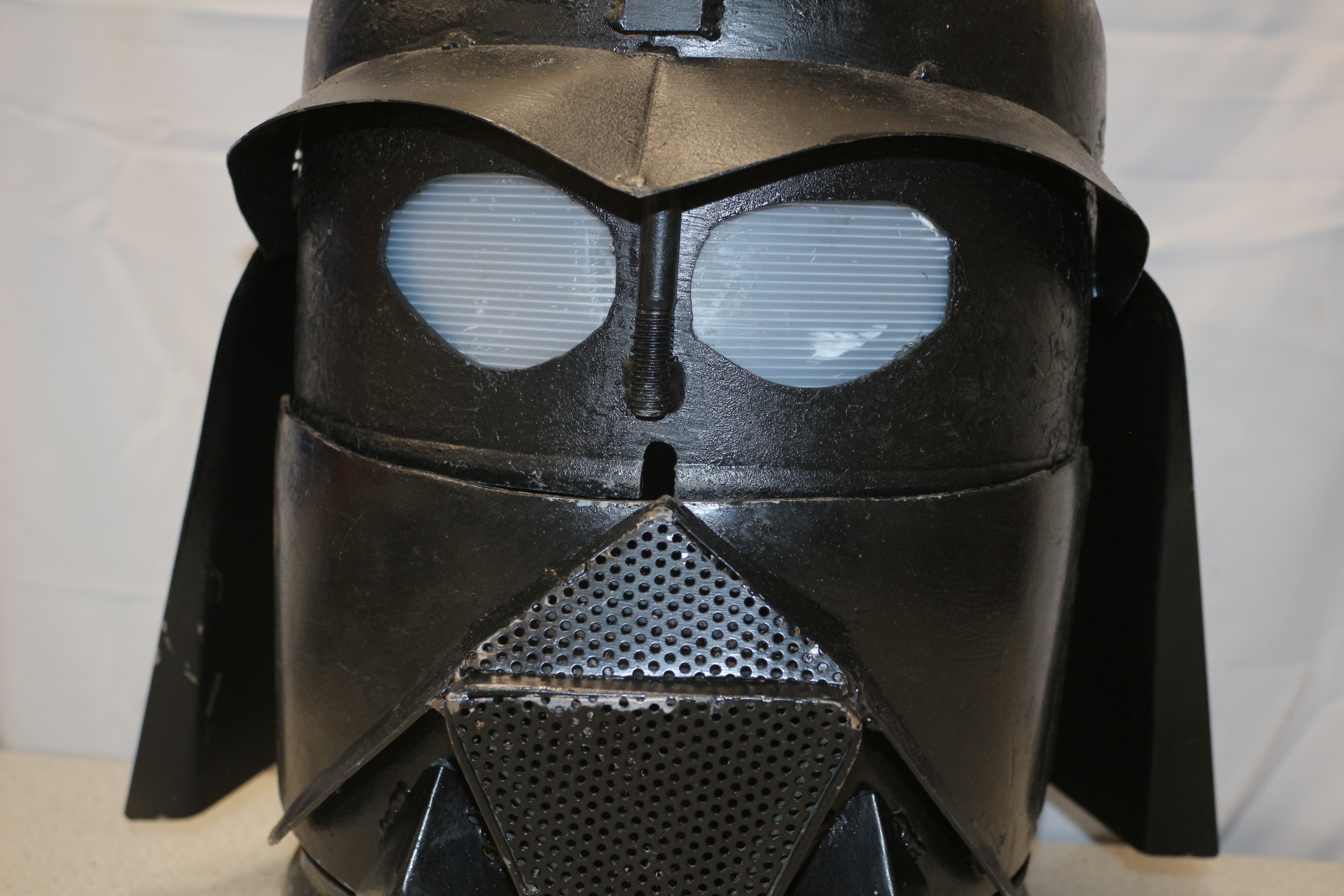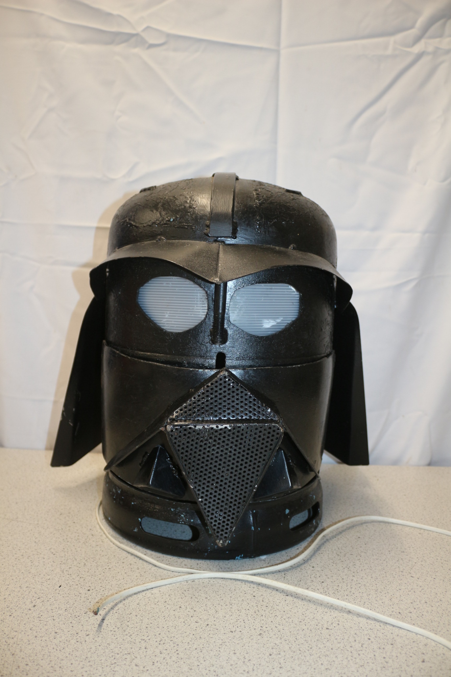 A heavy black metal Darth Vader-style light with perforated mouth grille and white translucent eye lenses, featuring a visible power cord. Untested 45cm Tall