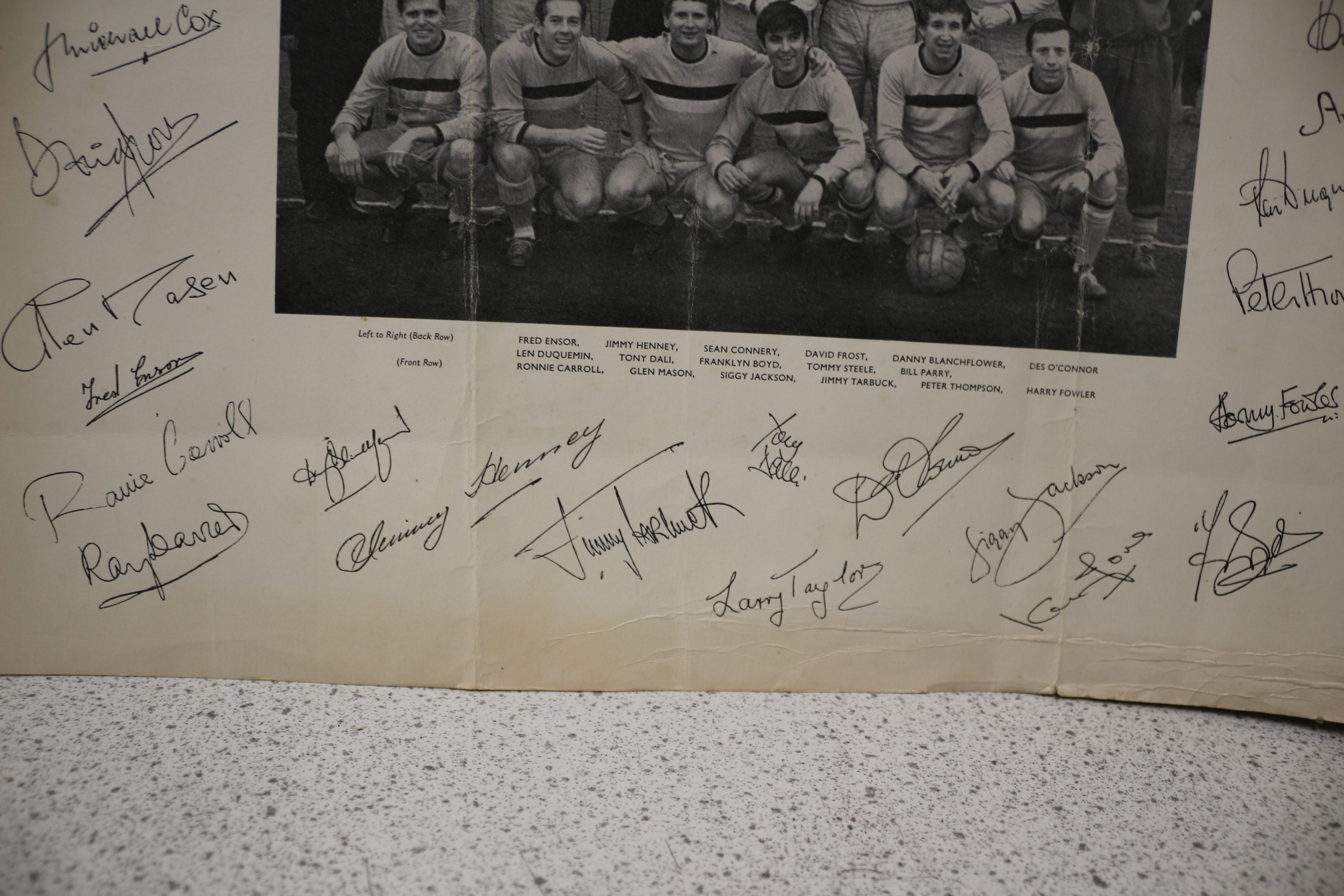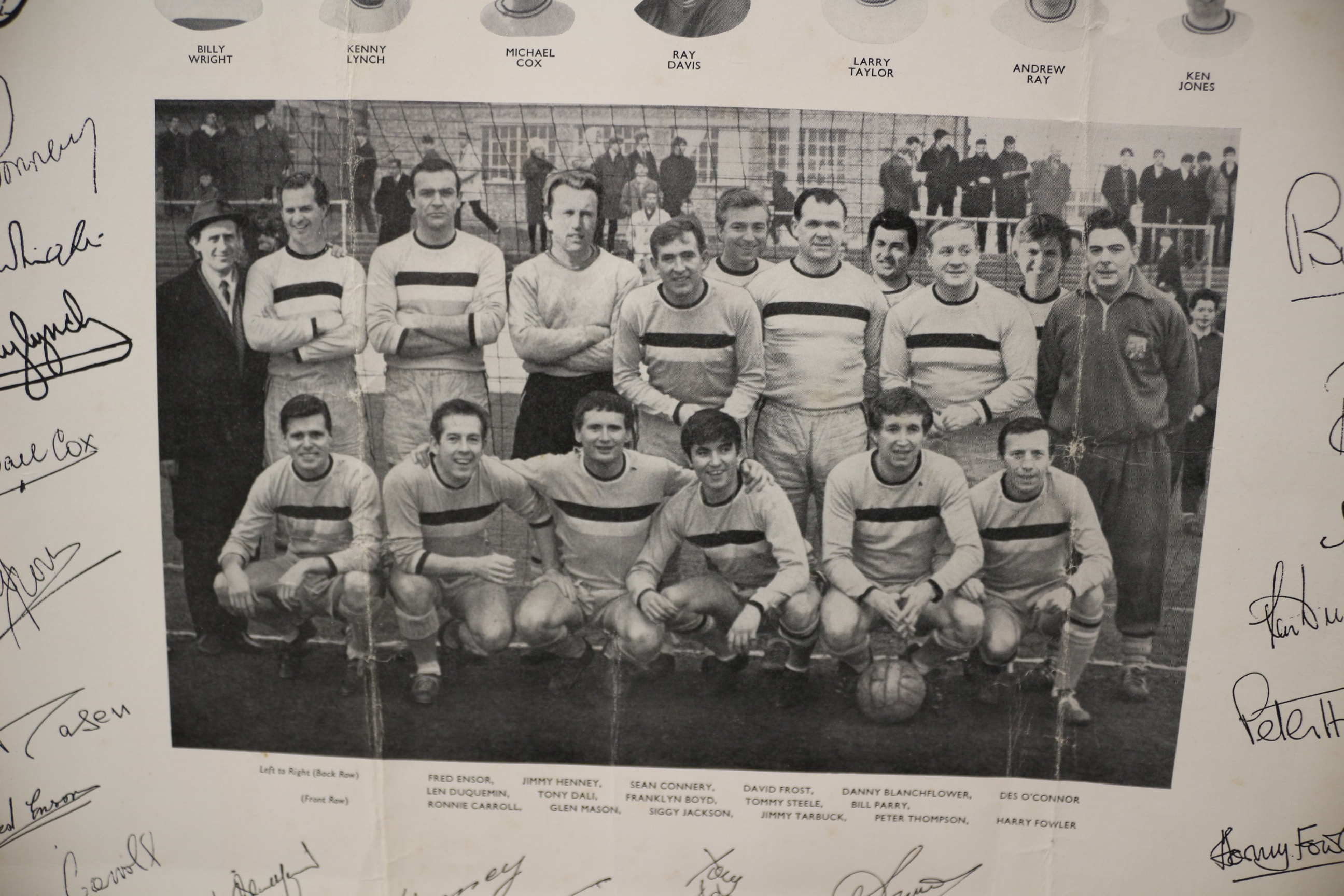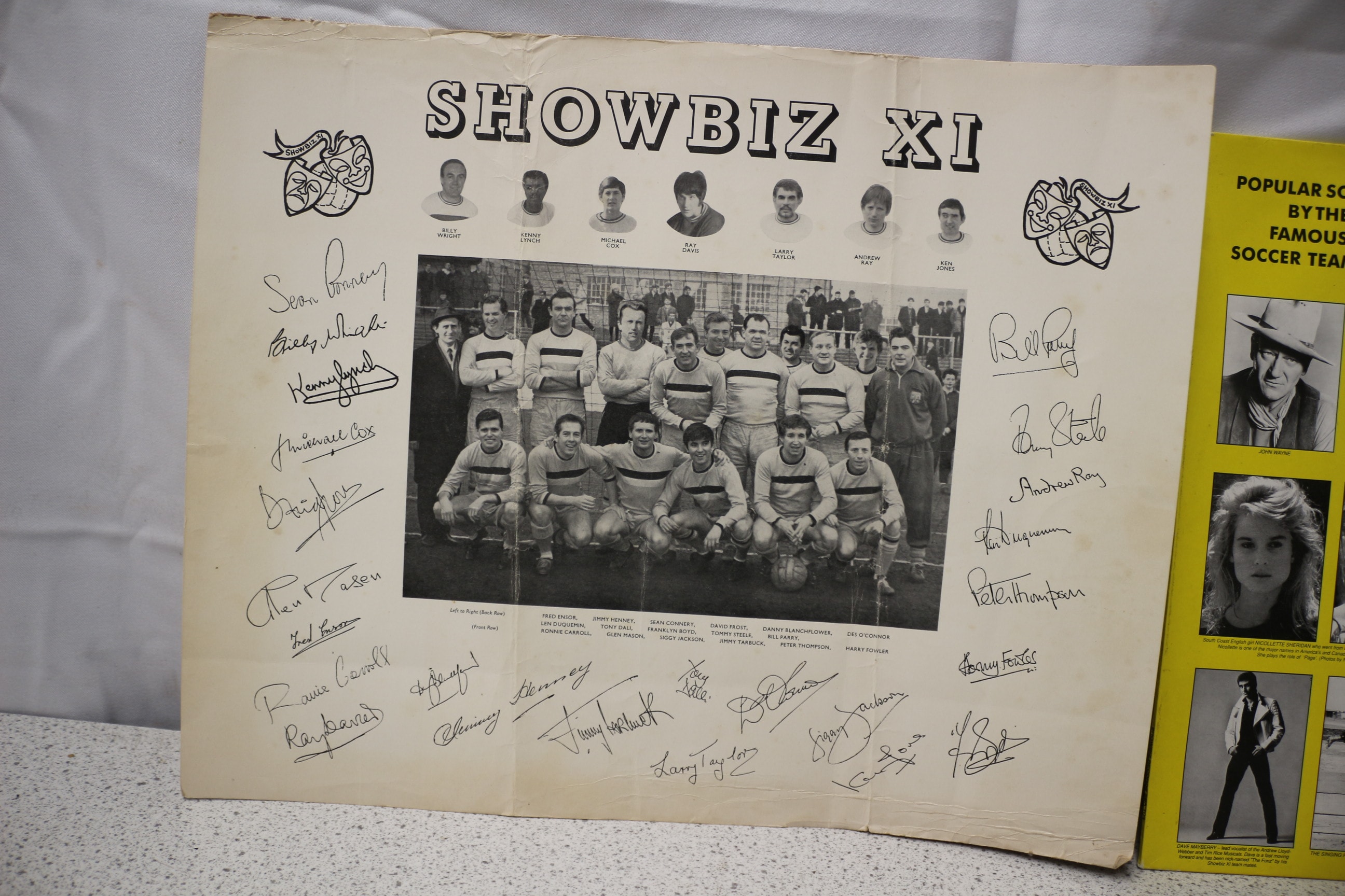 An off-white paper poster featuring a black and white photograph of the “SHOWBIZ XI” soccer team with numerous handwritten signatures including Sean Connery, Kenny Lynch, and Ray Davies, alongside a yellow LP record sleeve titled “POPULAR SONGS & HOLLYWOOD TRIBUTES BY THE FAMOUS SHOWBIZ XI SOCCER TEAM OF THE NINETEEN NINETIES” with the label “SHOWBIZ RECORDS SBX 104” and “L.P. NO. 2.”