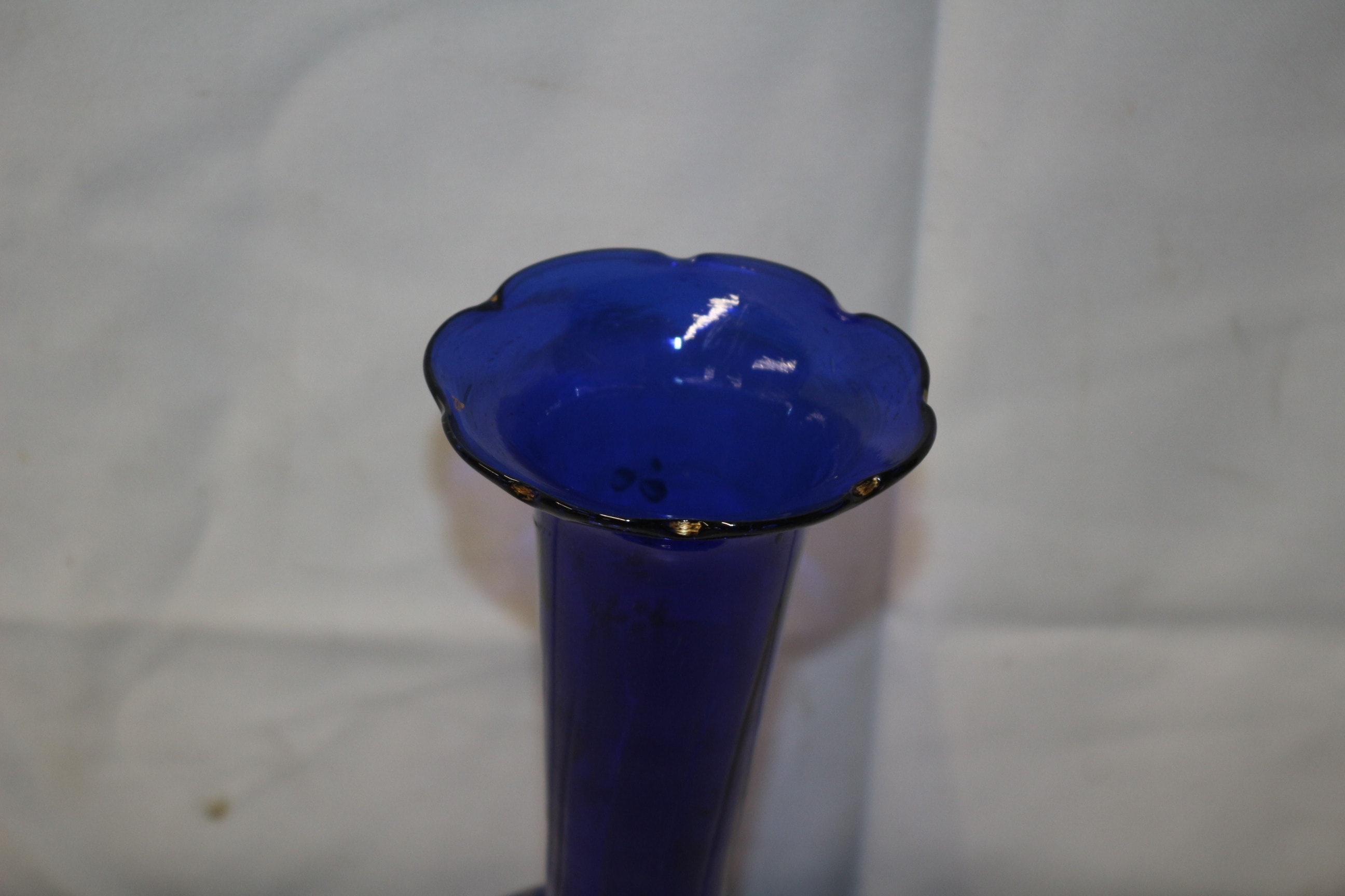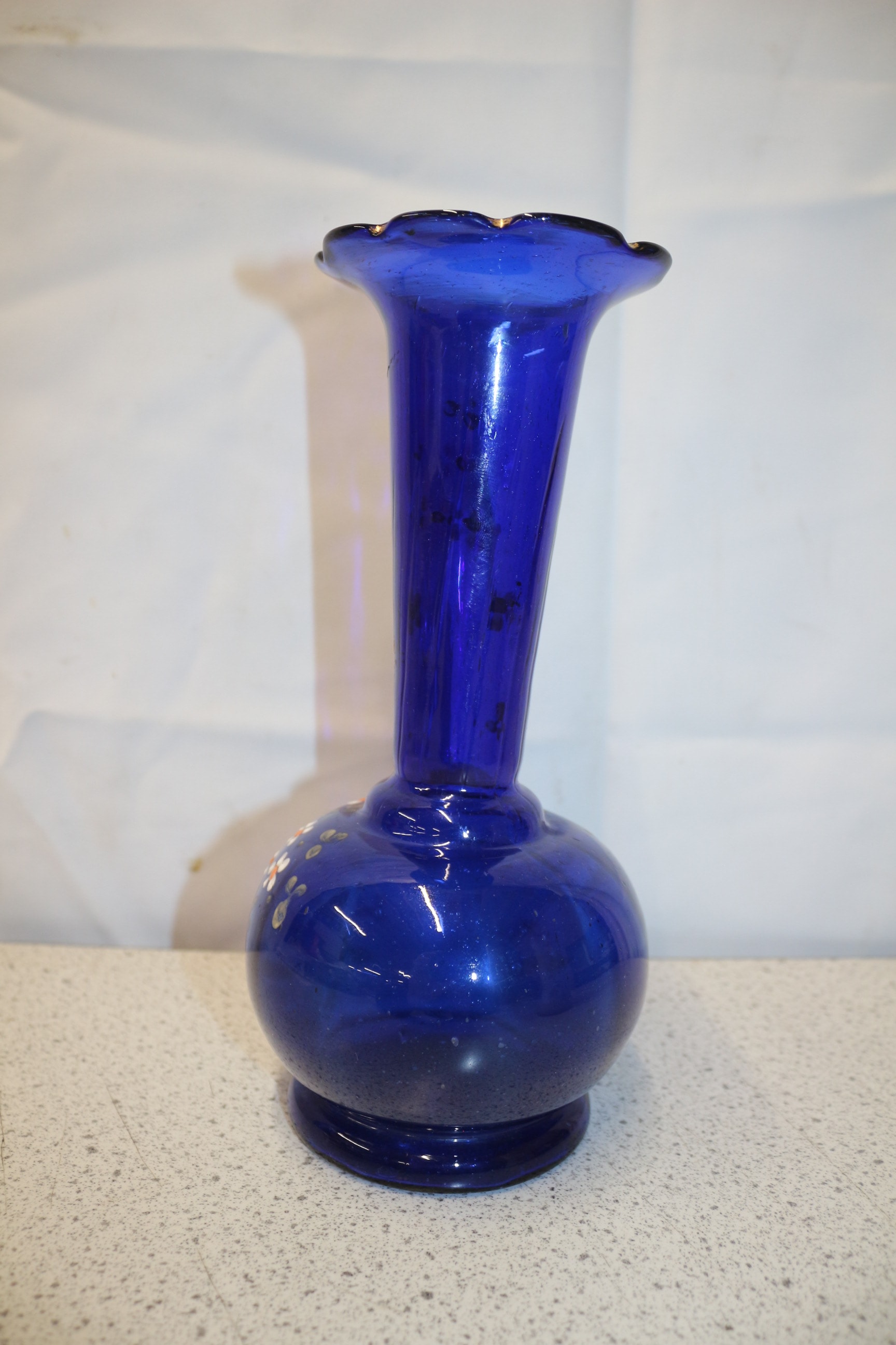 A Bristol blue glass vase, decorated with white and orange flowers and light blue leaves, consistent with Victorian hand-blown enamel decoration. 24cm tall
