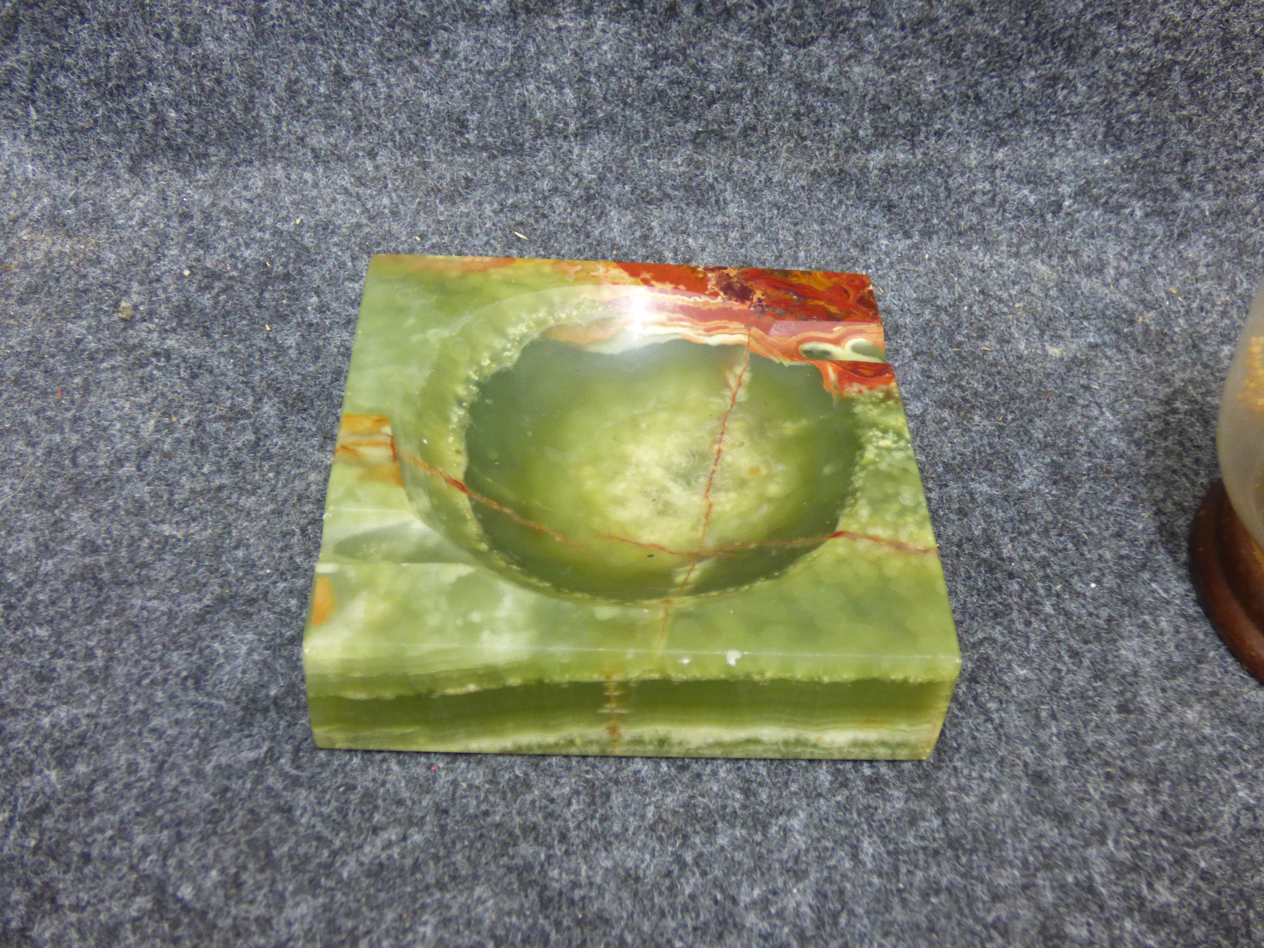 A collection of two ashtrays including a square green and reddish-brown stone example and a round clear one featuring embedded yellow faux flowers on a wooden base.