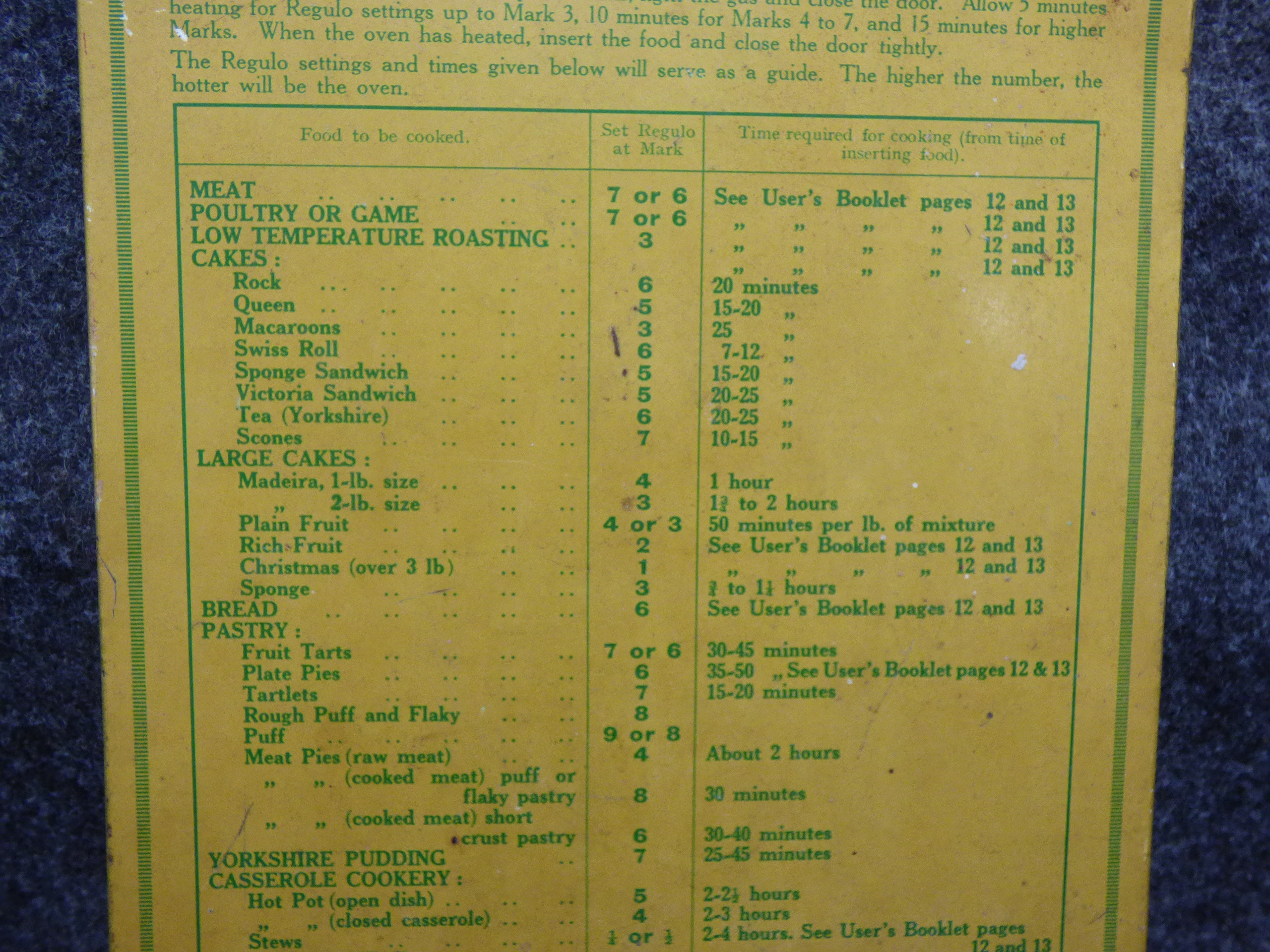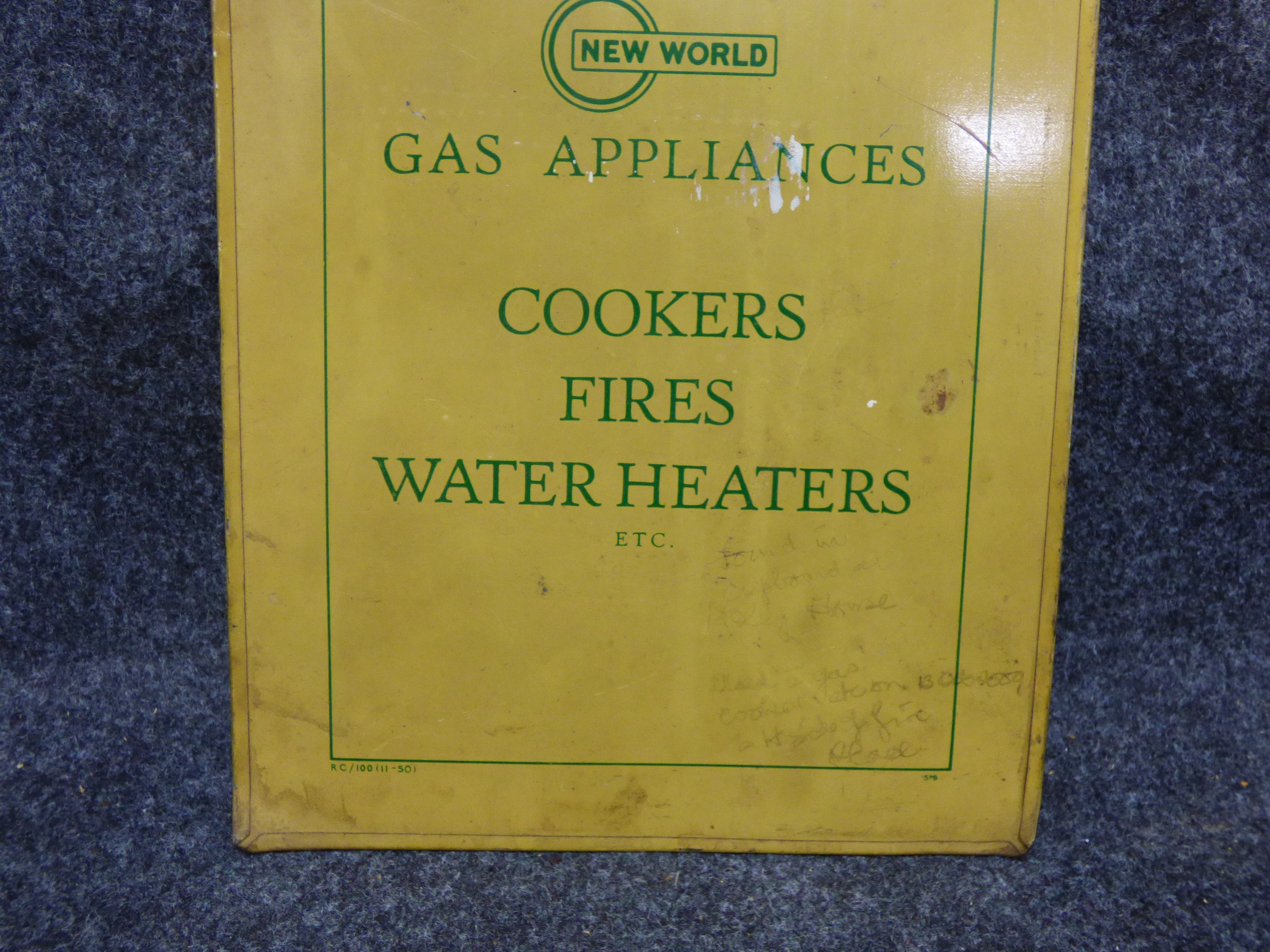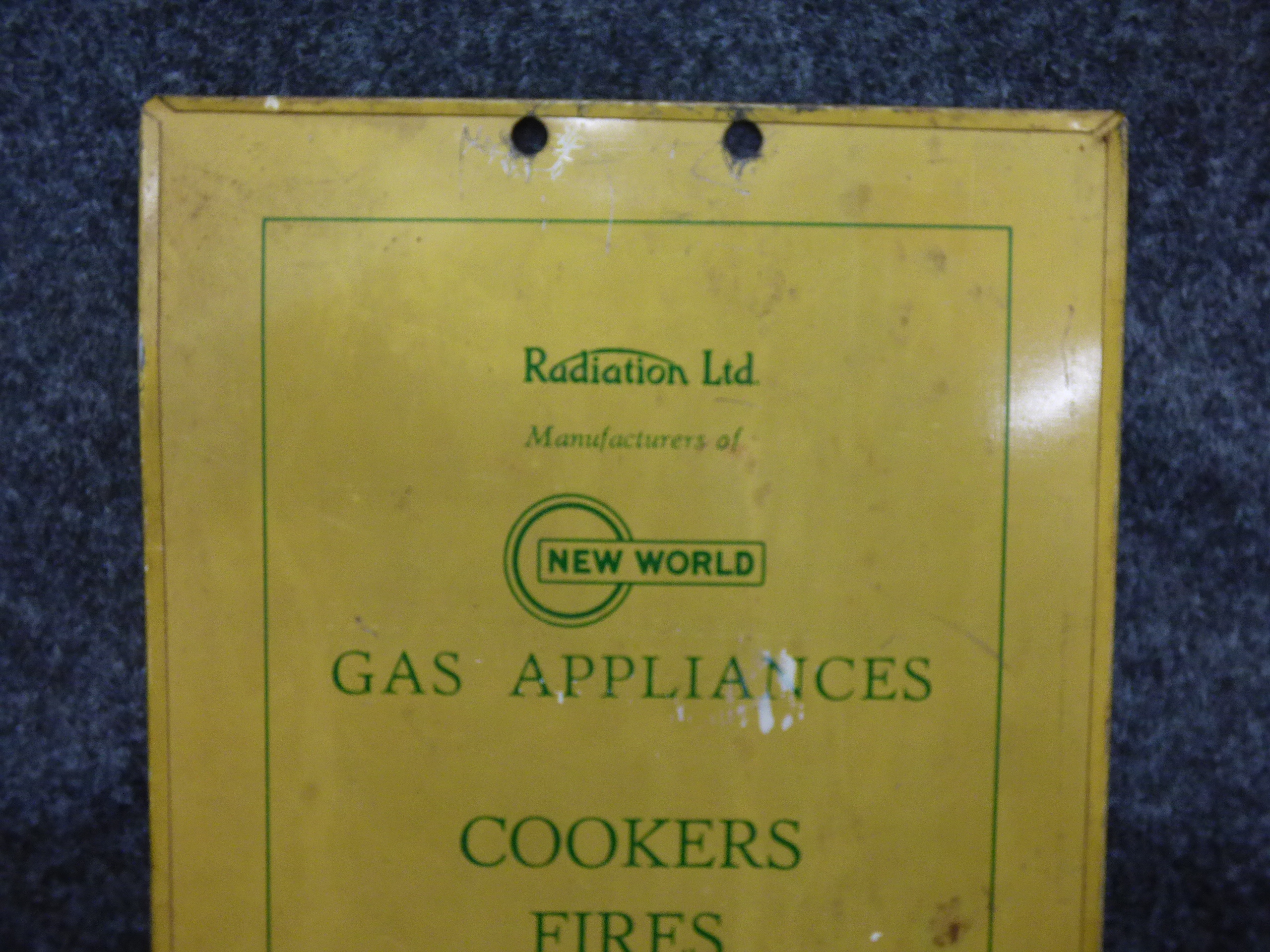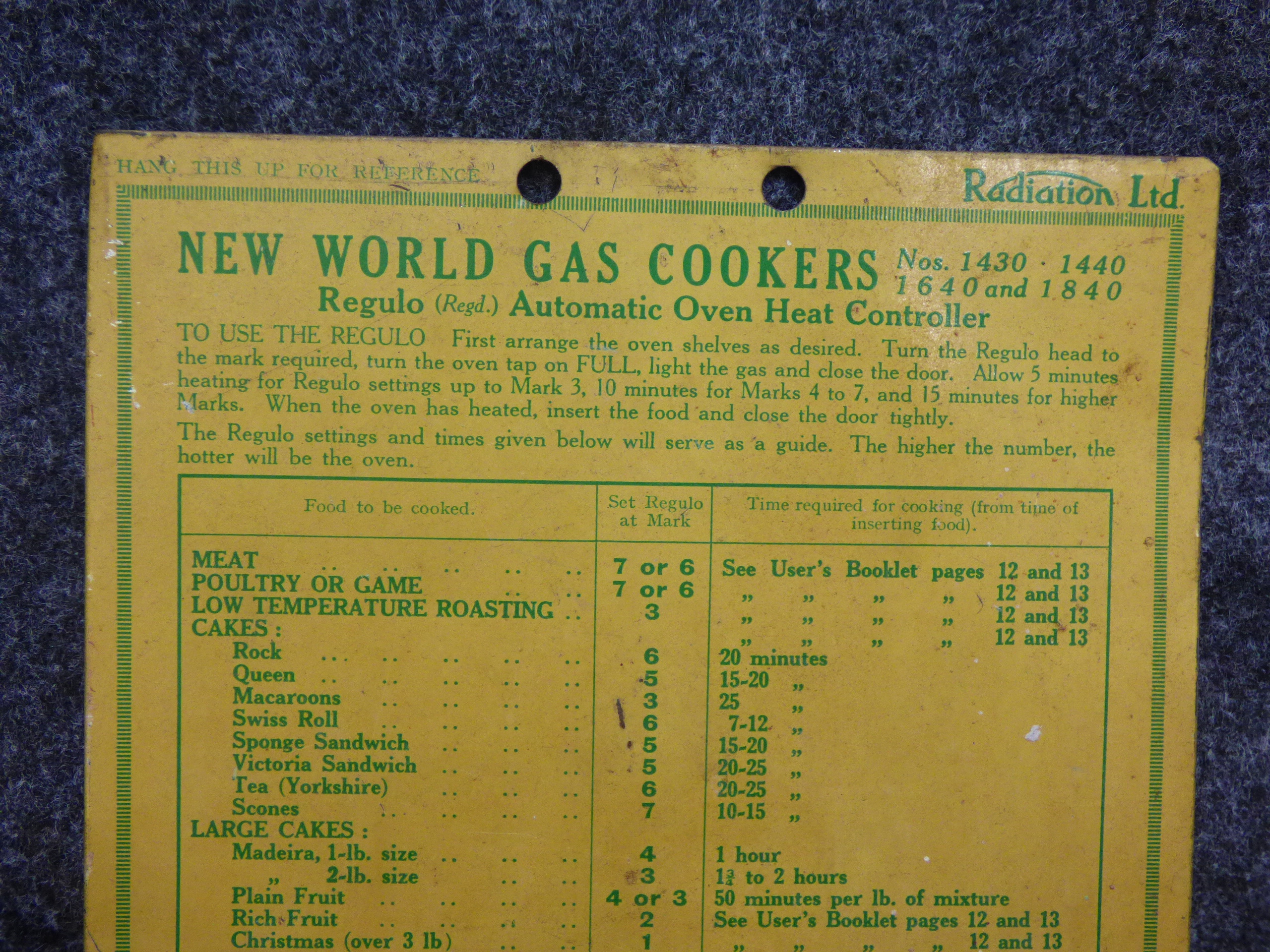 A double-sided yellow and green metal instruction plate for New World Gas Cookers models 1430, 1440, 1640, and 1840, featuring a Regulo automatic oven heat controller cooking chart and appliance advertising.