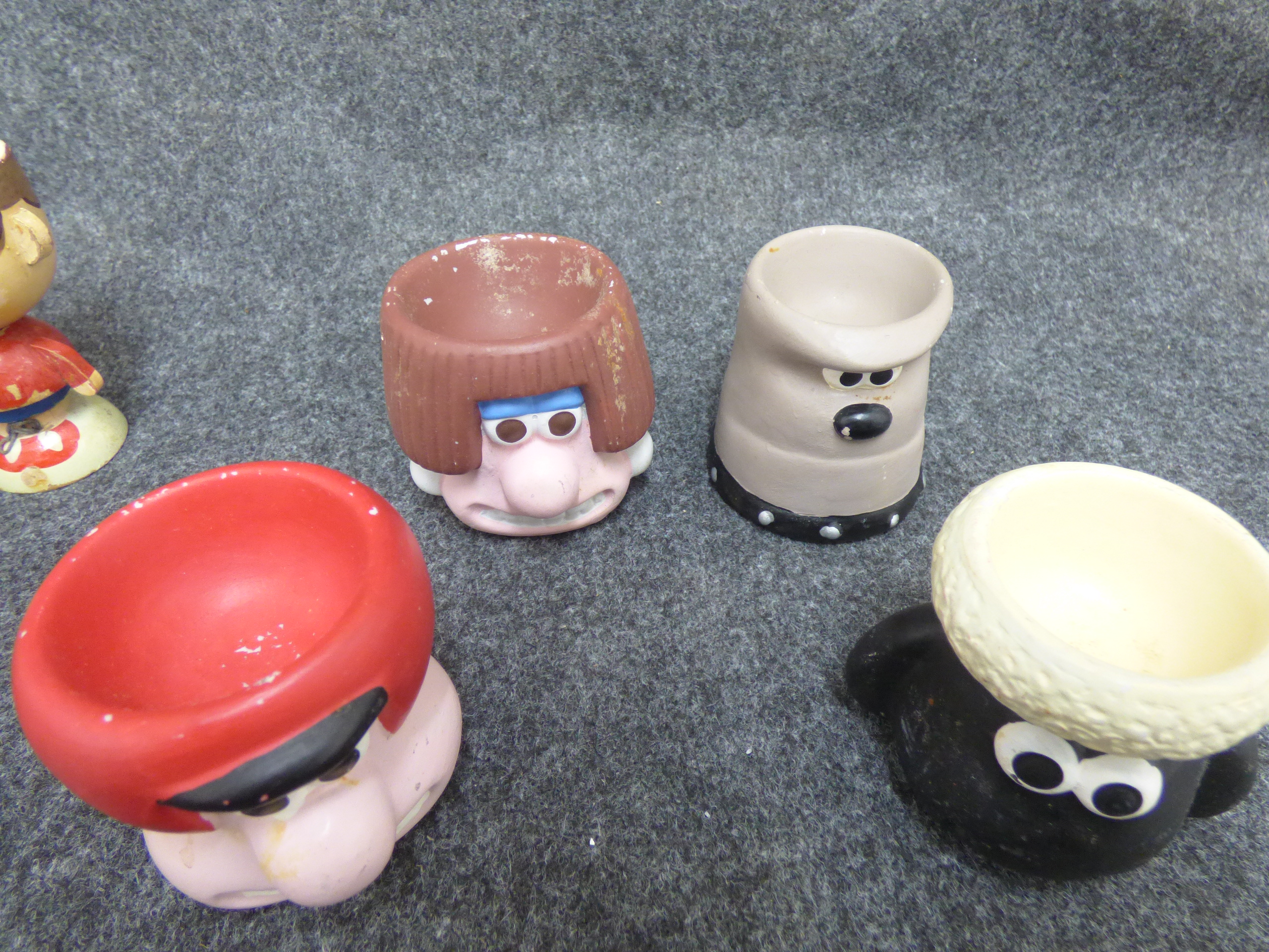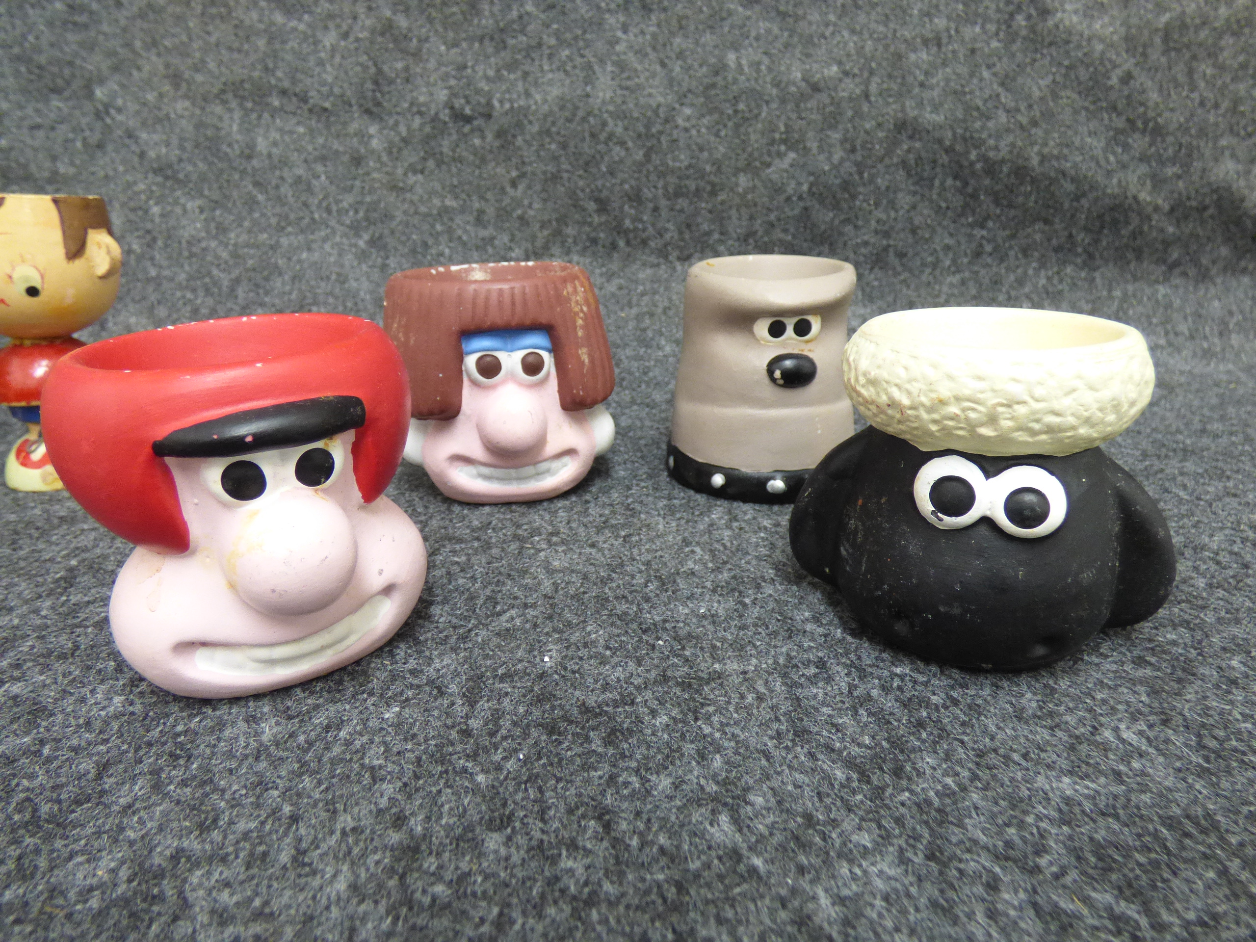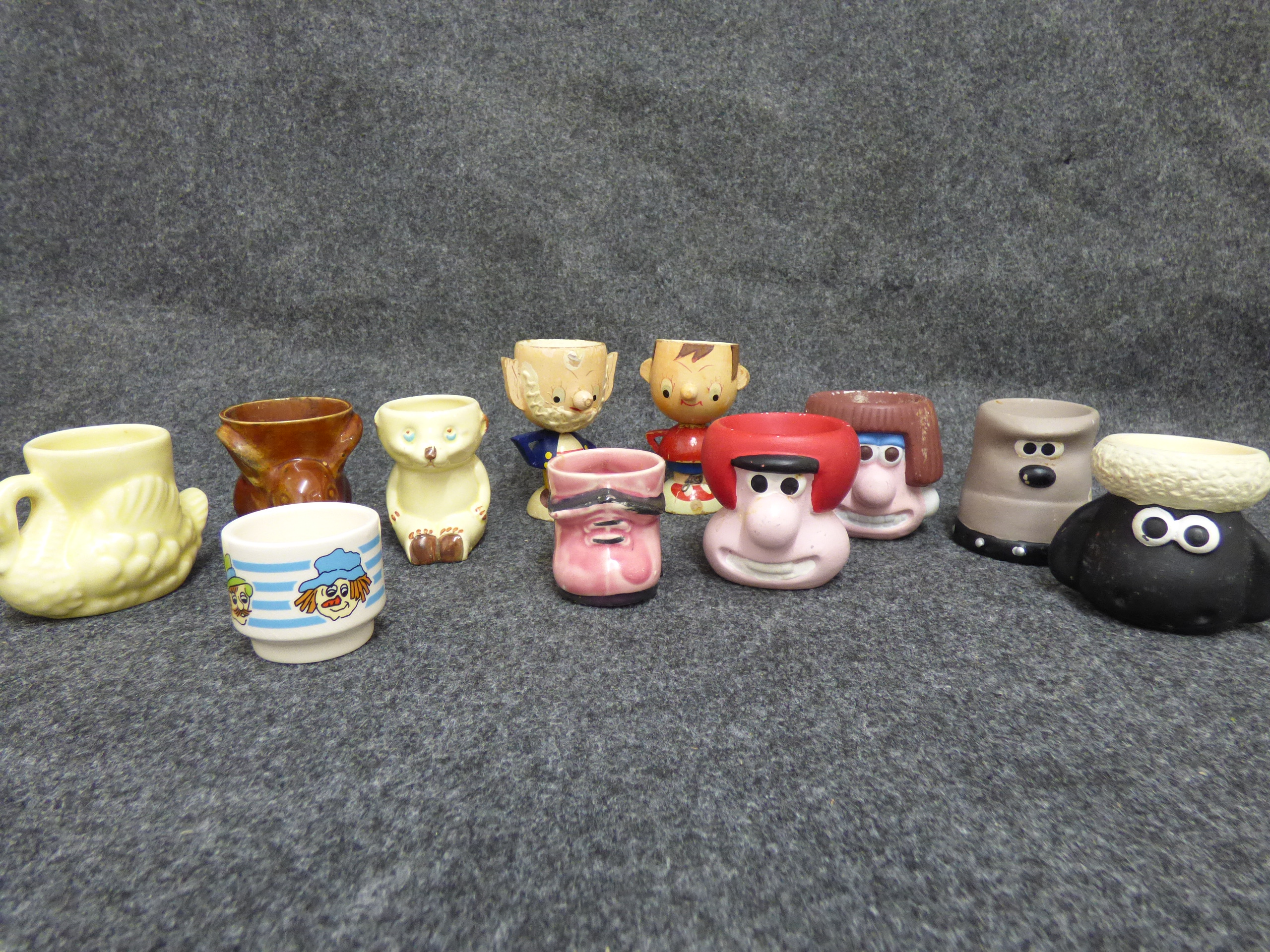 A collection of 11 ceramic and wooden novelty egg cups featuring Wallace and Gromit and Noddy characters, animals, and figures with marks for Hornsea, Beswick, and Art Pottery England.