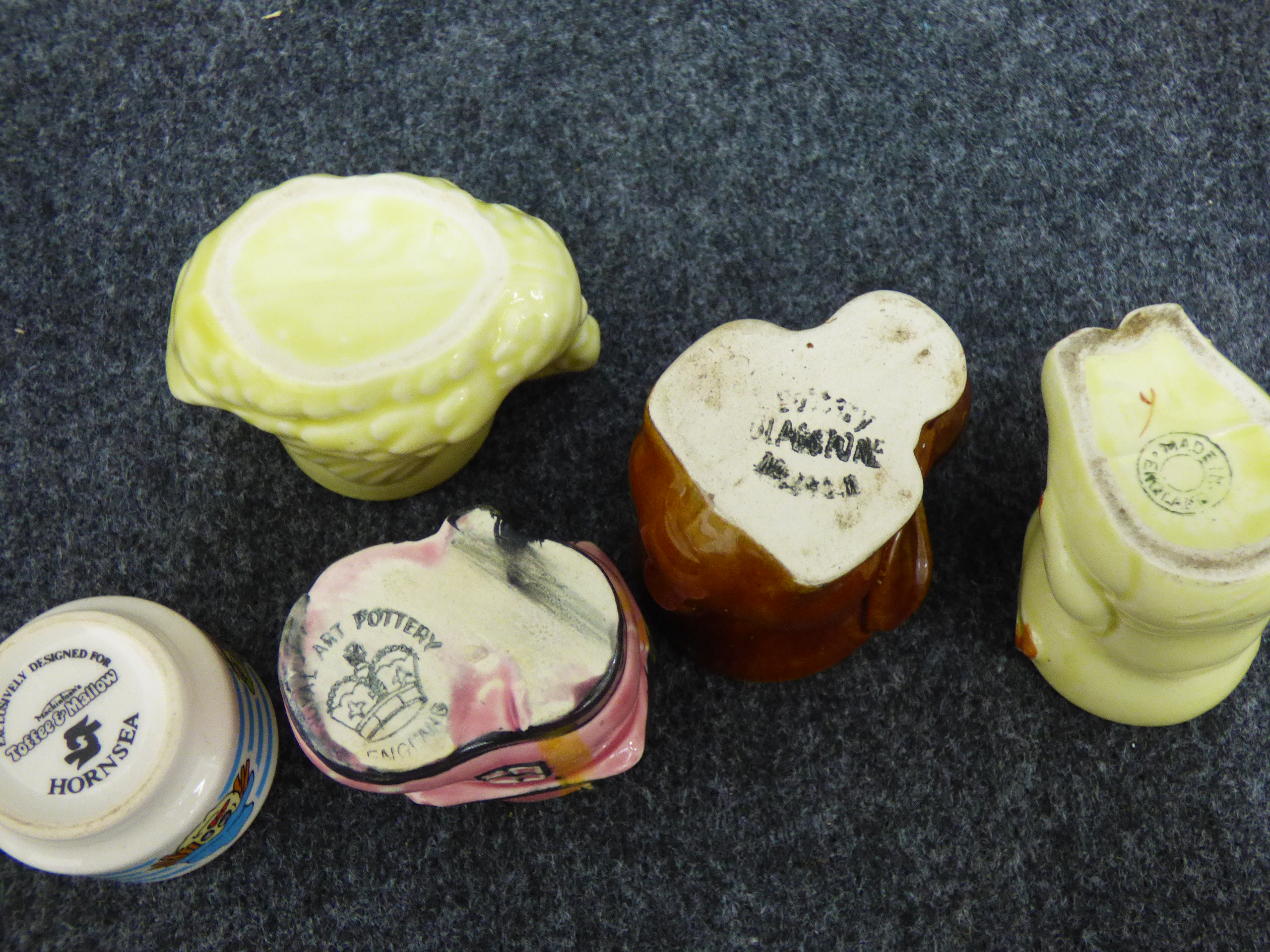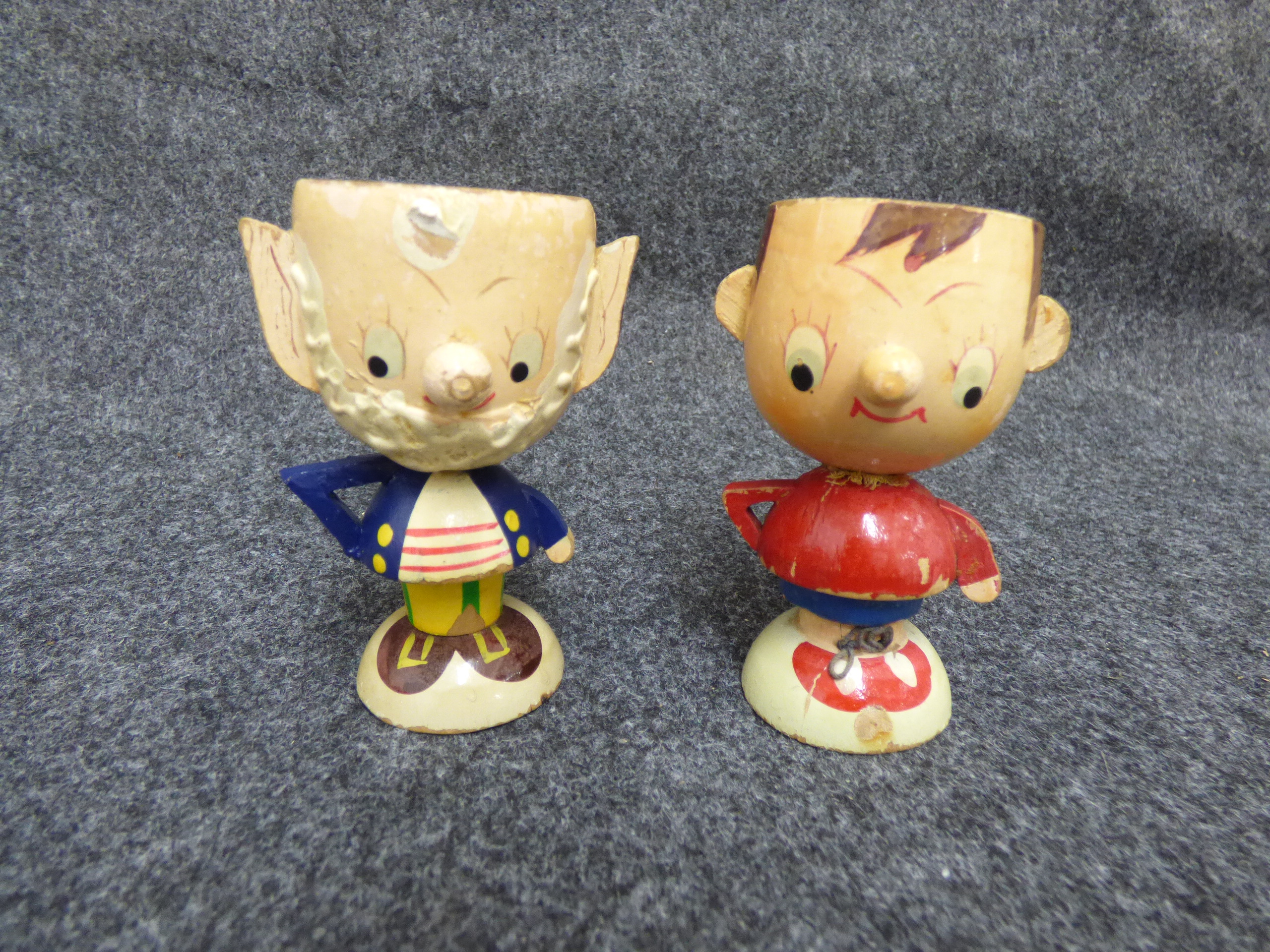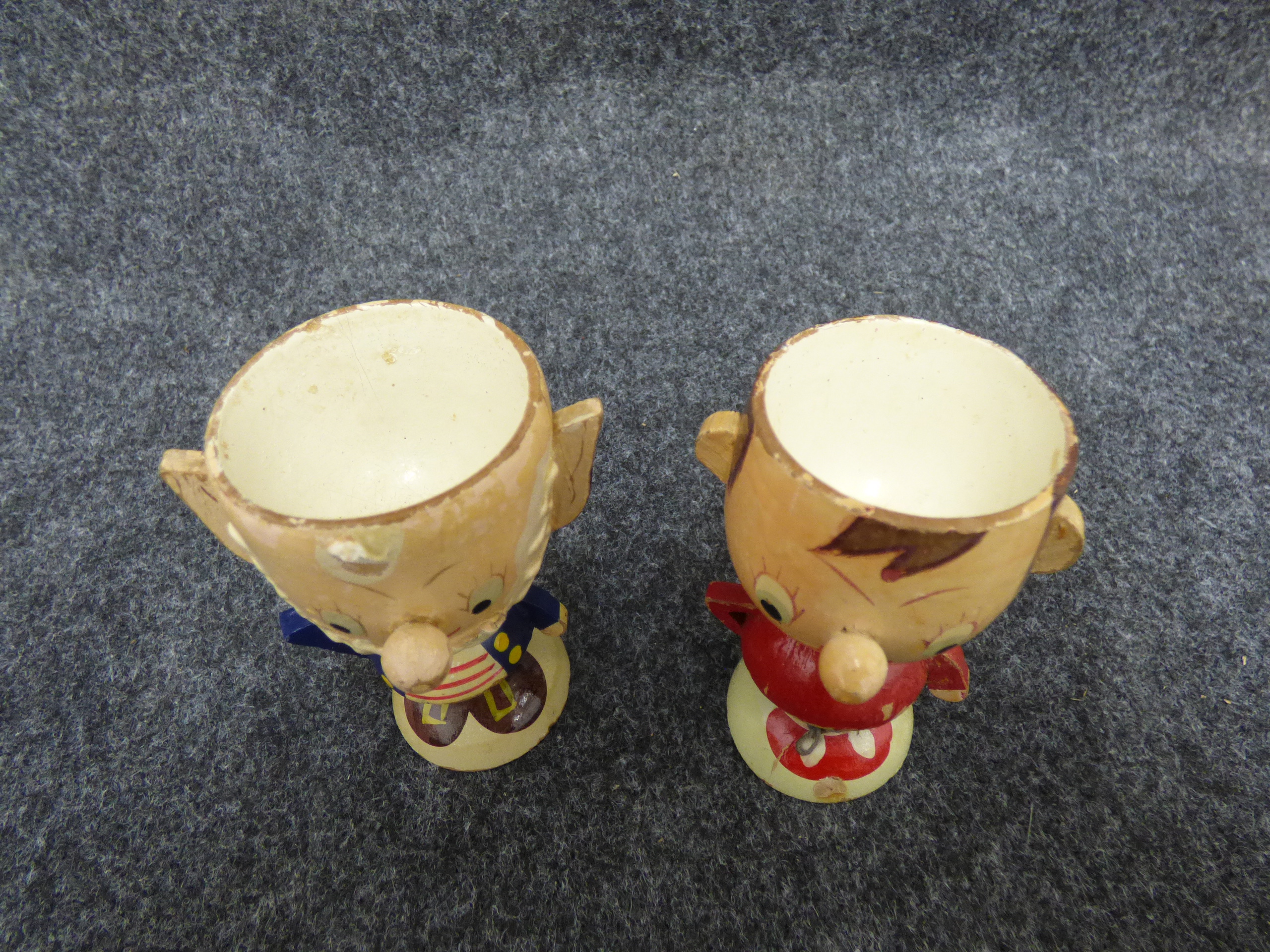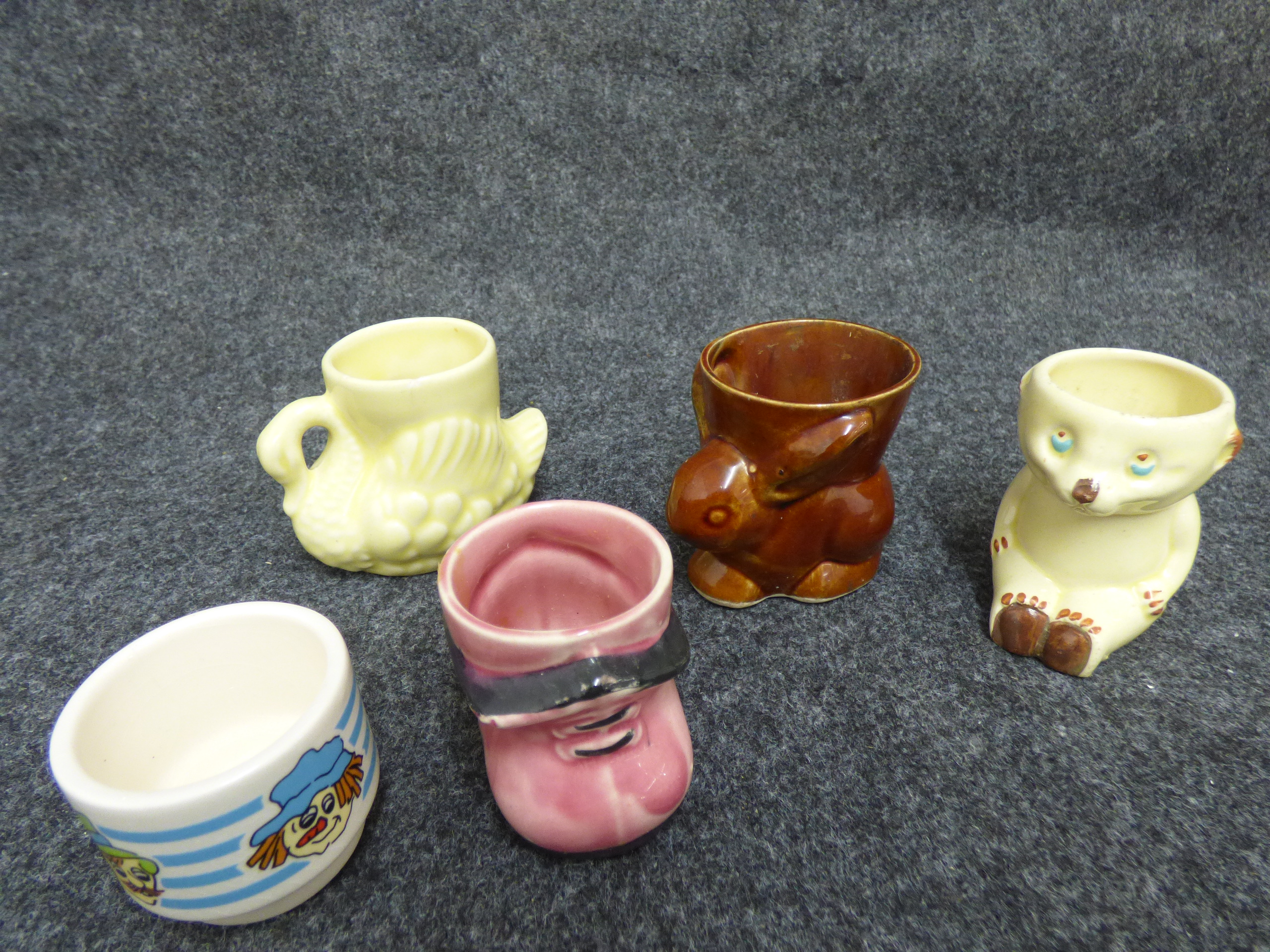 A collection of 11 ceramic and wooden novelty egg cups featuring Wallace and Gromit and Noddy characters, animals, and figures with marks for Hornsea, Beswick, and Art Pottery England.
