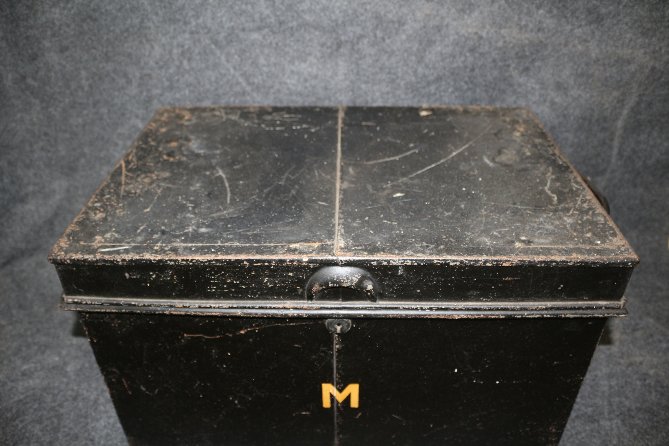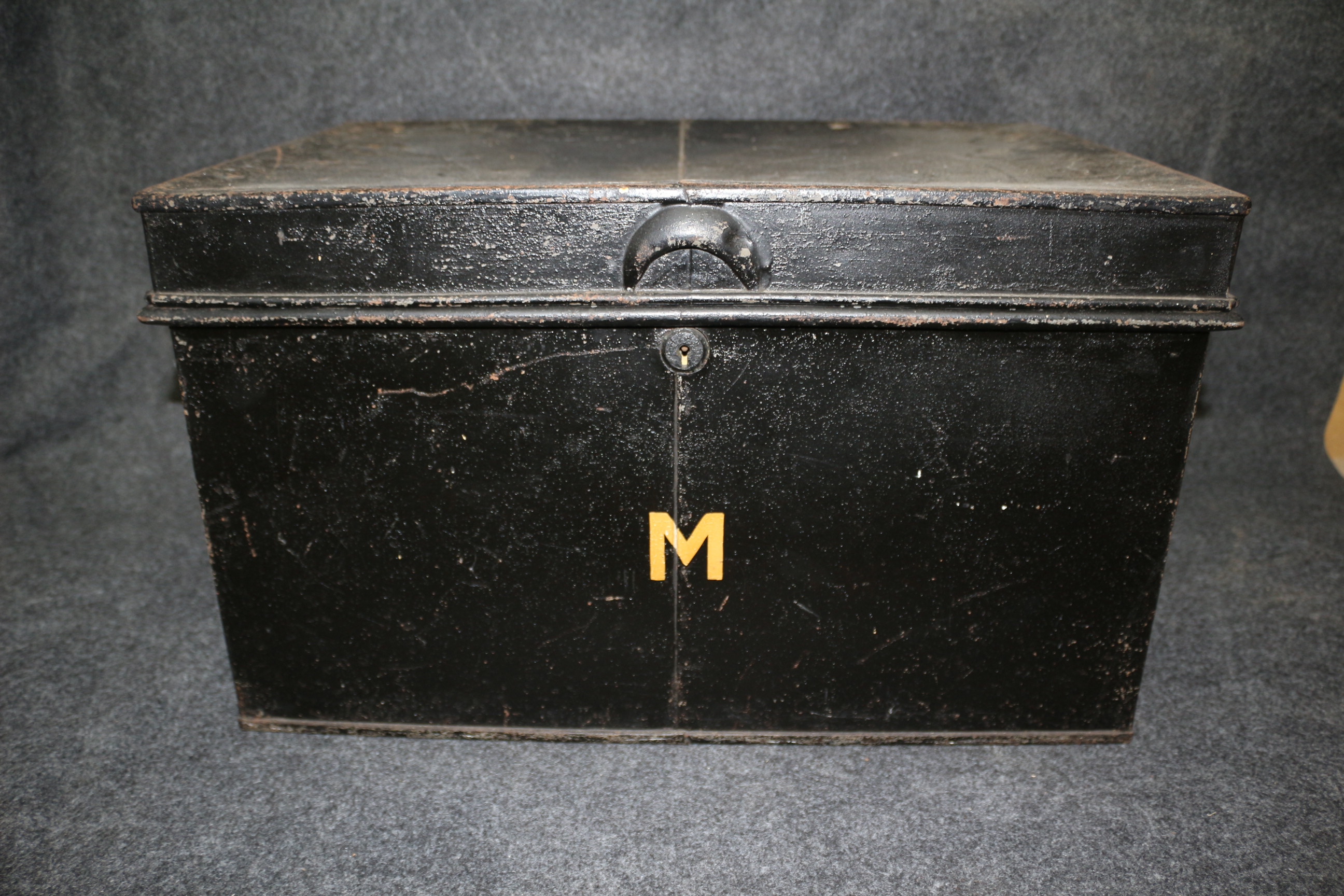 A black metal deed box featuring a hinged lid, side carry handles, and a prominent yellow letter M on the front face. 30cm tall, 51x35cm