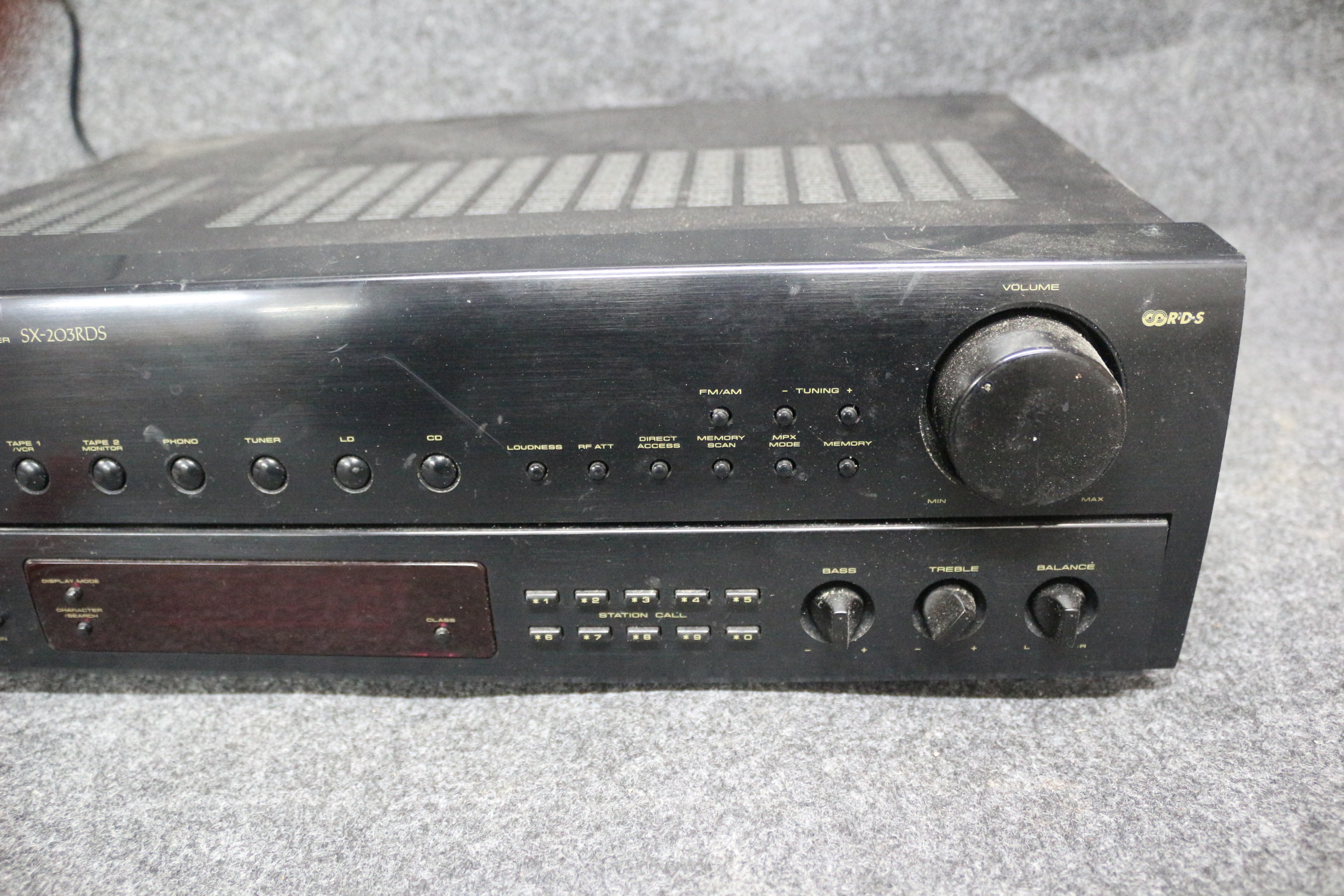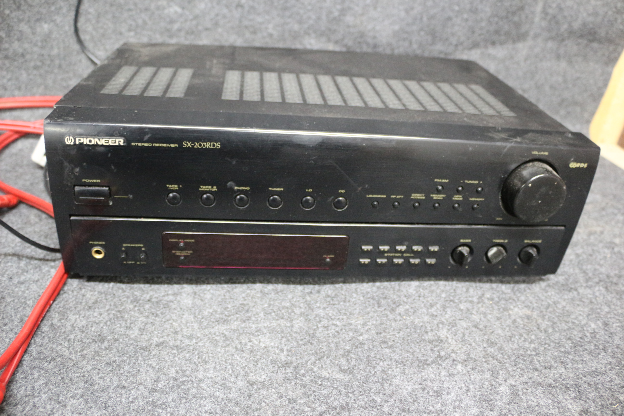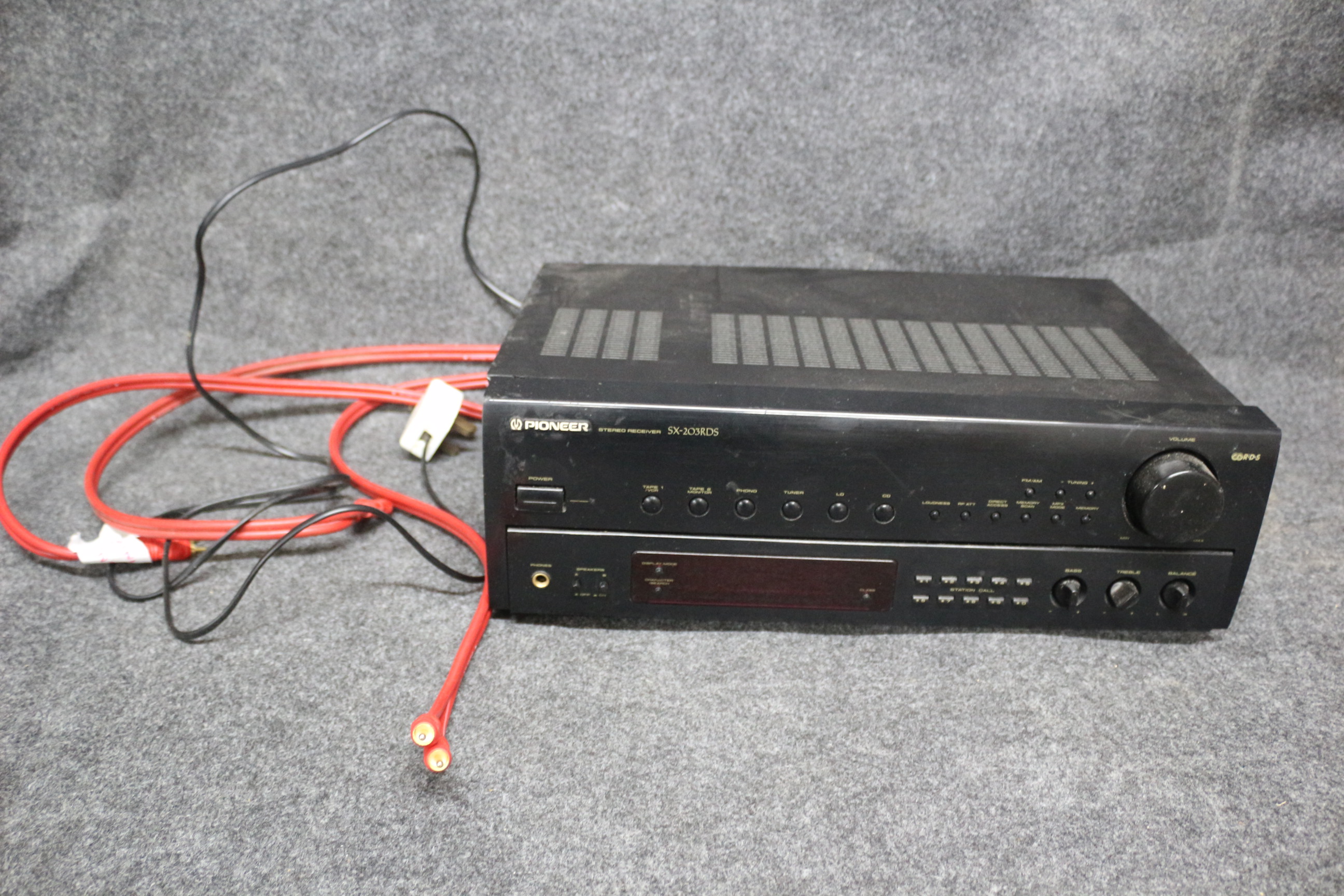 A black Pioneer SX-203RDS stereo receiver accompanied by a collection of red audio cables. Untested
