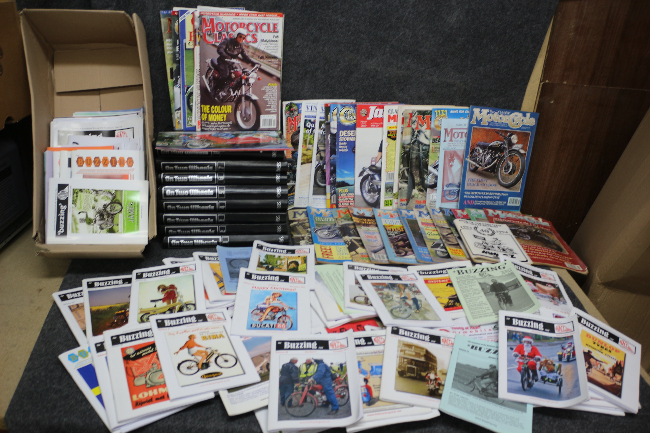 A large collection of motorcycle-themed publications including Motorcycle Classics, The Classic MotorCycle, On Two Wheels, and numerous Buzzing booklets from the National Autocycle and Cyclemotor Club.