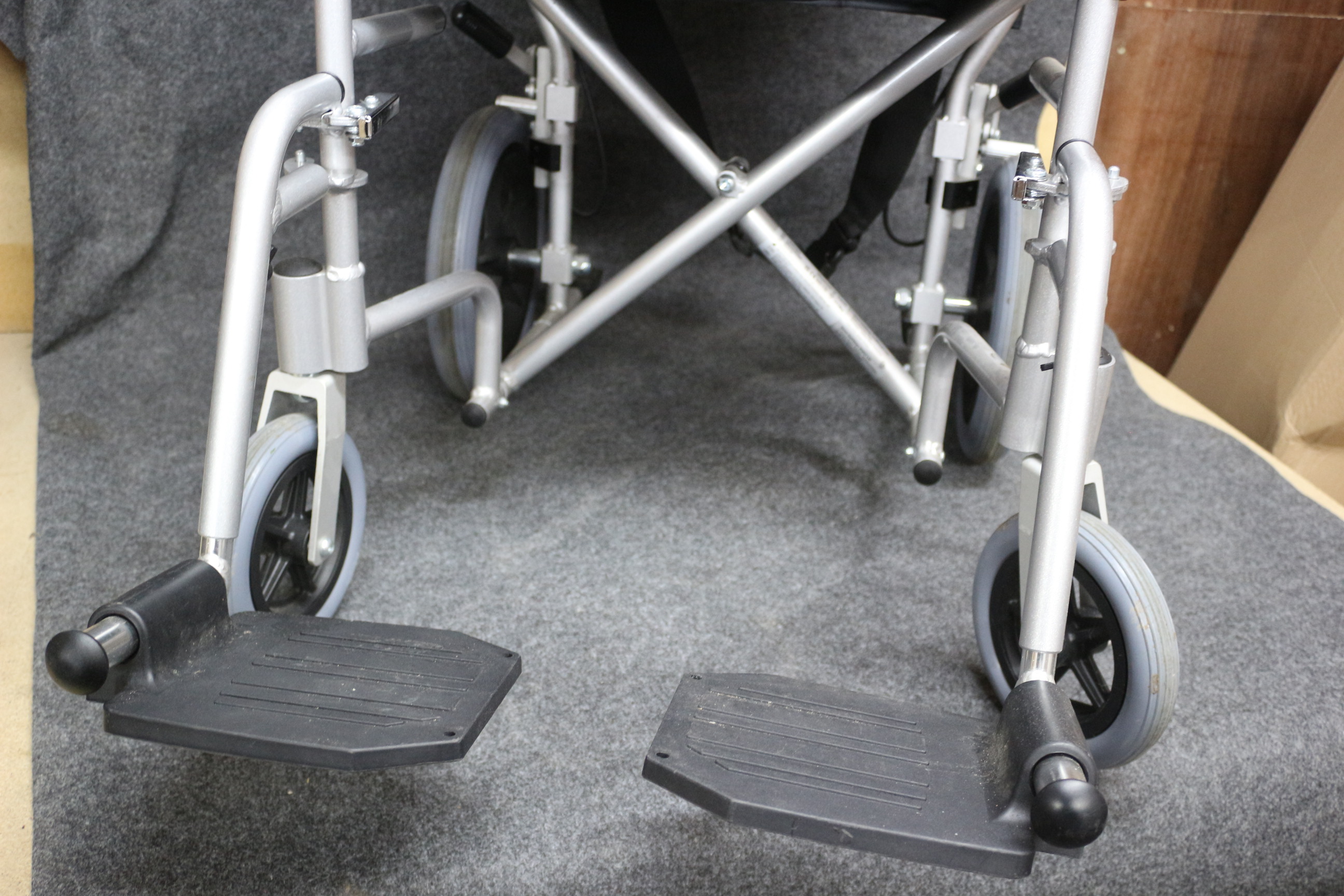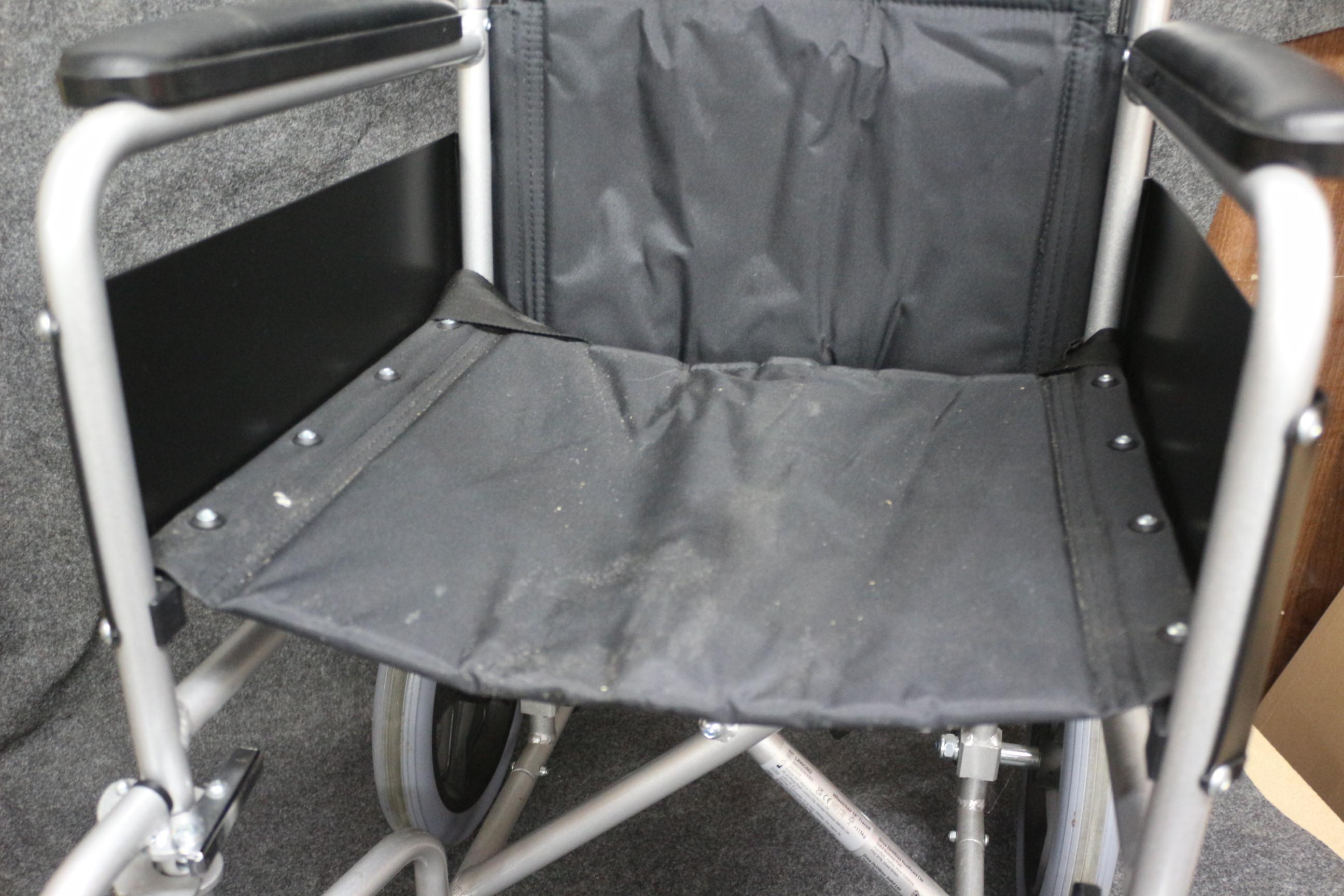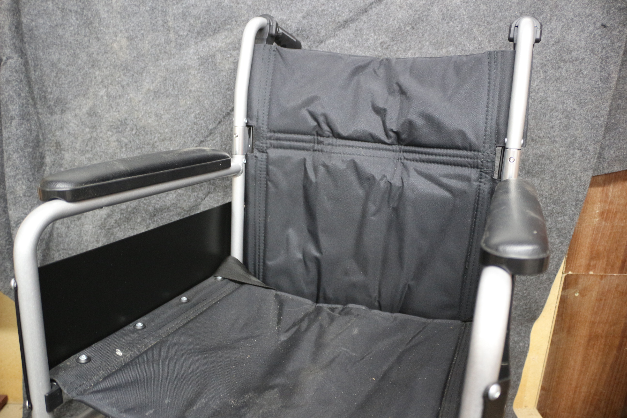 Like new, silver and black wheelchair by Drive DeVilbiss Healthcare featuring a folding frame, padded armrests, and adjustable footrests.