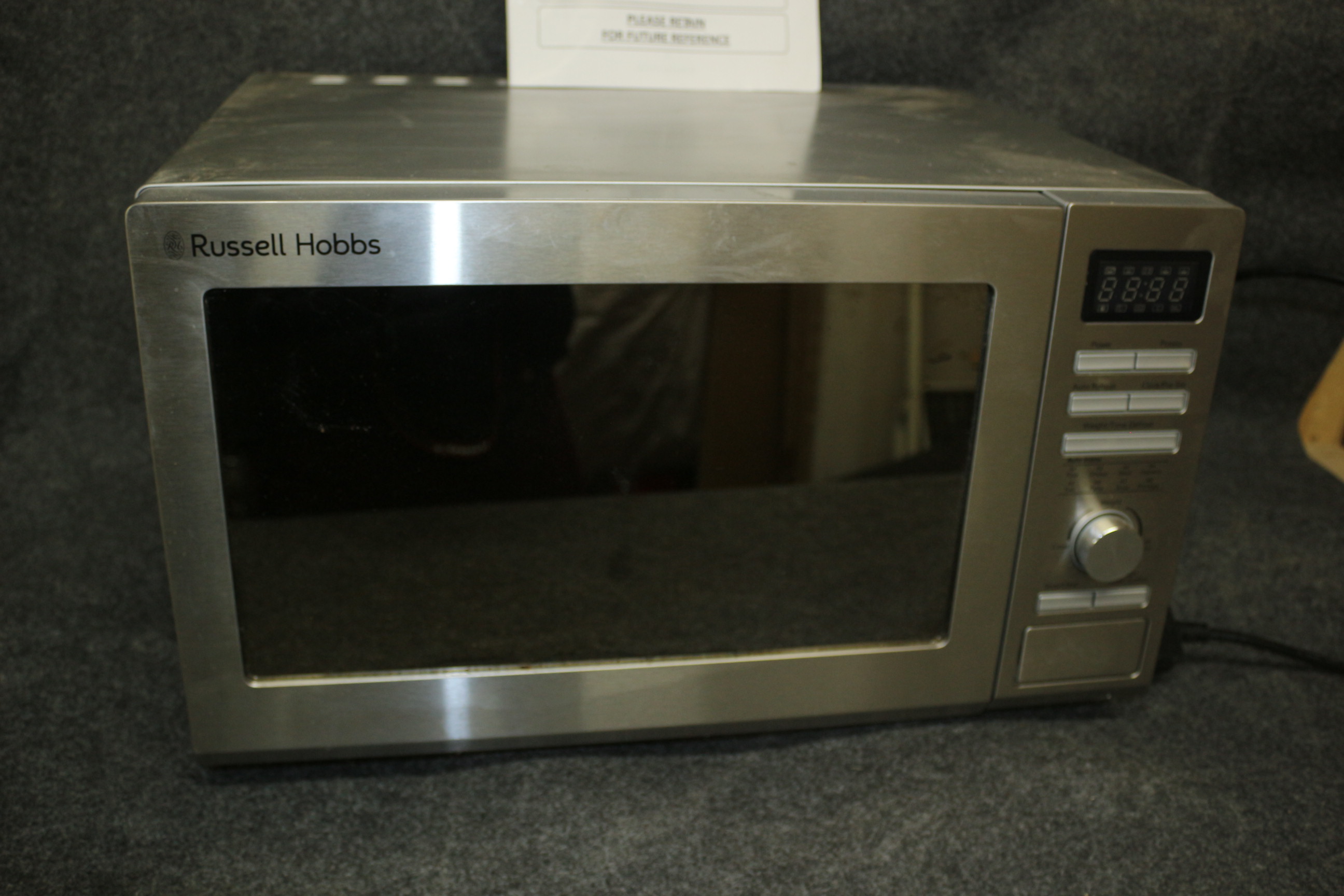 A silver Russell Hobbs compact digital microwave model number RHM2563 accompanied by its original printed user guide. Untested