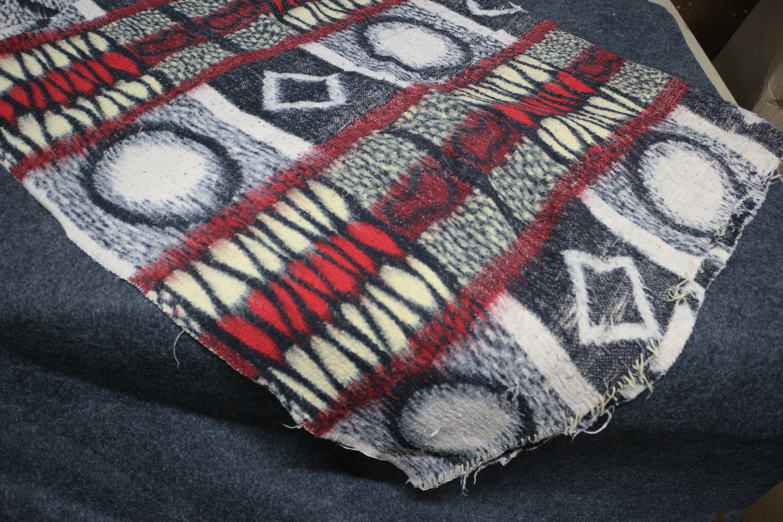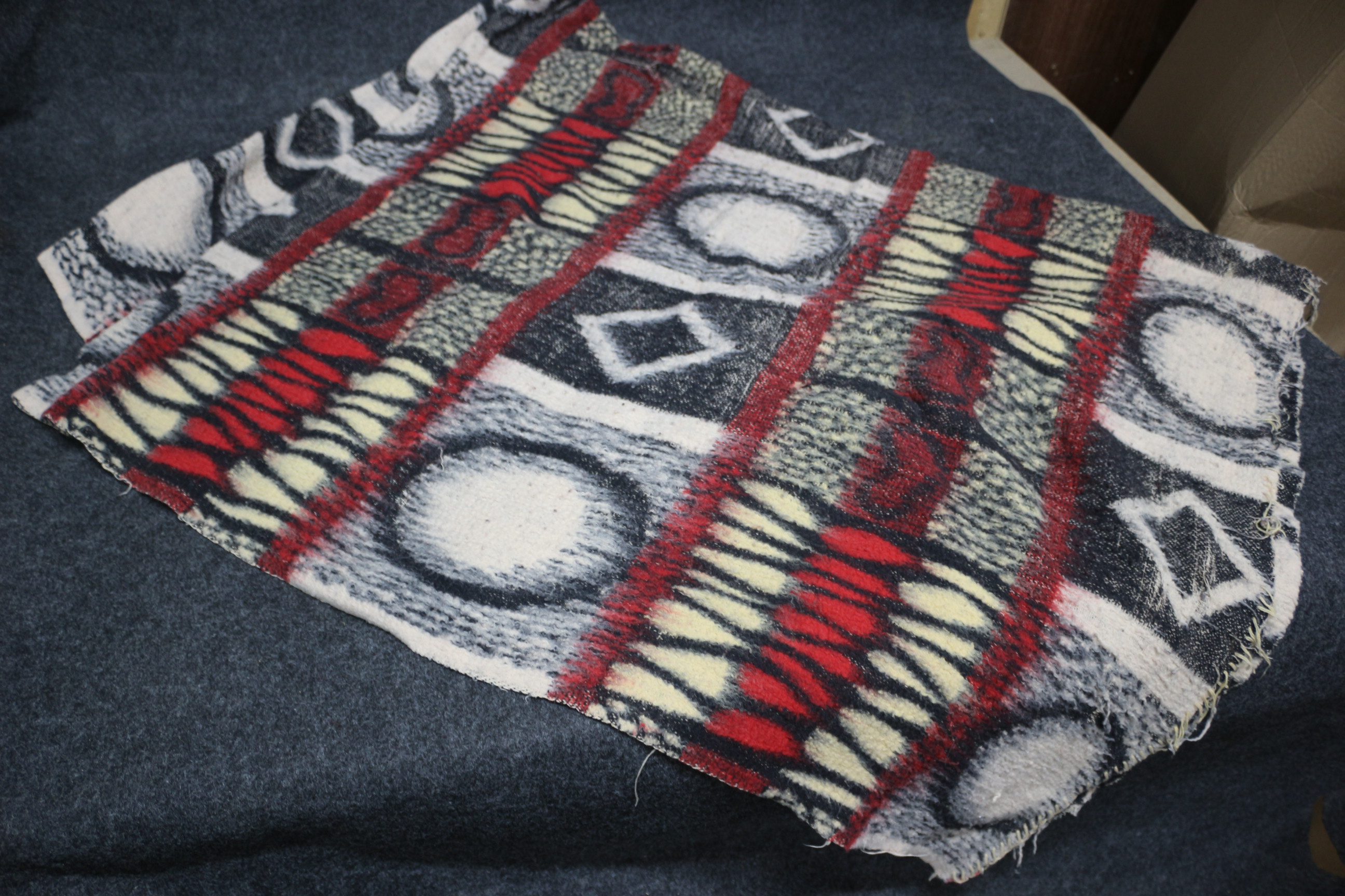 A large throw/blanket featuring a multi-coloured geometric pattern with circles and diamonds in red, black, white, and cream. 135x180cm