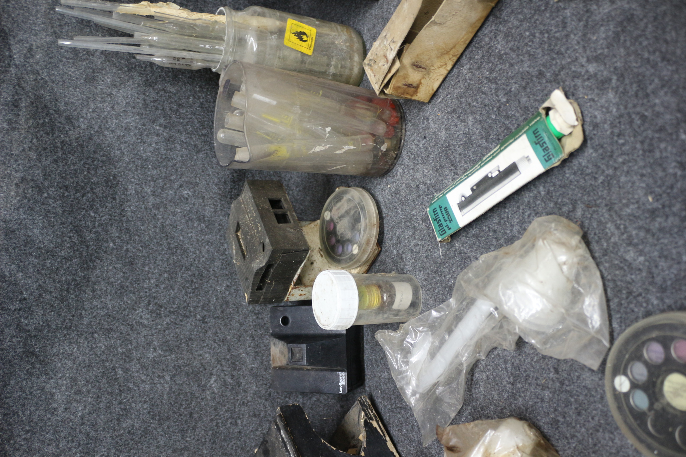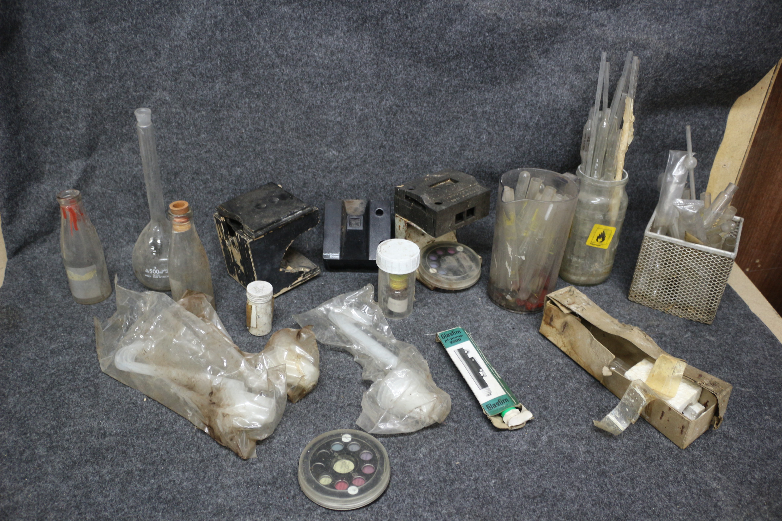 A collection of laboratory equipment including a 500ml flask, a Lovibond 2000 device, a Glasfirm pi-pump 2500, and various pipettes and test tubes.
