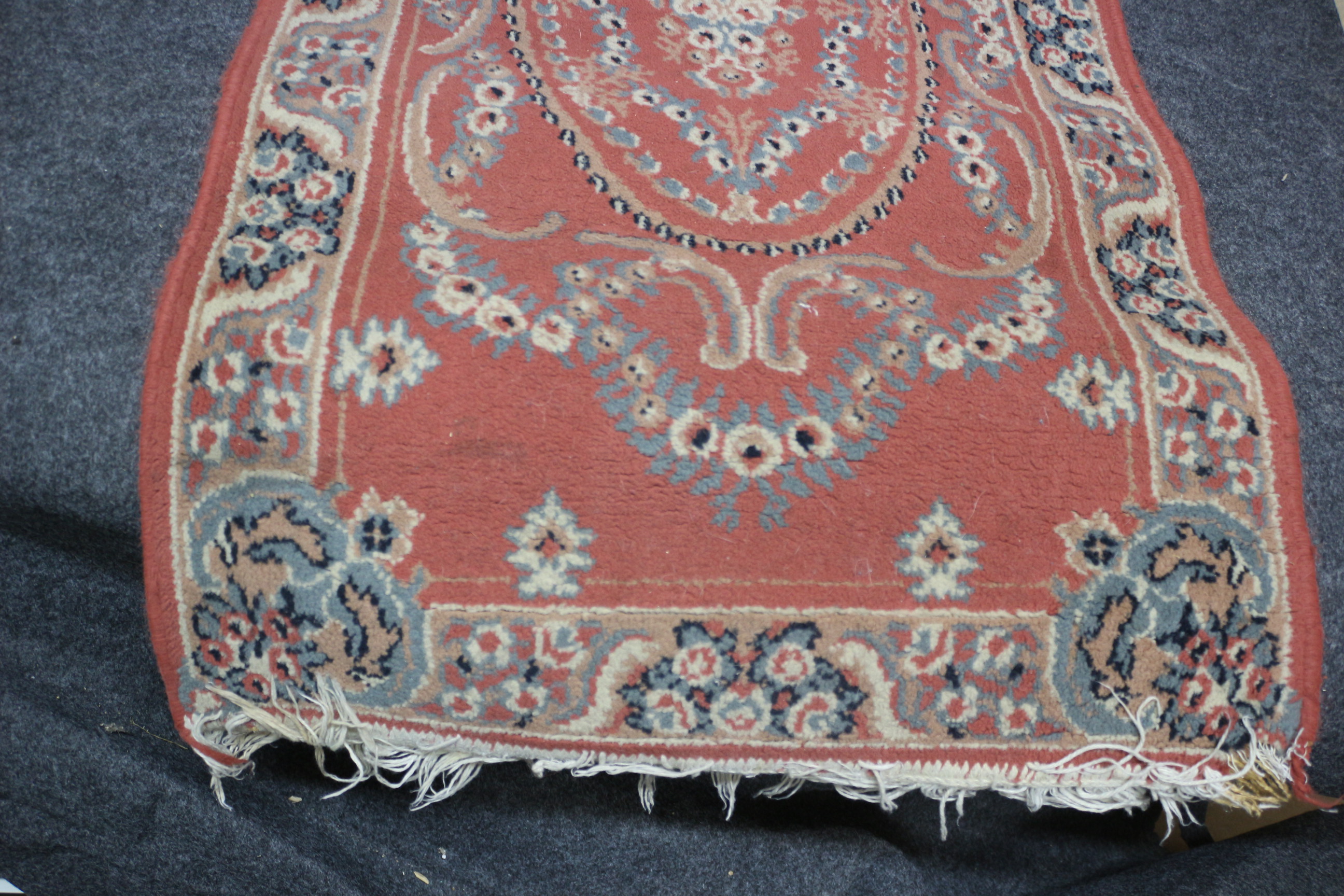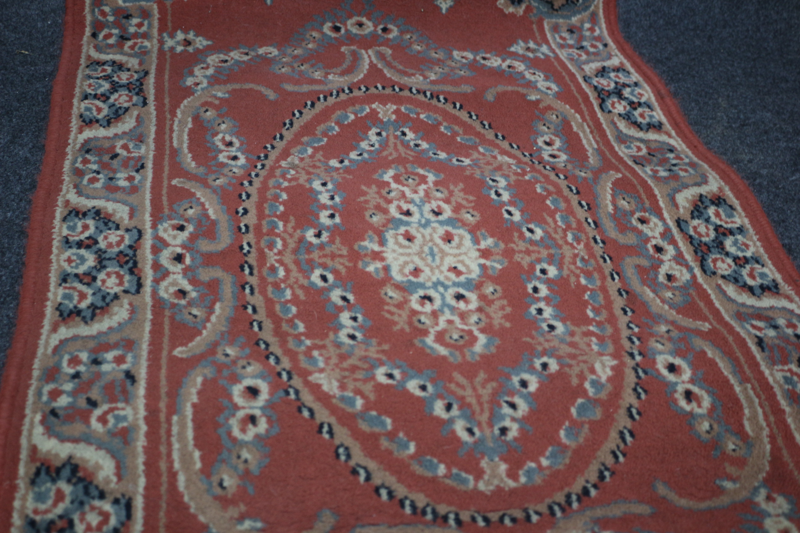 A small rectangular wool runner rug featuring a terracotta red field with intricate blue, cream, and tan floral patterns and white fringed ends. 97x61cm