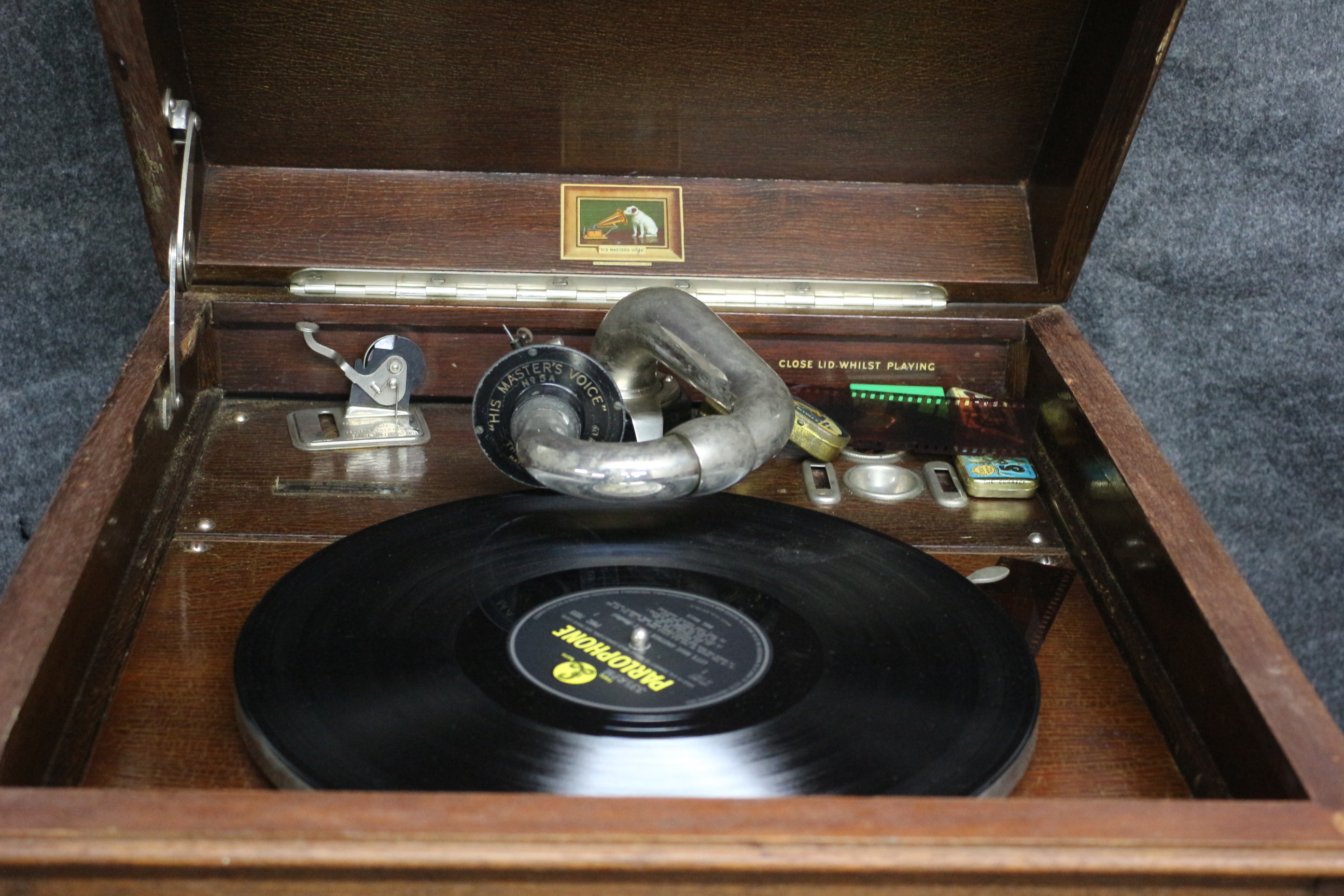 A brown wooden floor-standing gramophone featuring chevron-patterned doors, a No. 5A reproducer, and a Parlophone record on the turntable.