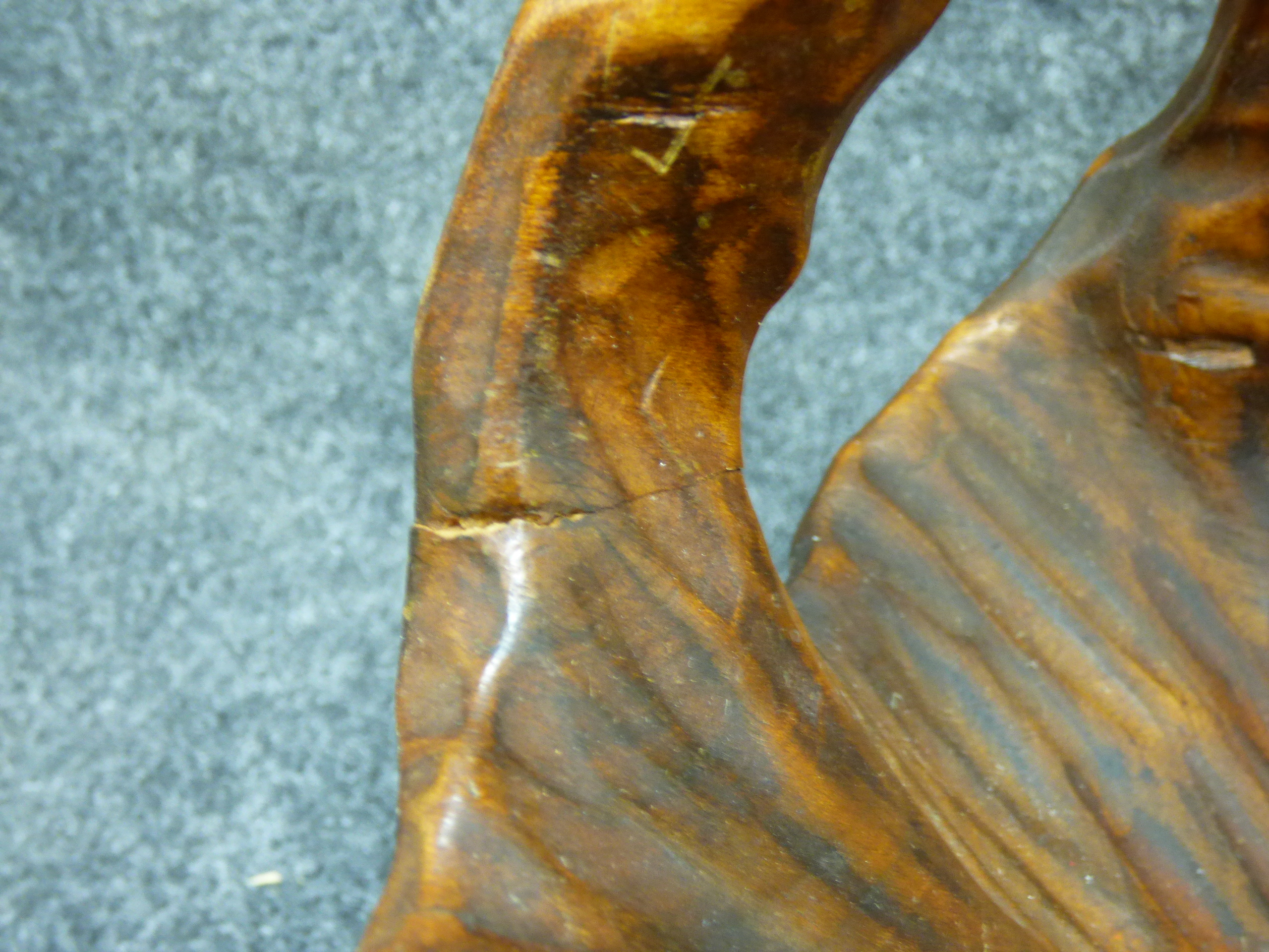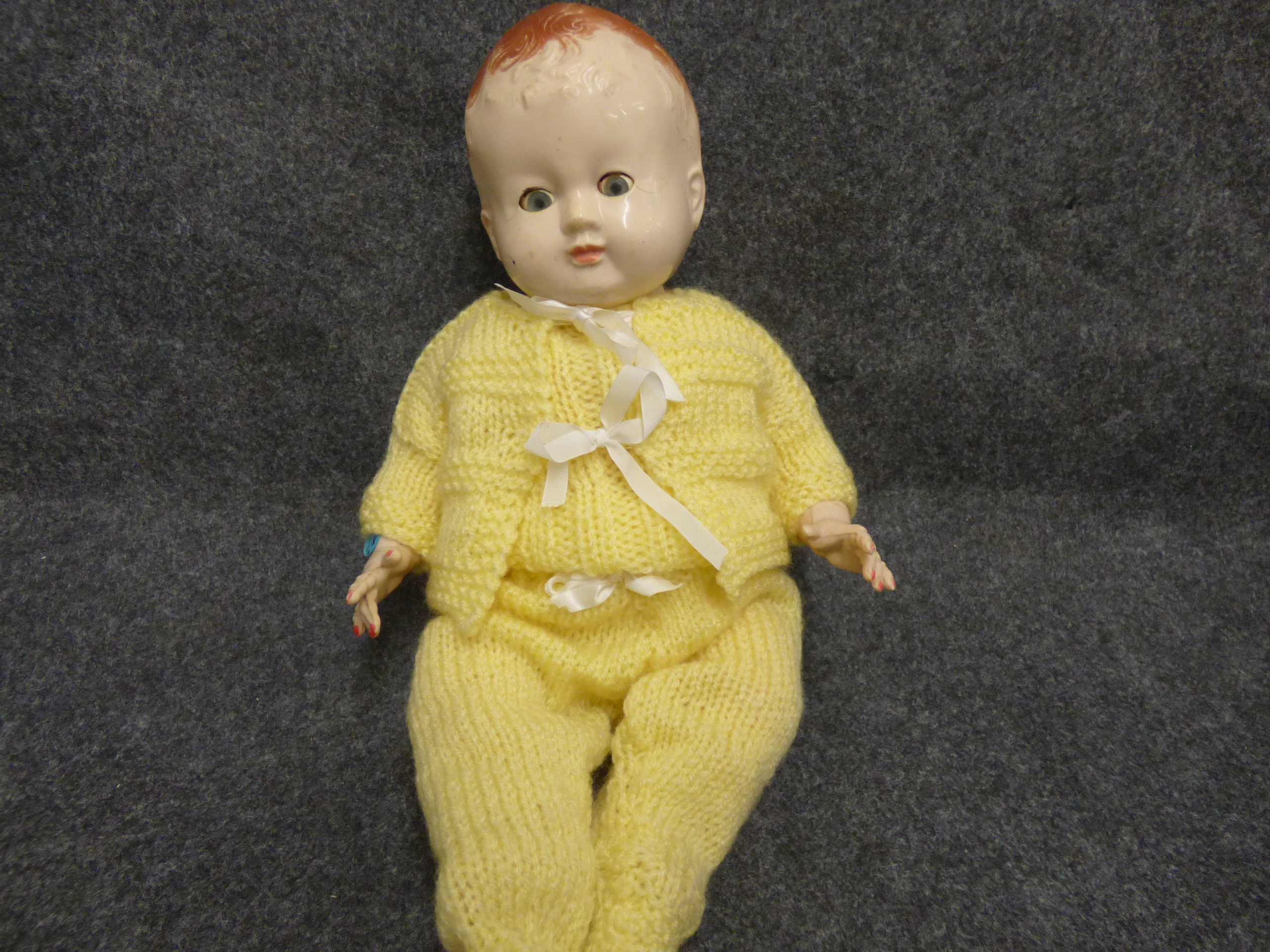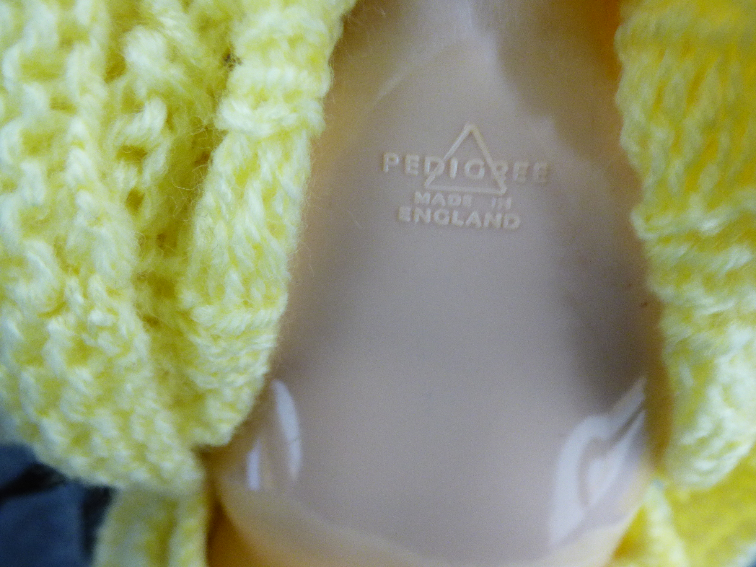 A Pedigree baby doll wearing a yellow knitted outfit accompanied by a dark brown carved wooden basket. Basket approx 33cm wide, 23cm tall.