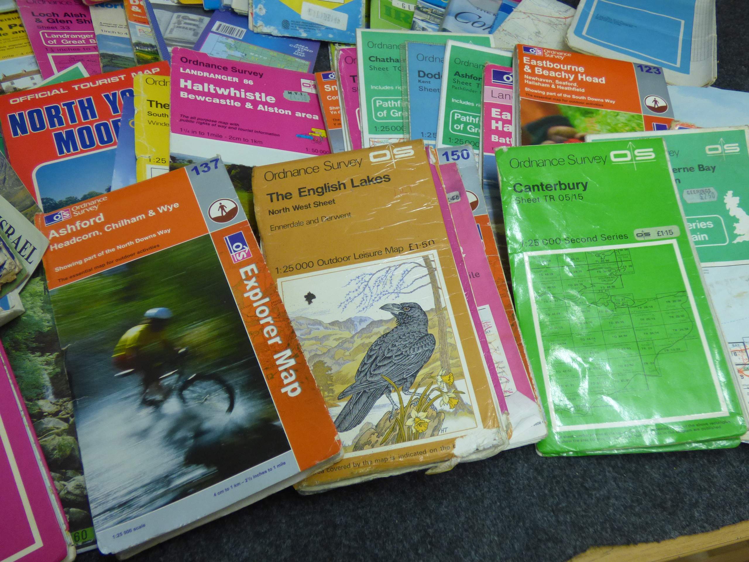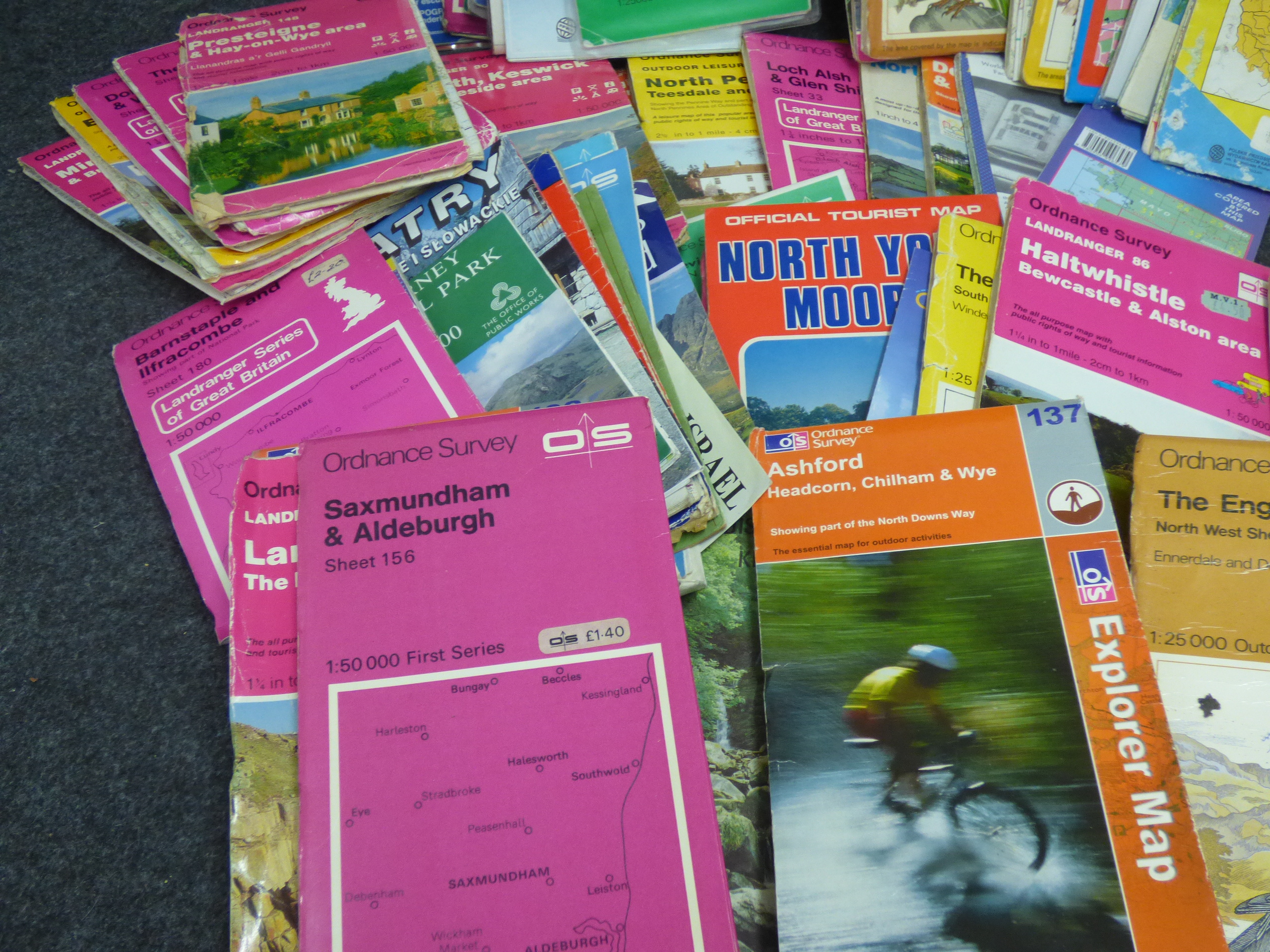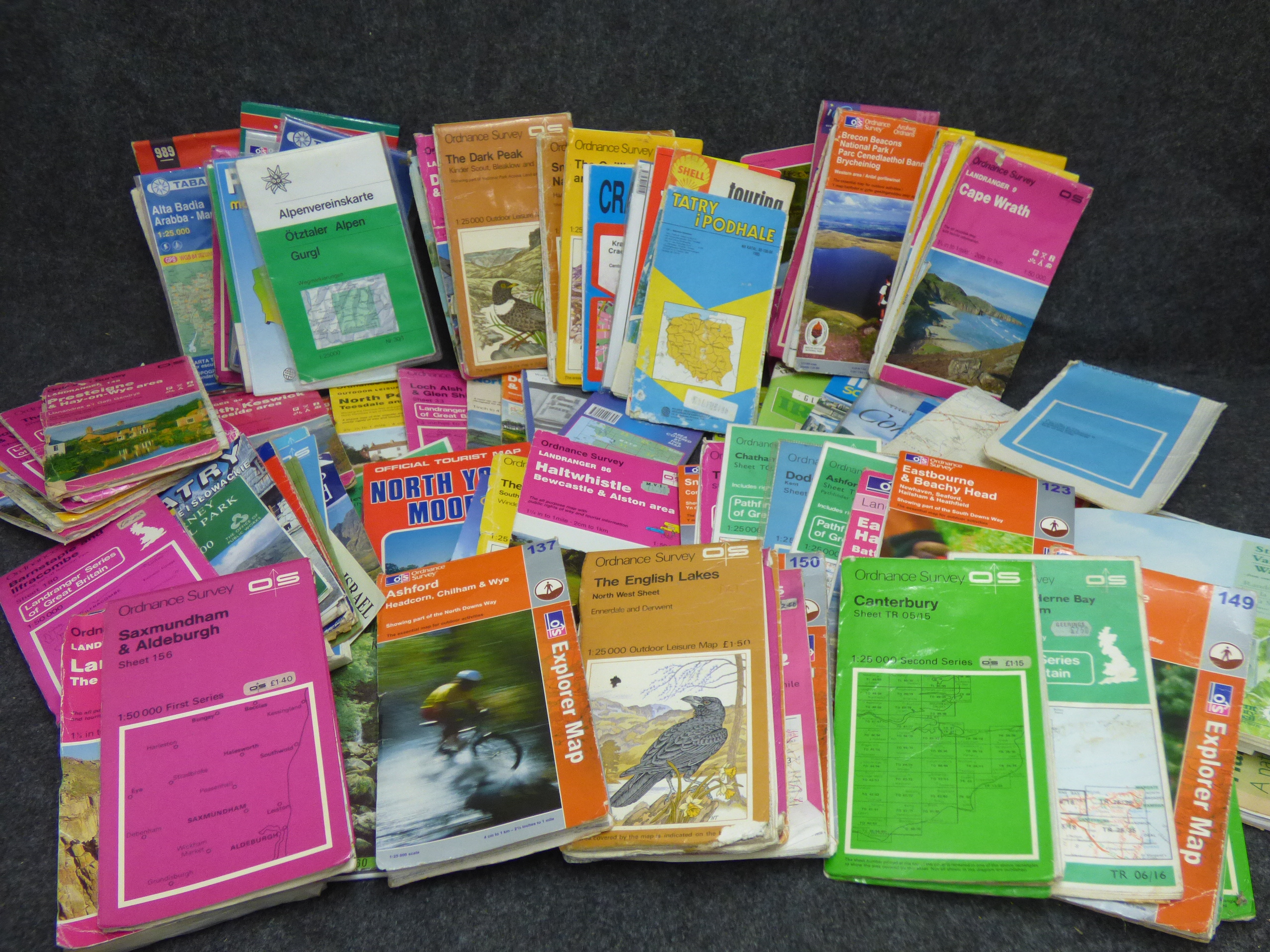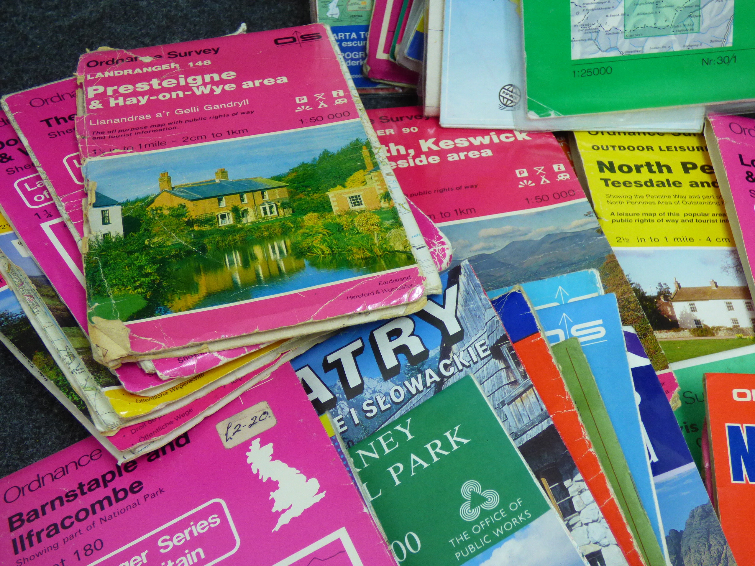A collection of multicoloured maps including Ordnance Survey Landranger and Explorer series alongside Shell touring and Alpenvereinskarte titles.