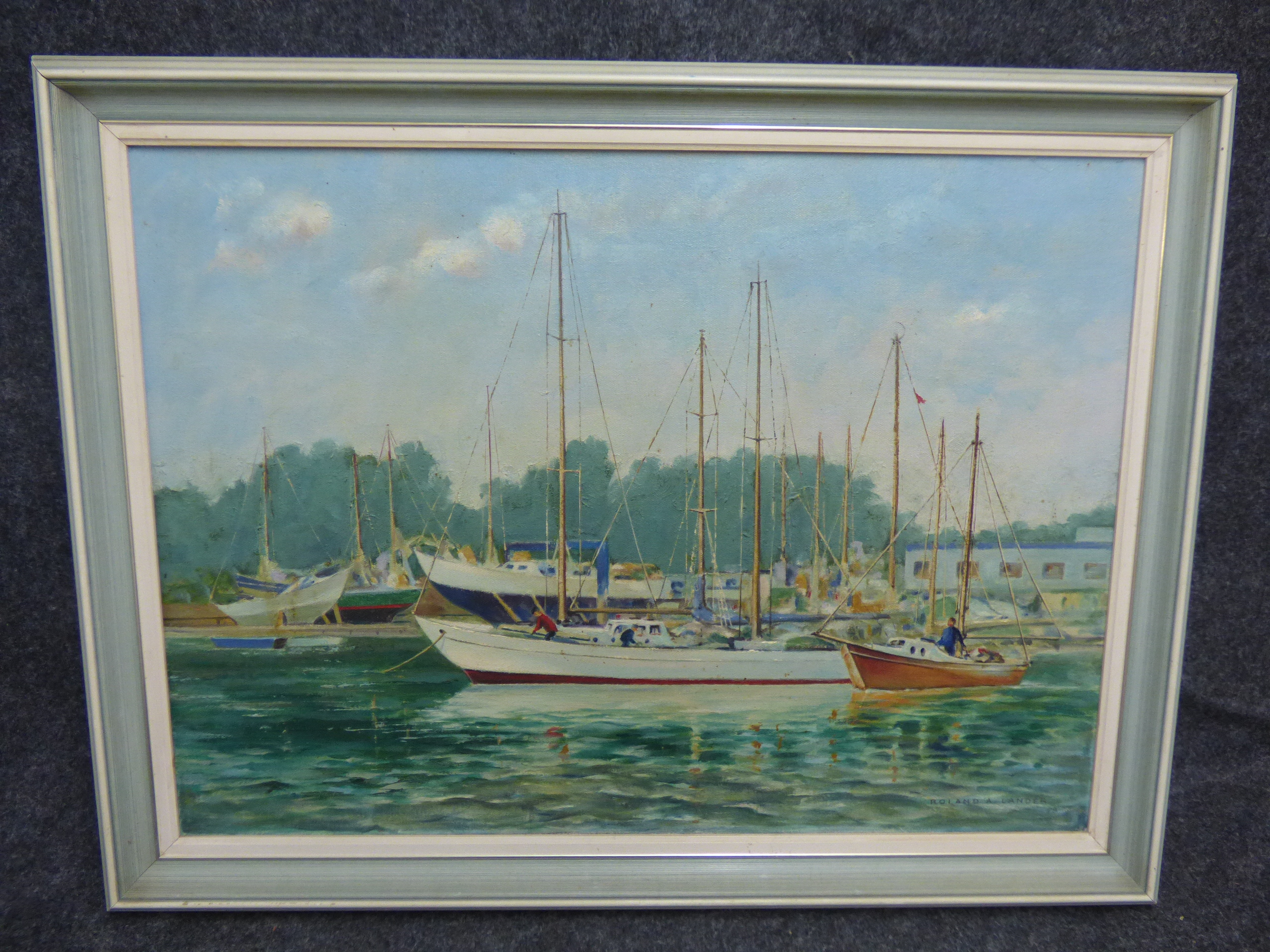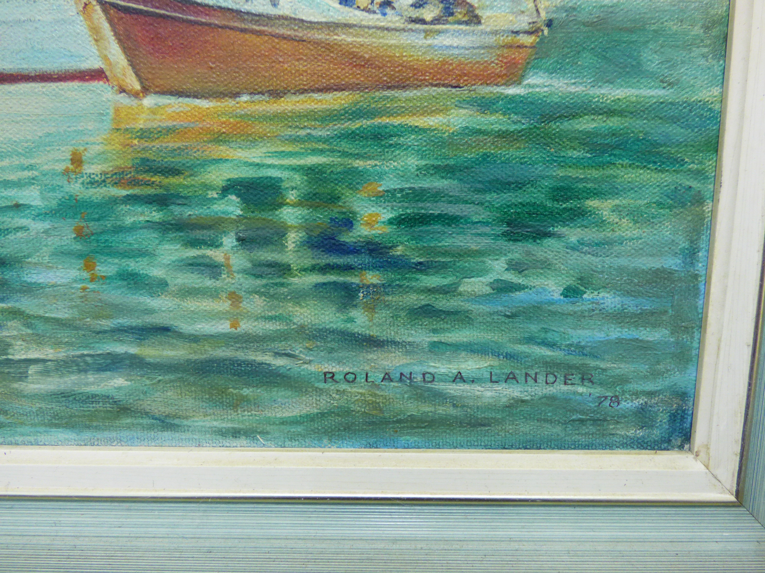 A framed oil on canvas painting depicting several sailboats in a harbour, signed Roland A. Lander and dated 1978 in the lower right corner. 63x48cm