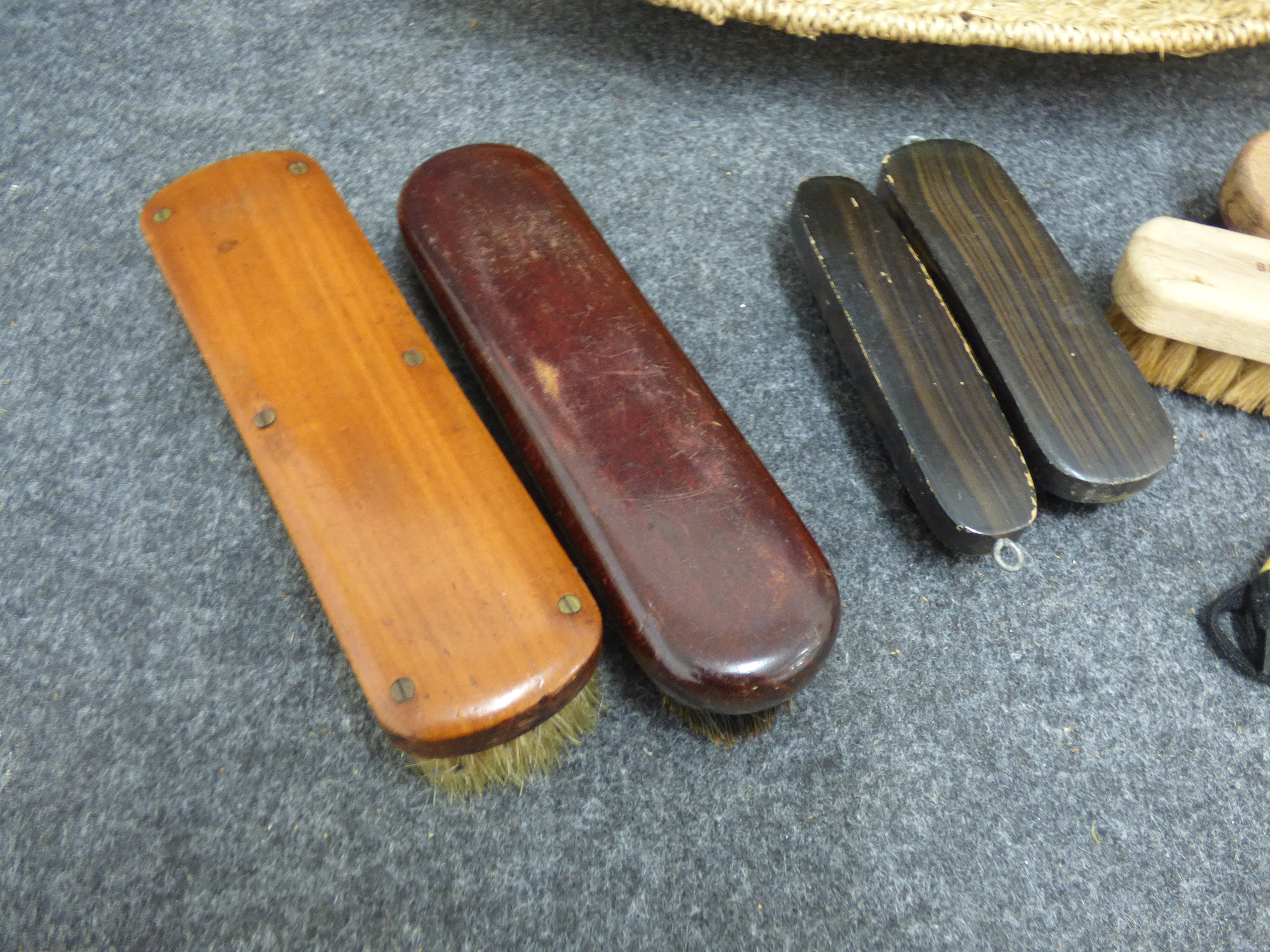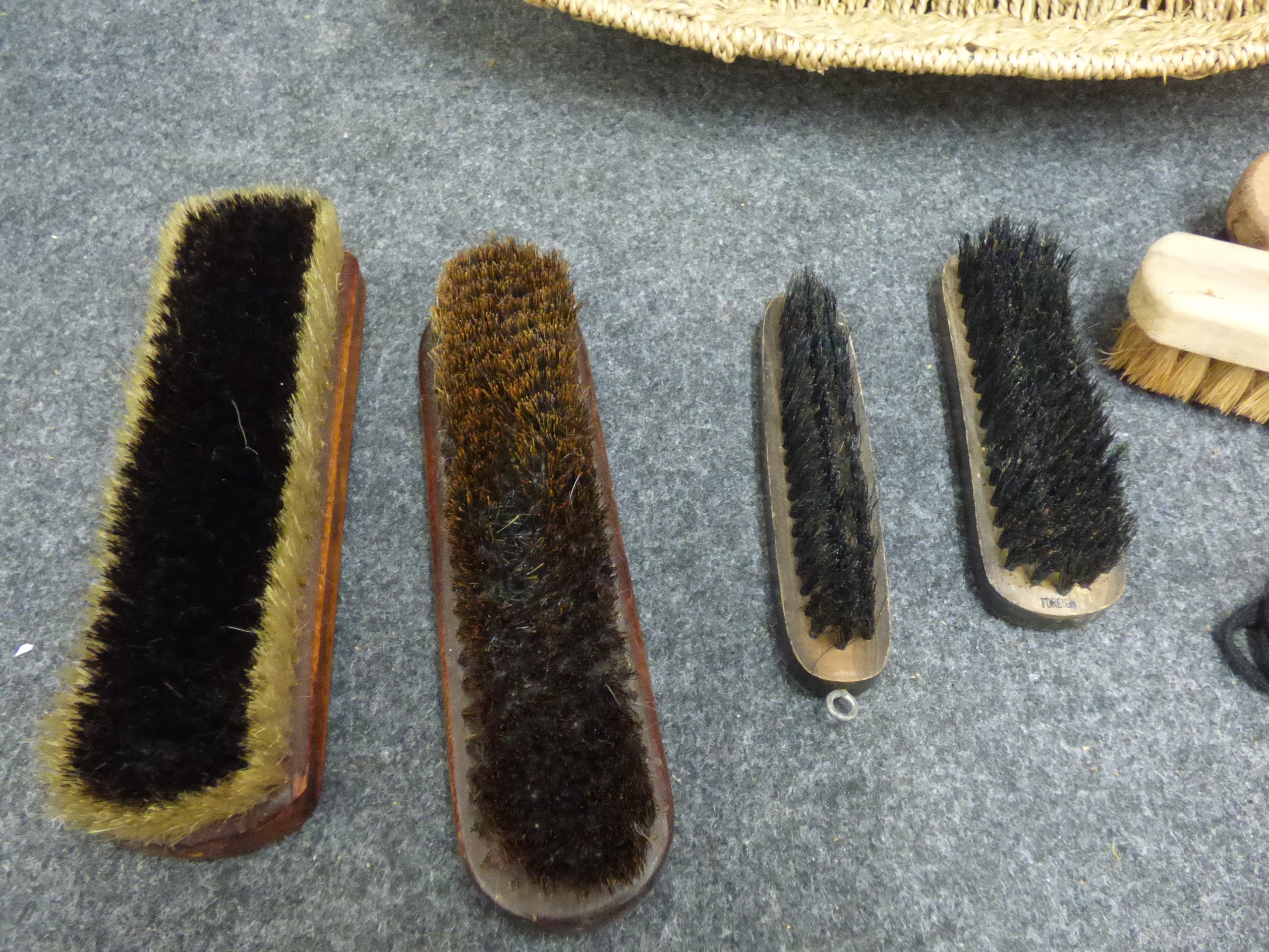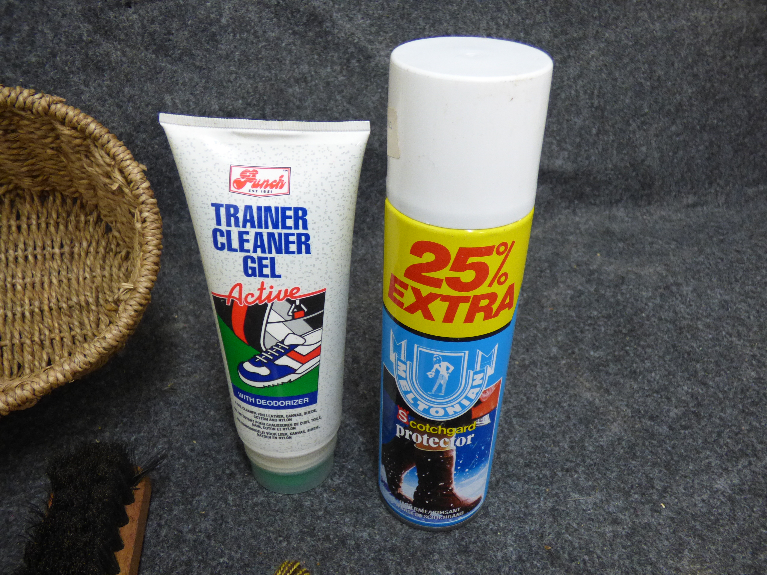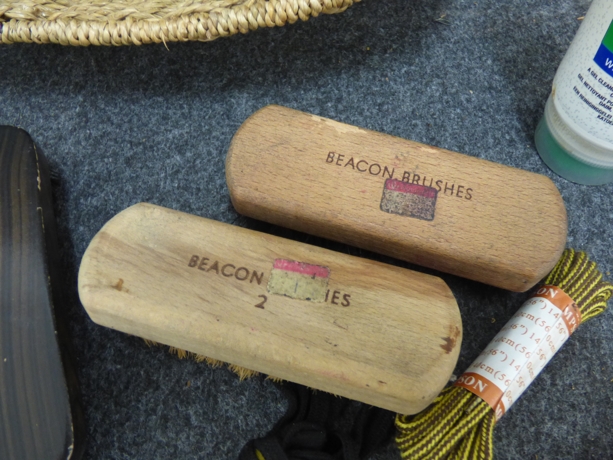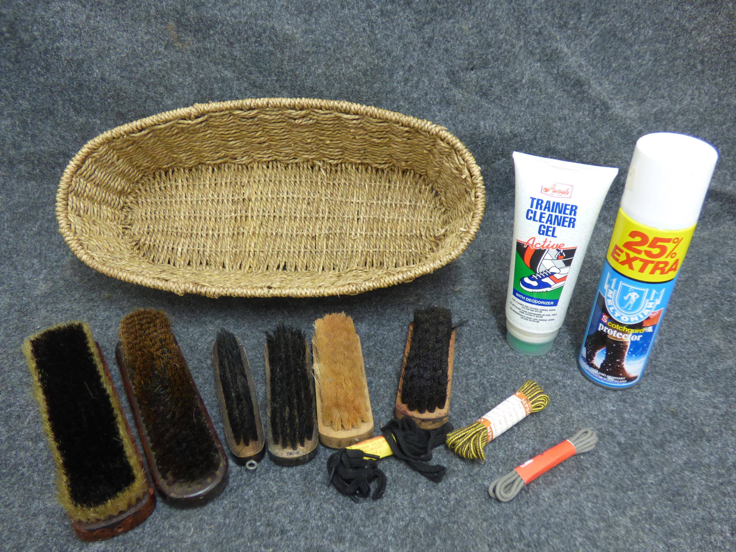 A collection of shoe care accessories featuring a tan woven oval basket, wooden-backed brushes marked Beacon Brushes and Foreign, Son branded shoelaces, Punch Trainer Cleaner Gel, and Meltonian Scotchgard Protector.