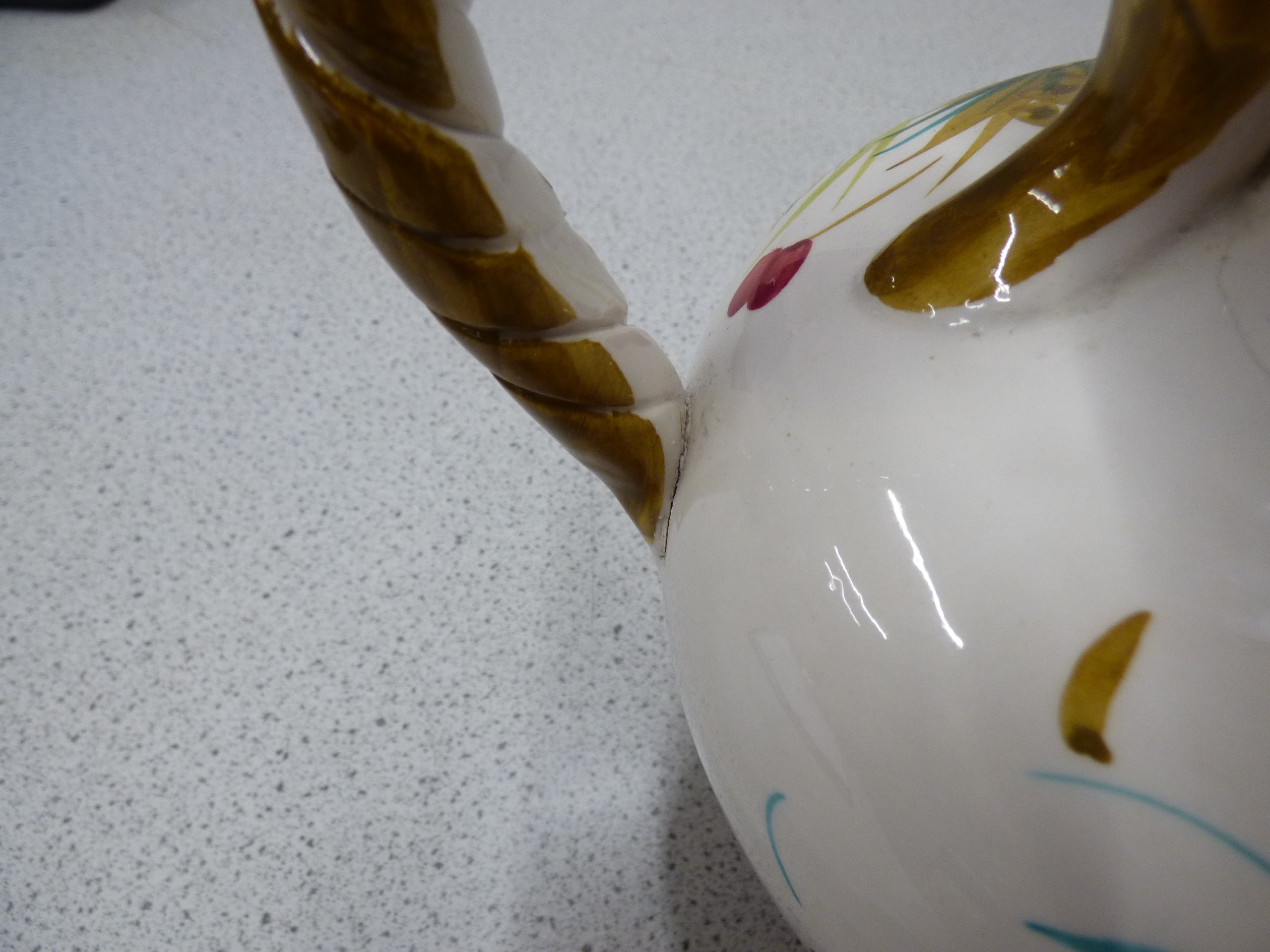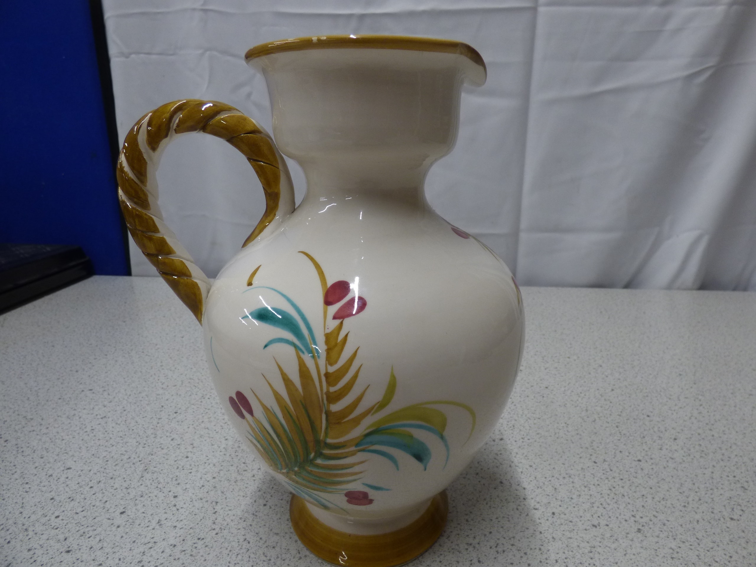 A white ceramic pitcher with a braided brown/gold handle and rim, decorated with multi-coloured floral and leaf patterns in shades of red, yellow, green, teal, and brown, inscribed on the base with ‘Ray’ and ‘3/51’. 27cm tall. Small chips on rim, handle AF.