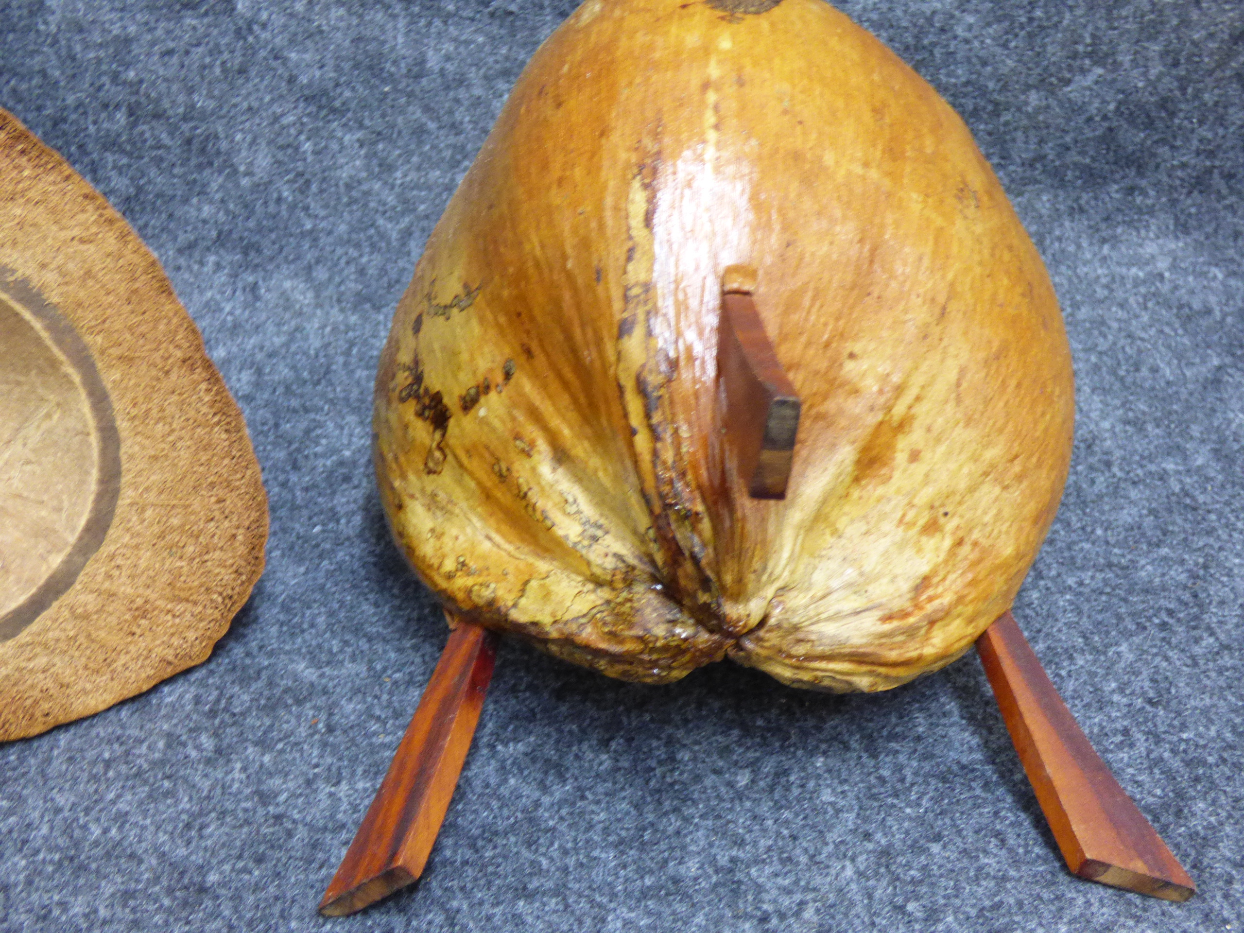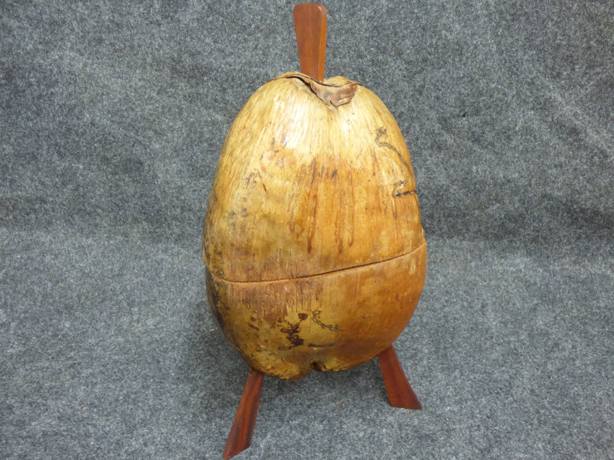 A handmade lidded bowl crafted from a natural tan coconut husk featuring three reddish-brown wooden legs and a matching wooden handle.