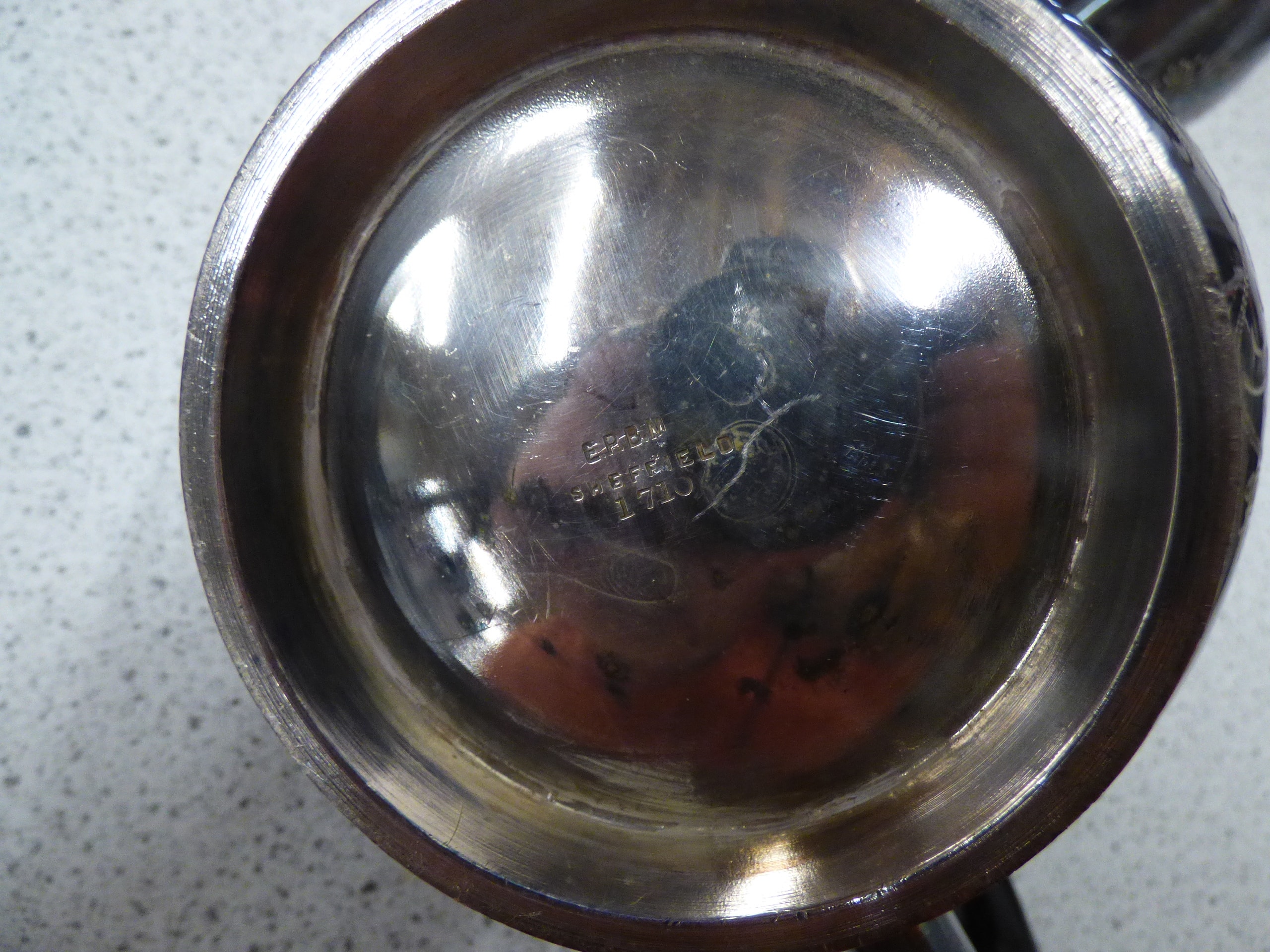 A five-piece silver-coloured tea set, comprising a teapot with black accents, a sugar scuttle, a lidded sugar bowl, a creamer, and a small scoop, with the creamer and sugar bowl bottoms marked “E.P.B.M SHEFFIELD” and the sugar bowl additionally marked “ITALIAN 710”.