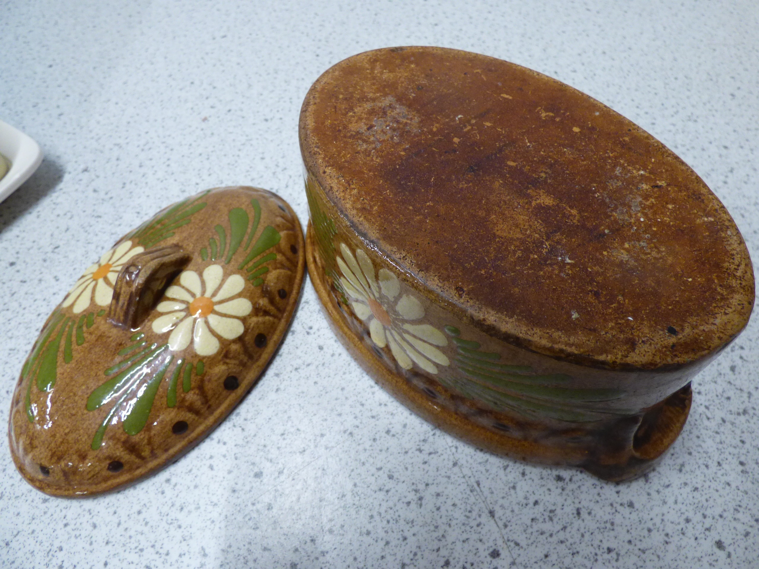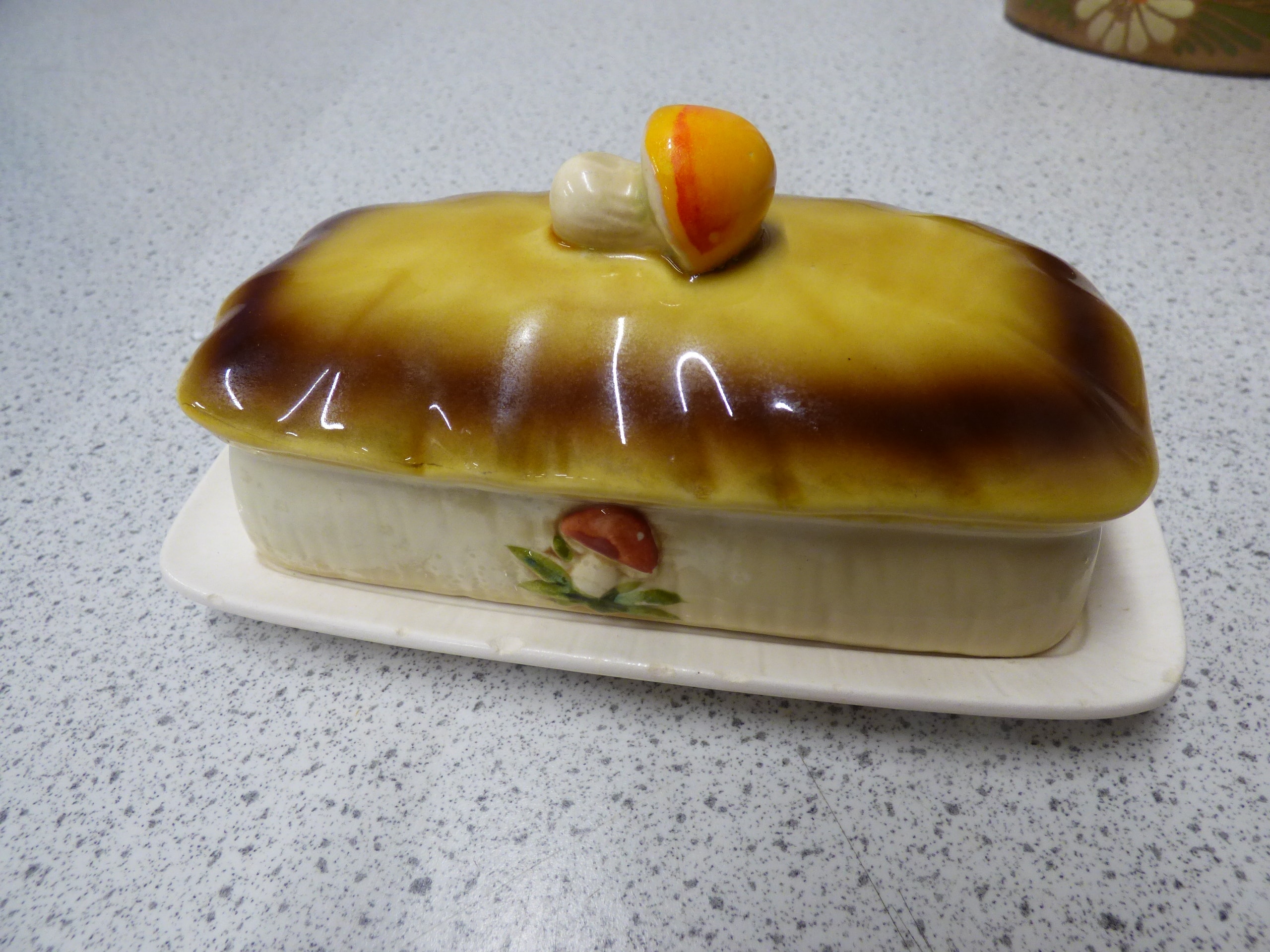 A cream-coloured 70s Sears and Roebuck Merry Mushroom ceramic butter dish with a yellow-brown mushroom-decorated lid and tray, which has a raised “M” mark on its underside, and a brown ceramic hand painted covered casserole dish decorated with white and yellow daisies and green leaves.