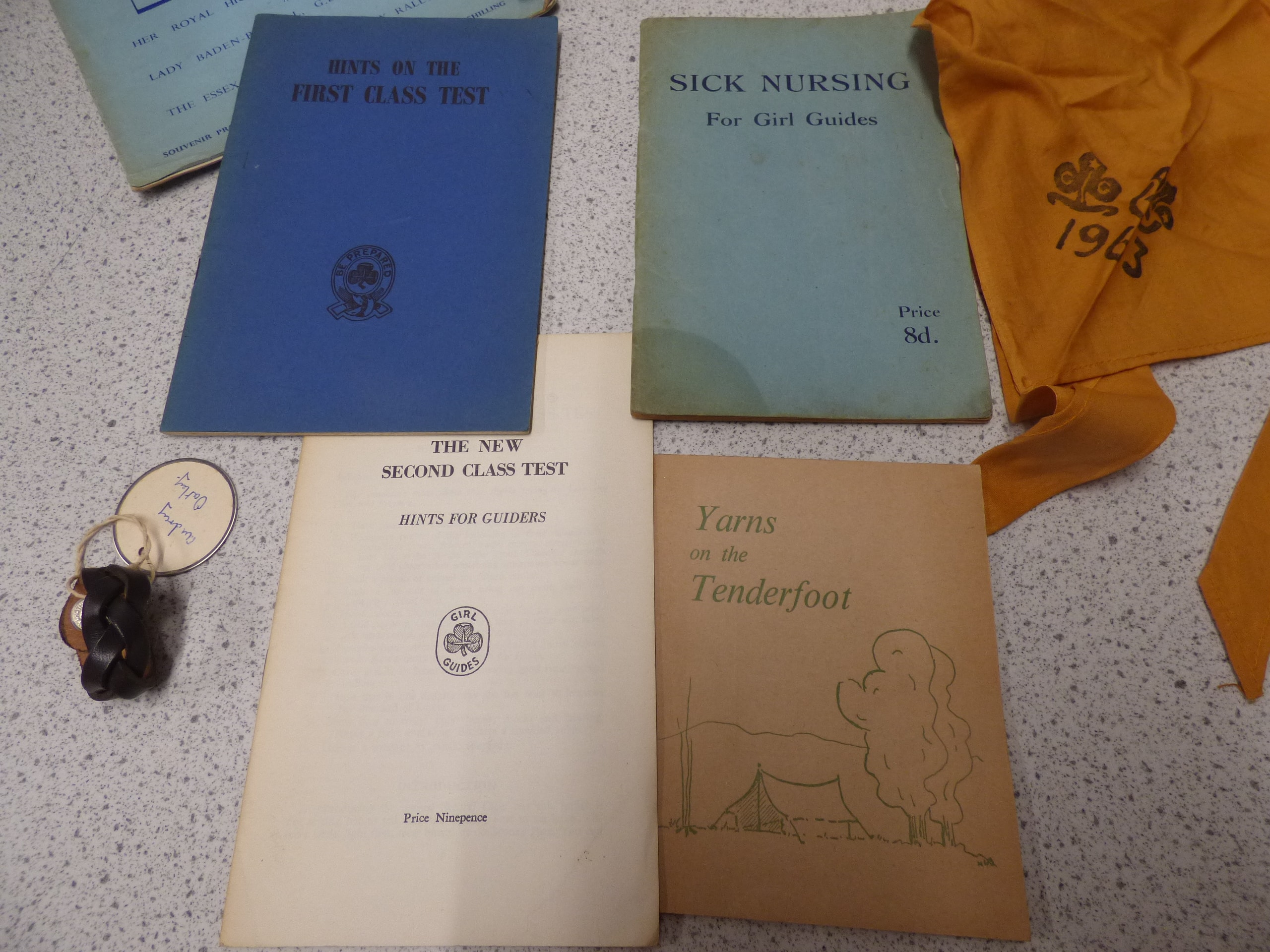The lot contains vintage Girl Guide booklets in blue, light blue, cream, and tan, including “Sick Nursing For Girl Guides” (Price 8d.), “The New Second Class Test Hints for Guiders” (Price Ninepence), “Hints on the First Class Test, ” “Yarns on the Tenderfoot, ” and three “County Rally” programs from 1959 and 1965, along with one orange fabric neckerchief with a 1963 logo, and a small dark brown carved wooden charm with a “A Happy Camper” tag.