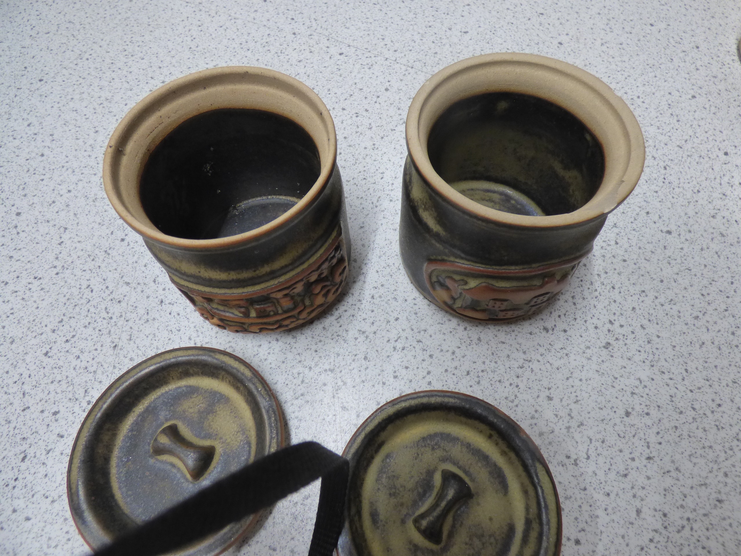A collection of five vintage studio pottery lidded jars, three Tremar Pots labelled “French Mustard, ” “Apple Sauce, ” and “Mint Sauce, ” and two with embossed designs.