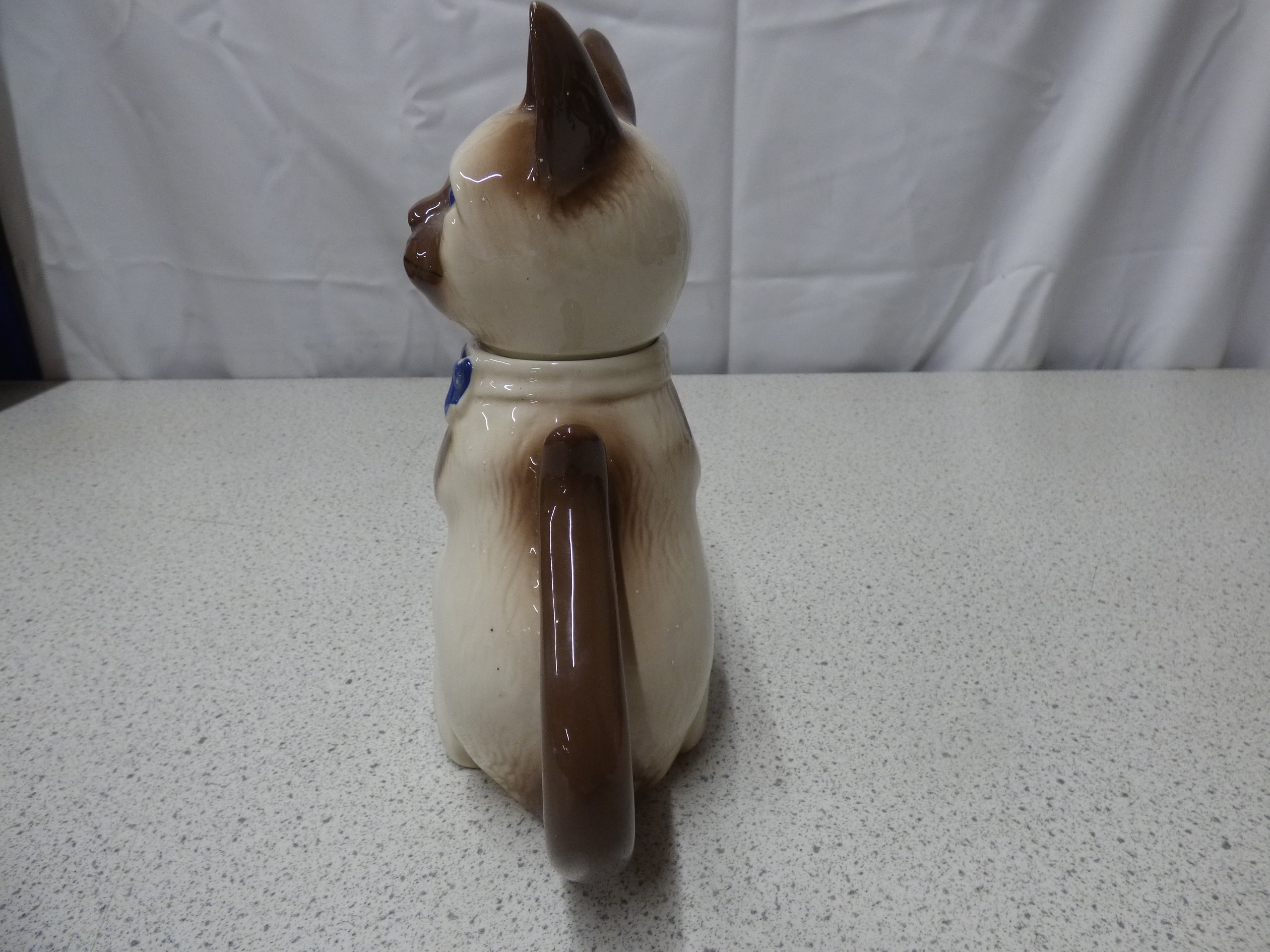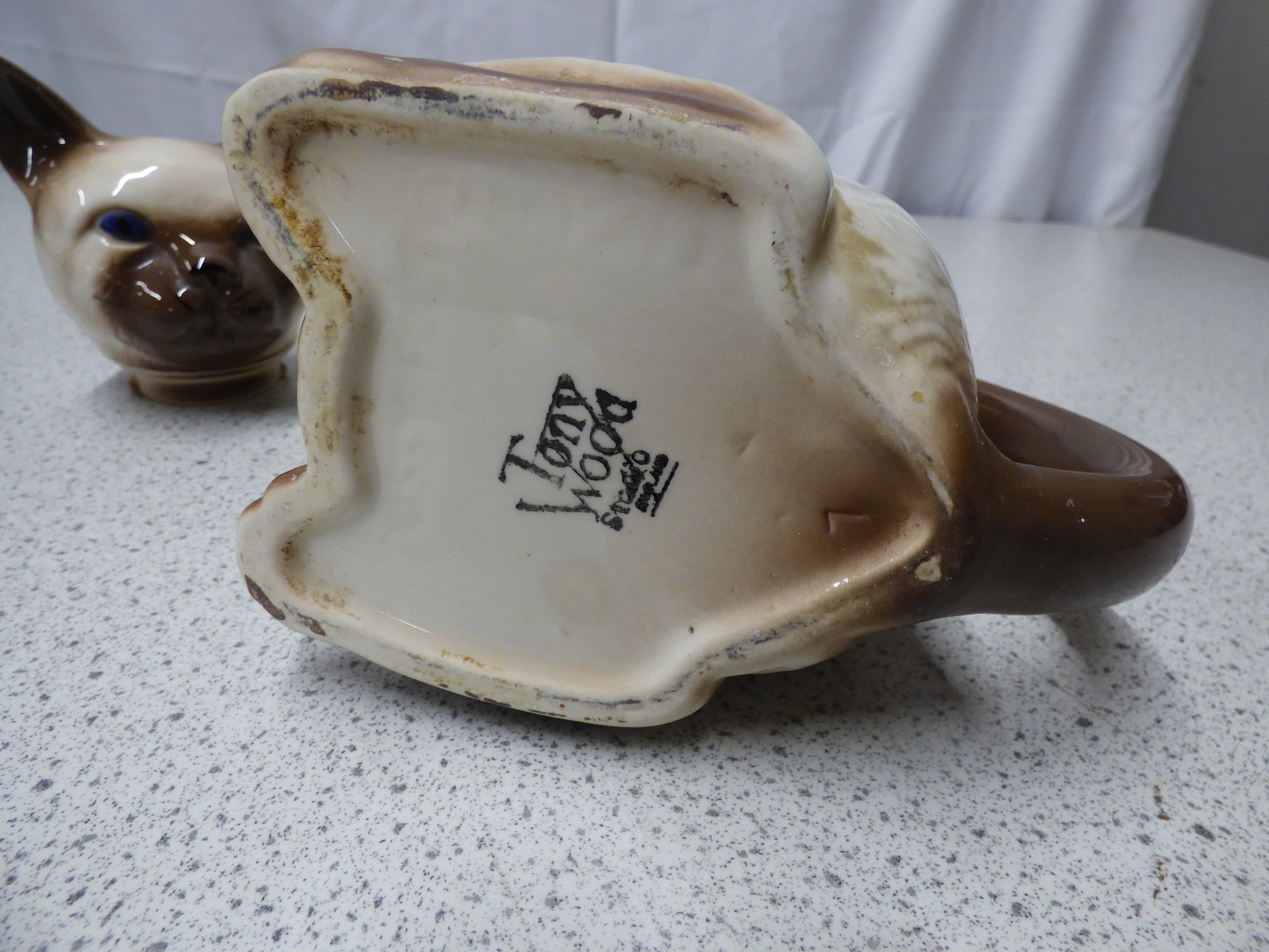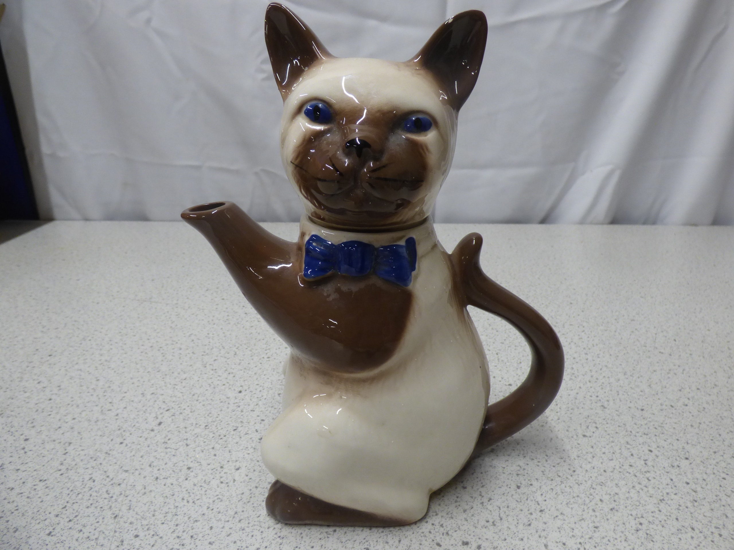 A ceramic cat-shaped teapot, primarily cream and brown with blue eyes and a blue bow, marked “Tony Wood Studio Teapots England” on the base.