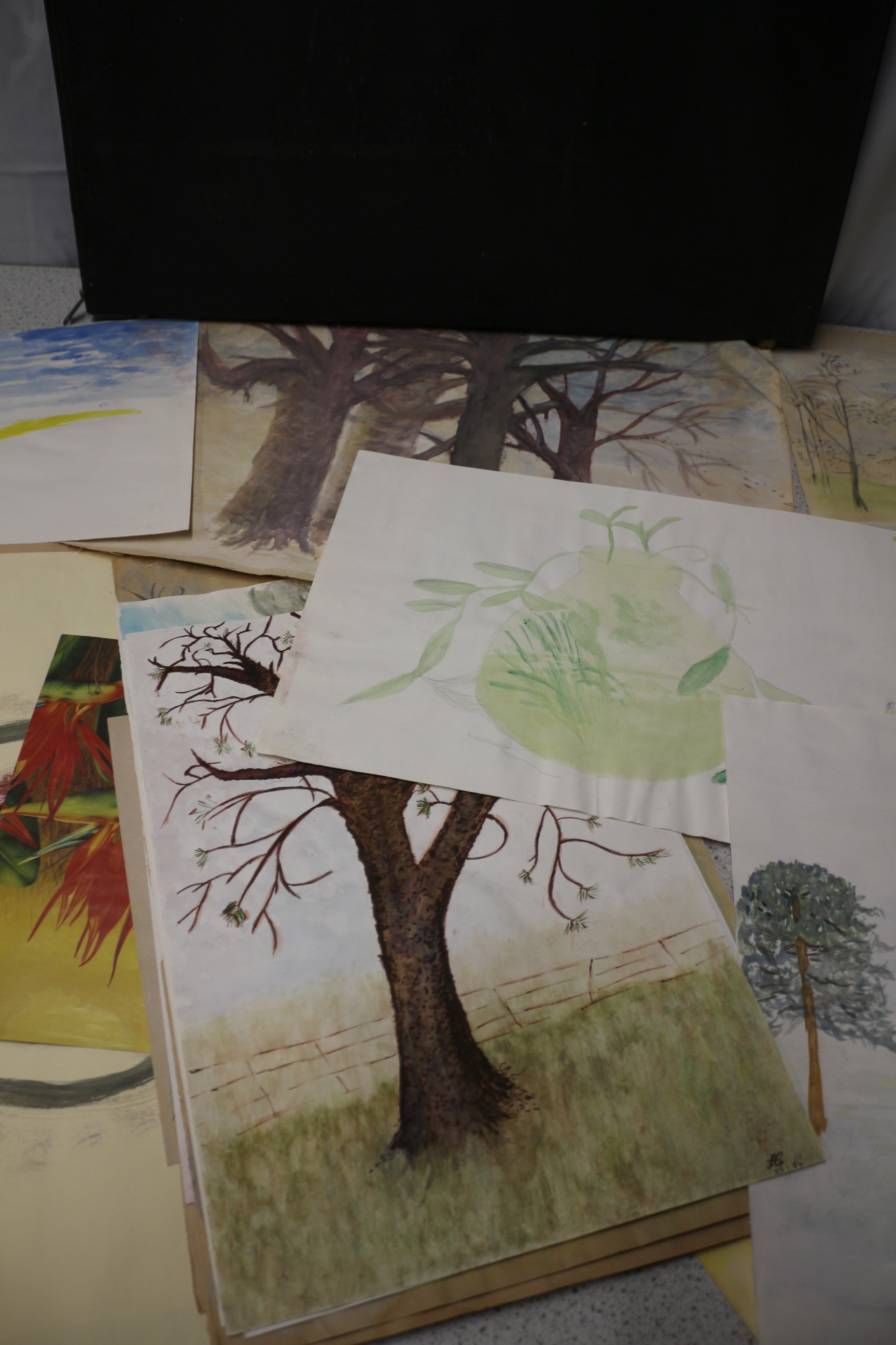 A black portfolio case containing numerous multi-colored artworks, some featuring text including ‘ASTER HAPPINESS’, ‘200 mg/ML’, and an ‘AG’ initial.