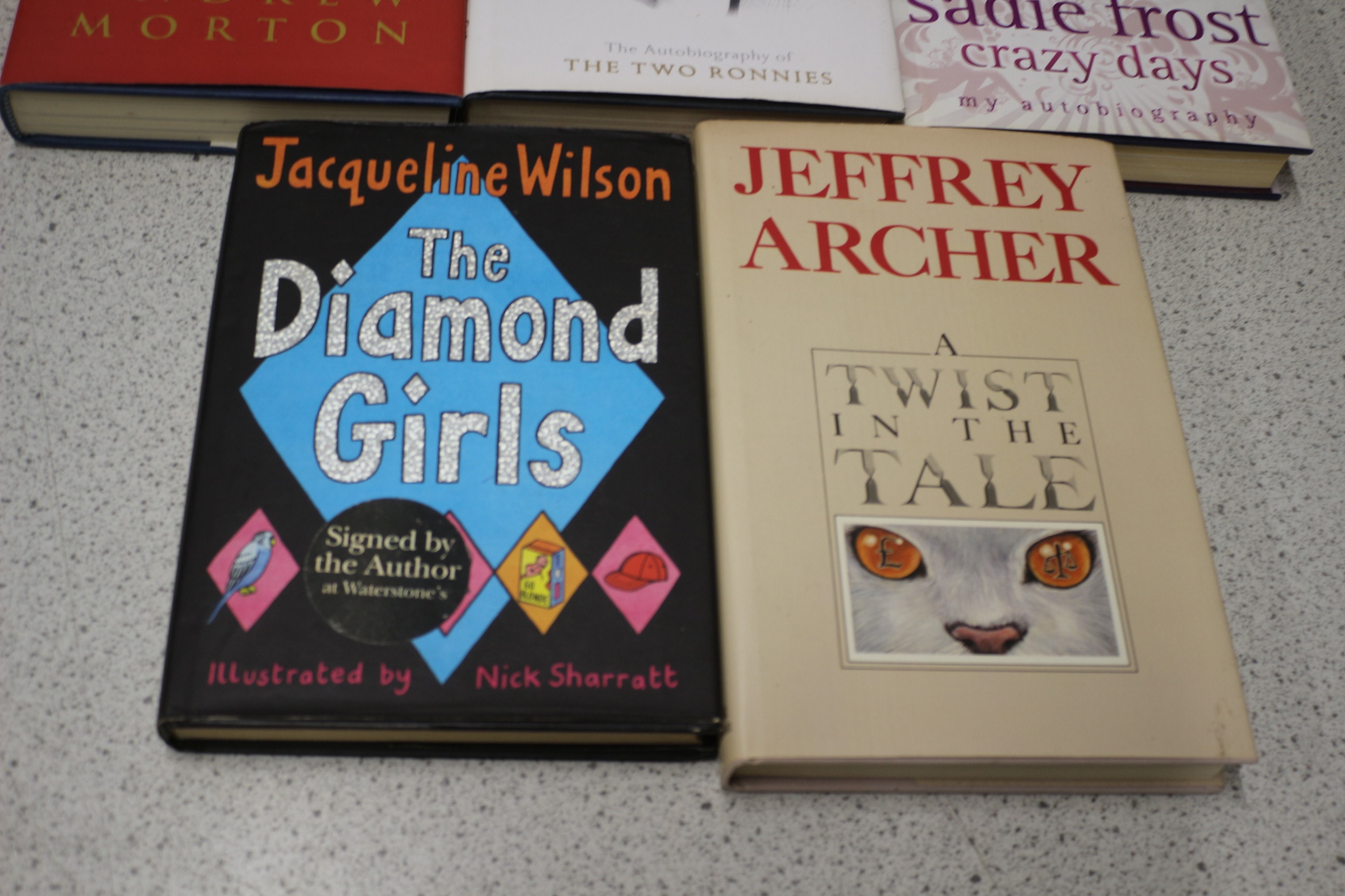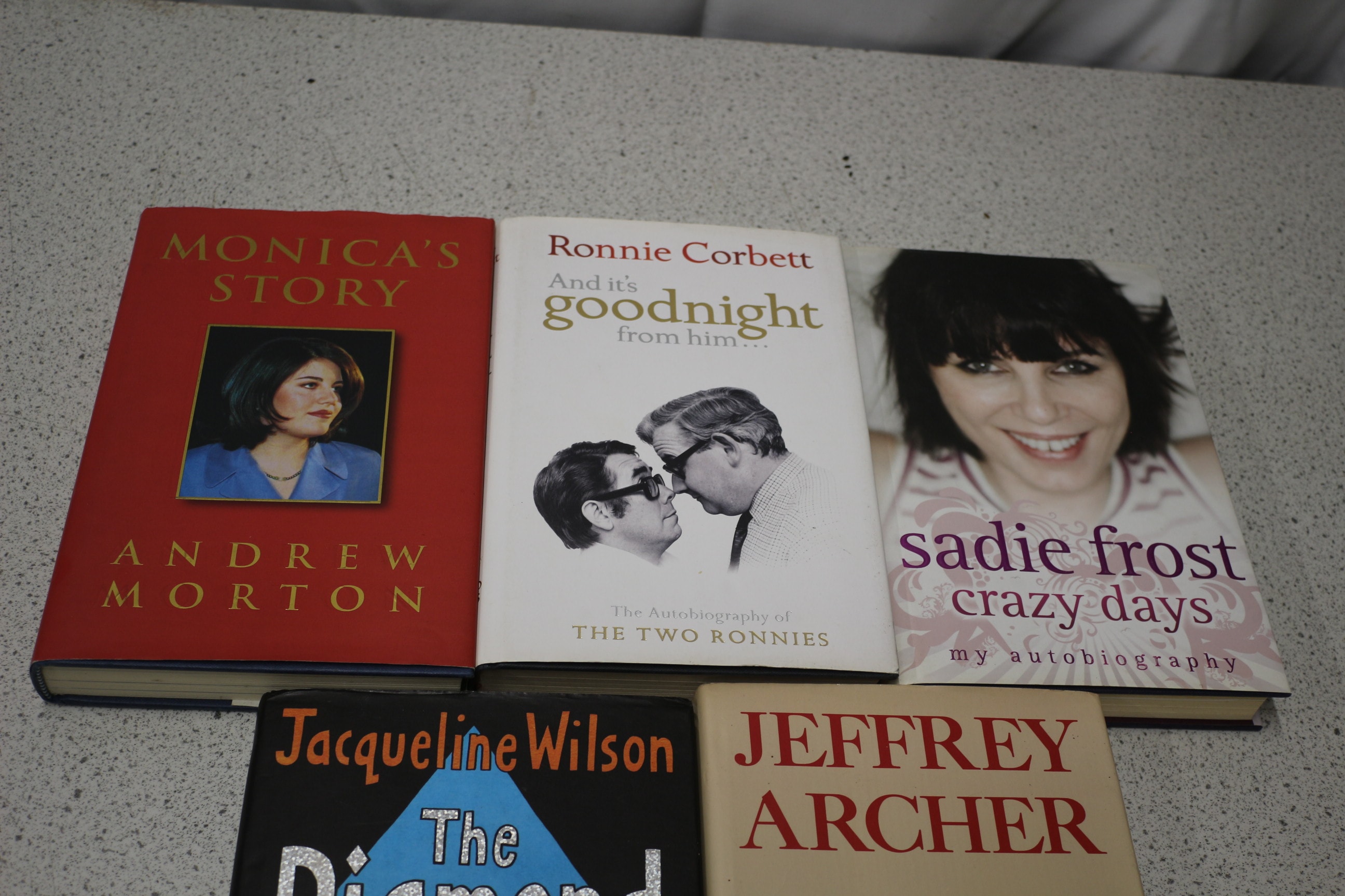 Five hardcover books including ‘Monica’s Story’ inscribed ‘Monica Lewinsky’, ‘Ronnie Corbett And it’s goodnight from him…’ inscribed ‘Ronnie Corbett’, ‘Sadie Frost crazy days’ inscribed ‘Sadie’, ‘Jacqueline Wilson The Diamond Girls’ signed by the author, and ‘JEFFREY ARCHER A TWIST IN THE TALE’ inscribed ‘Jeff Archer’.