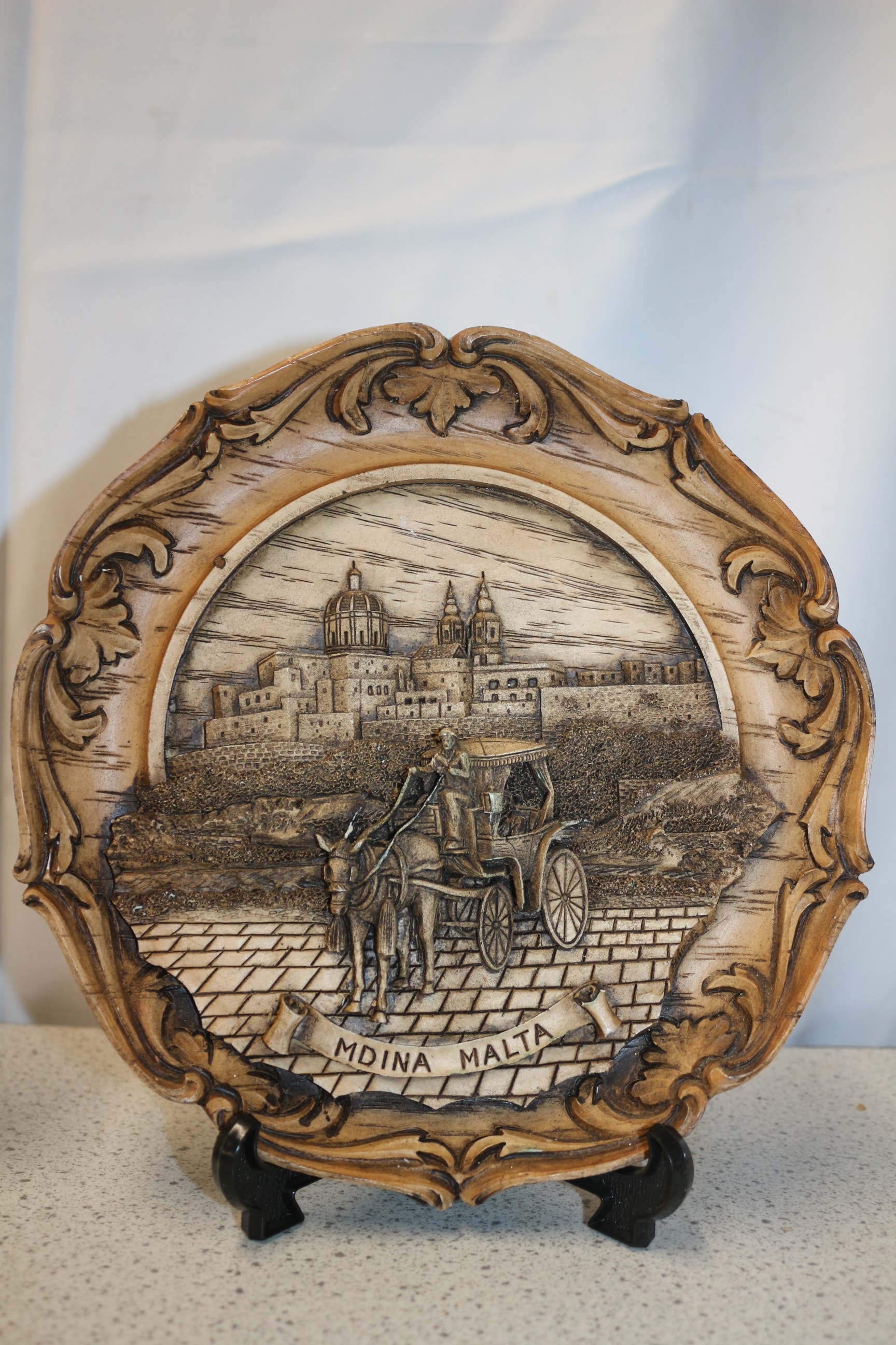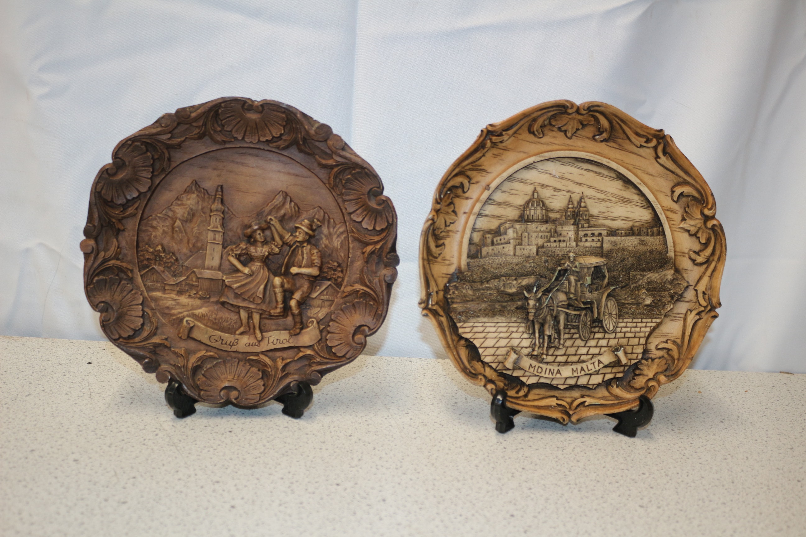 Two brown carved wood or resin decorative plates, one depicting a traditional dancing couple inscribed “Gruß aus Tirol”, and the other a horse-drawn carriage inscribed “MDINA MALTA”, each on a black stand. Largest 23cm Dia