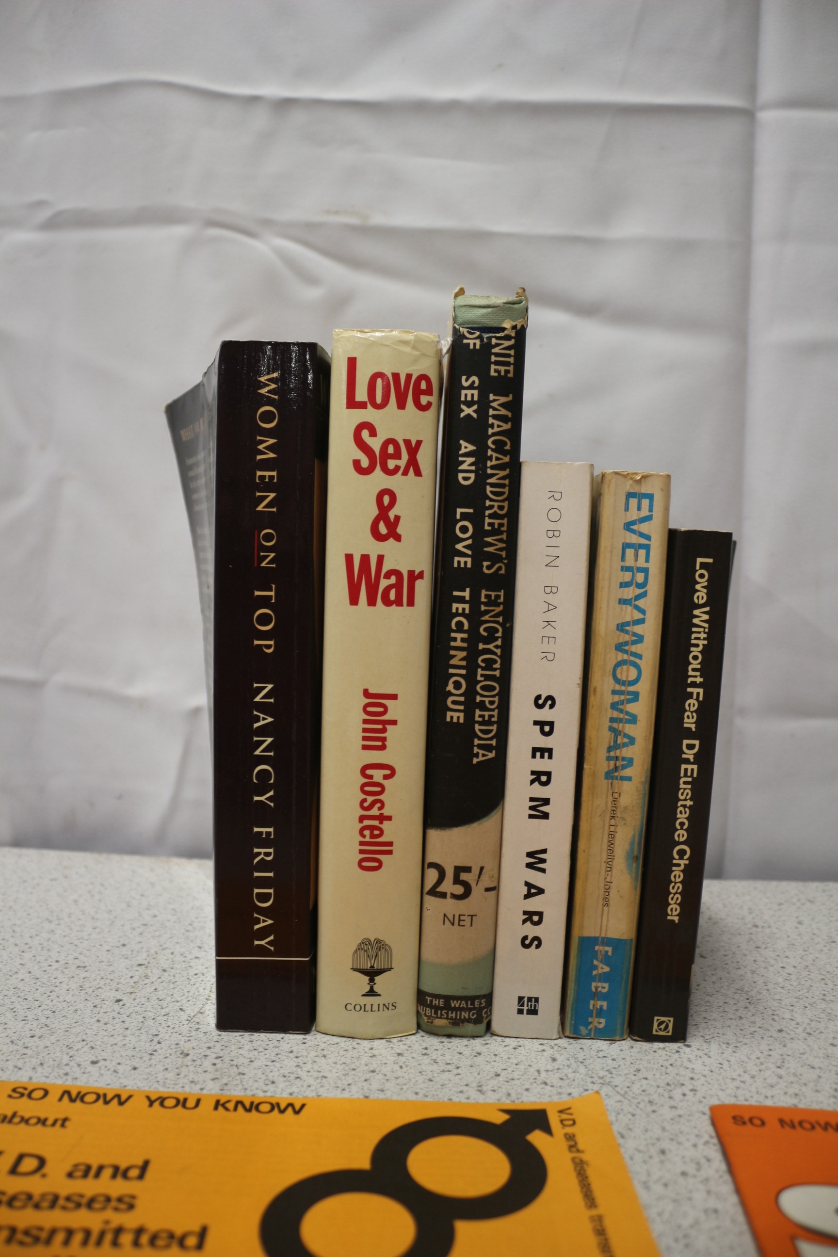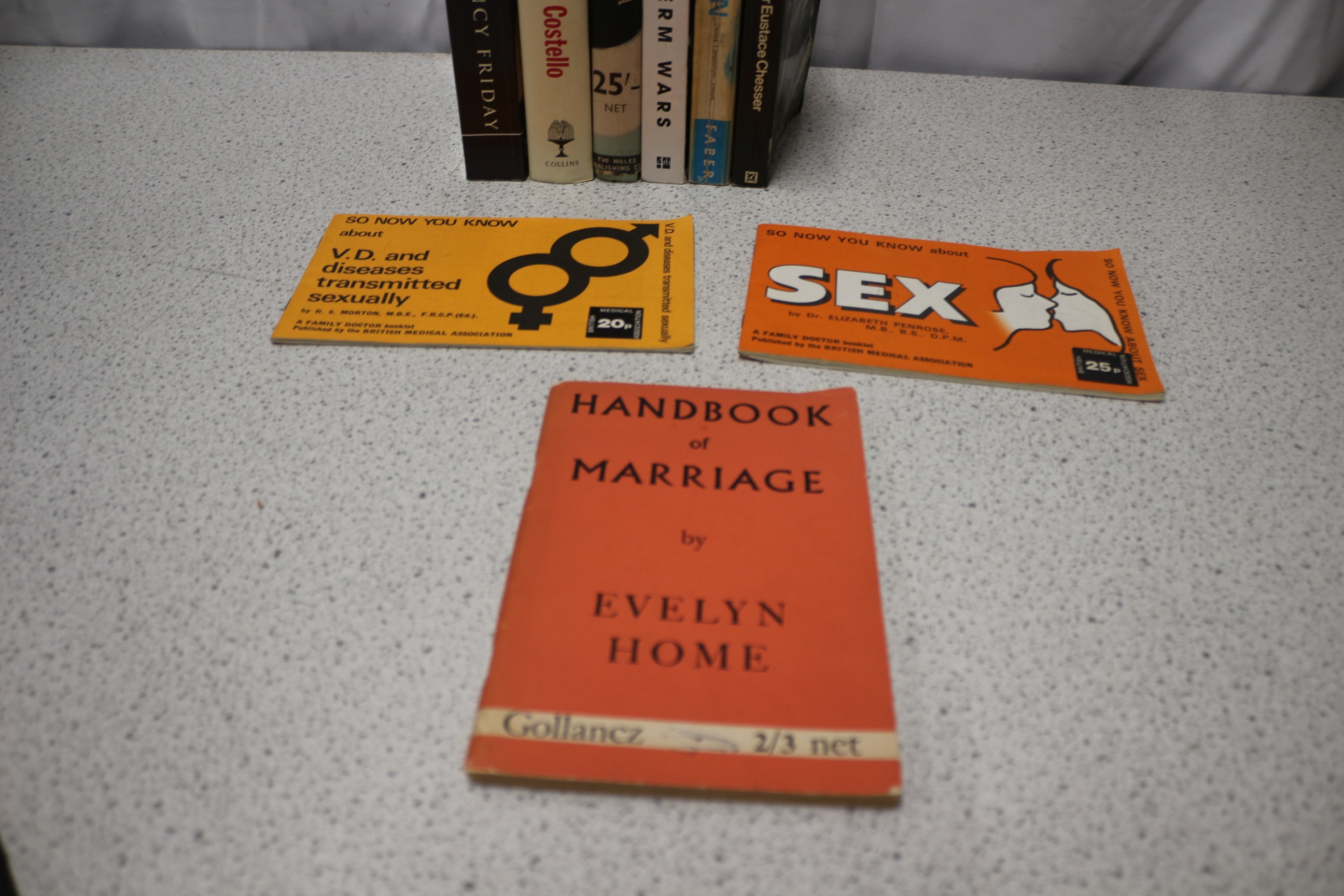 A collection of books and pamphlets, including titles like ‘Love Sex & War’ and ‘Handbook of Marriage’.