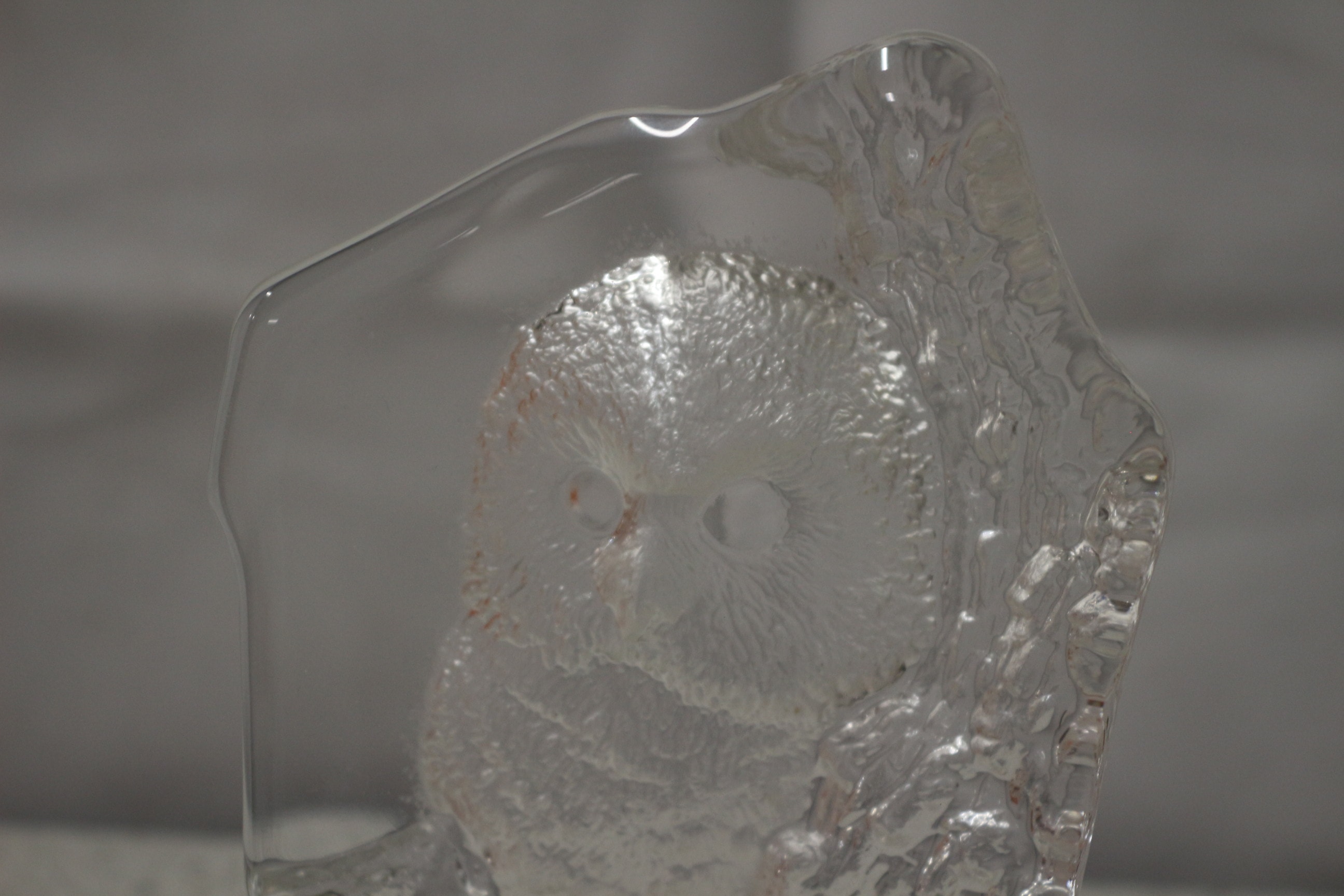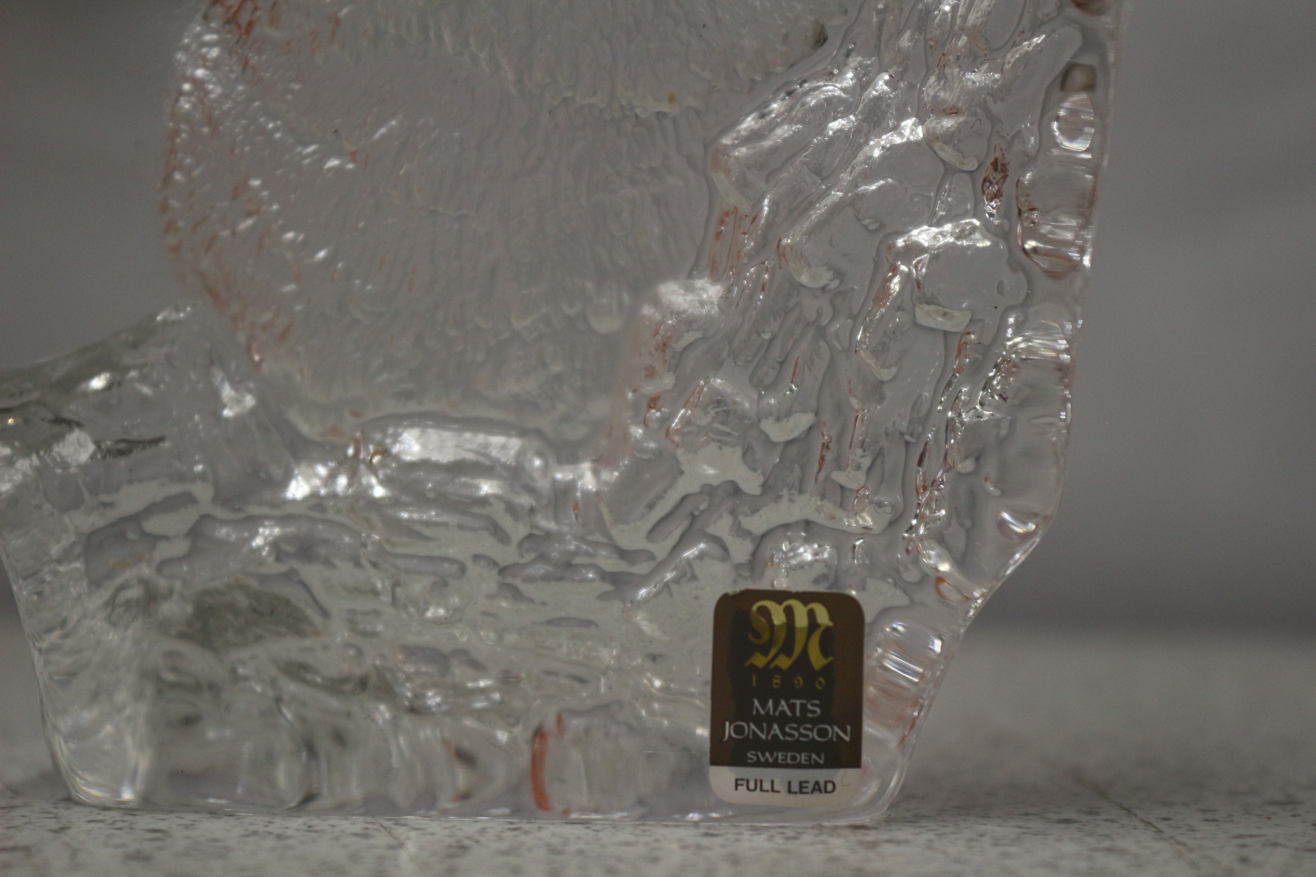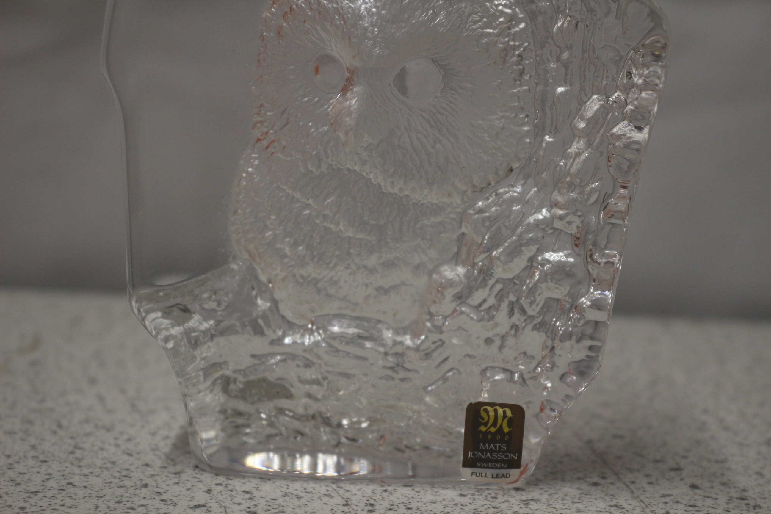 A single clear full lead crystal sculpture of an owl, featuring a brown and gold label on the base with ‘MATS JONASSON SWEDEN’. 13cm tall