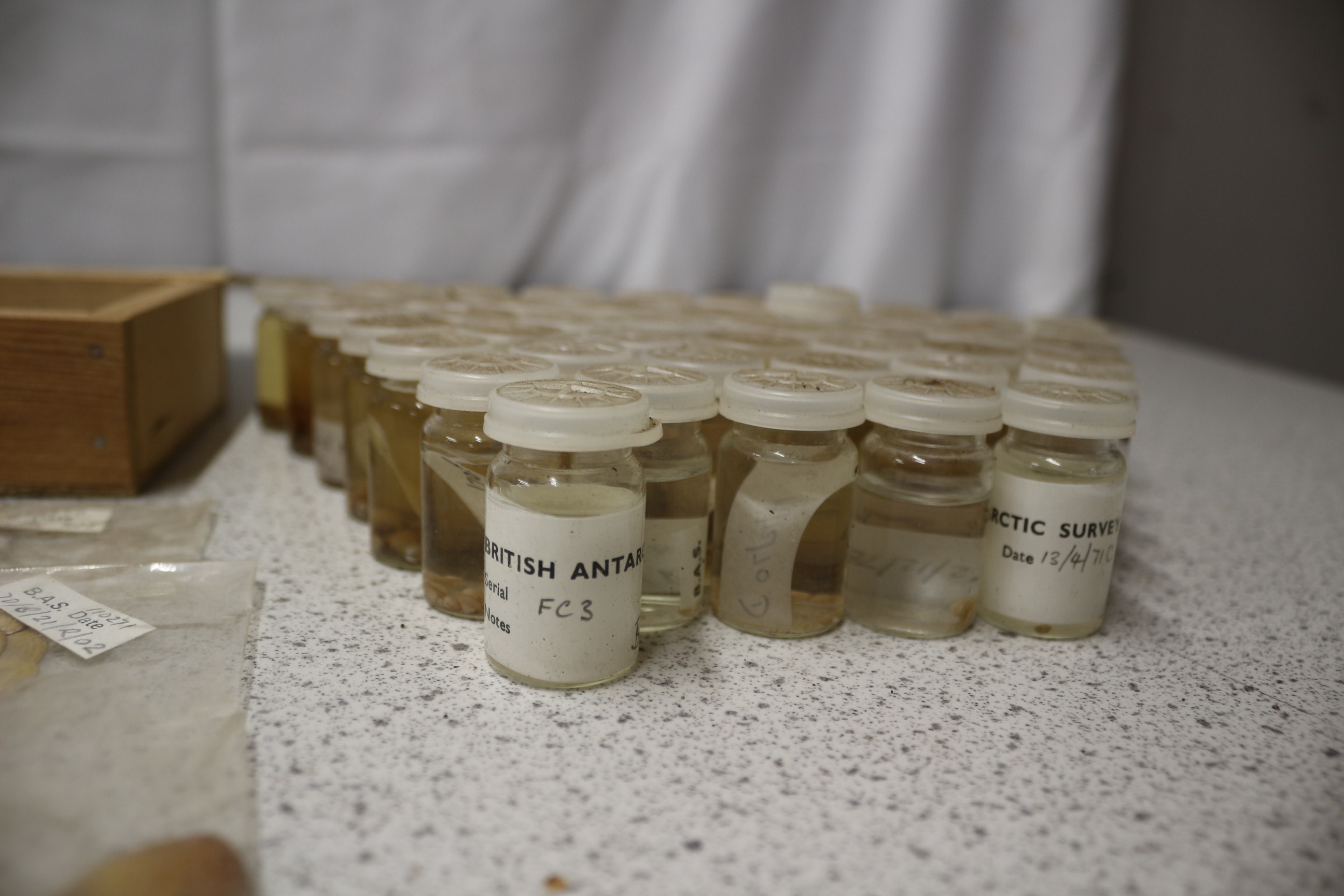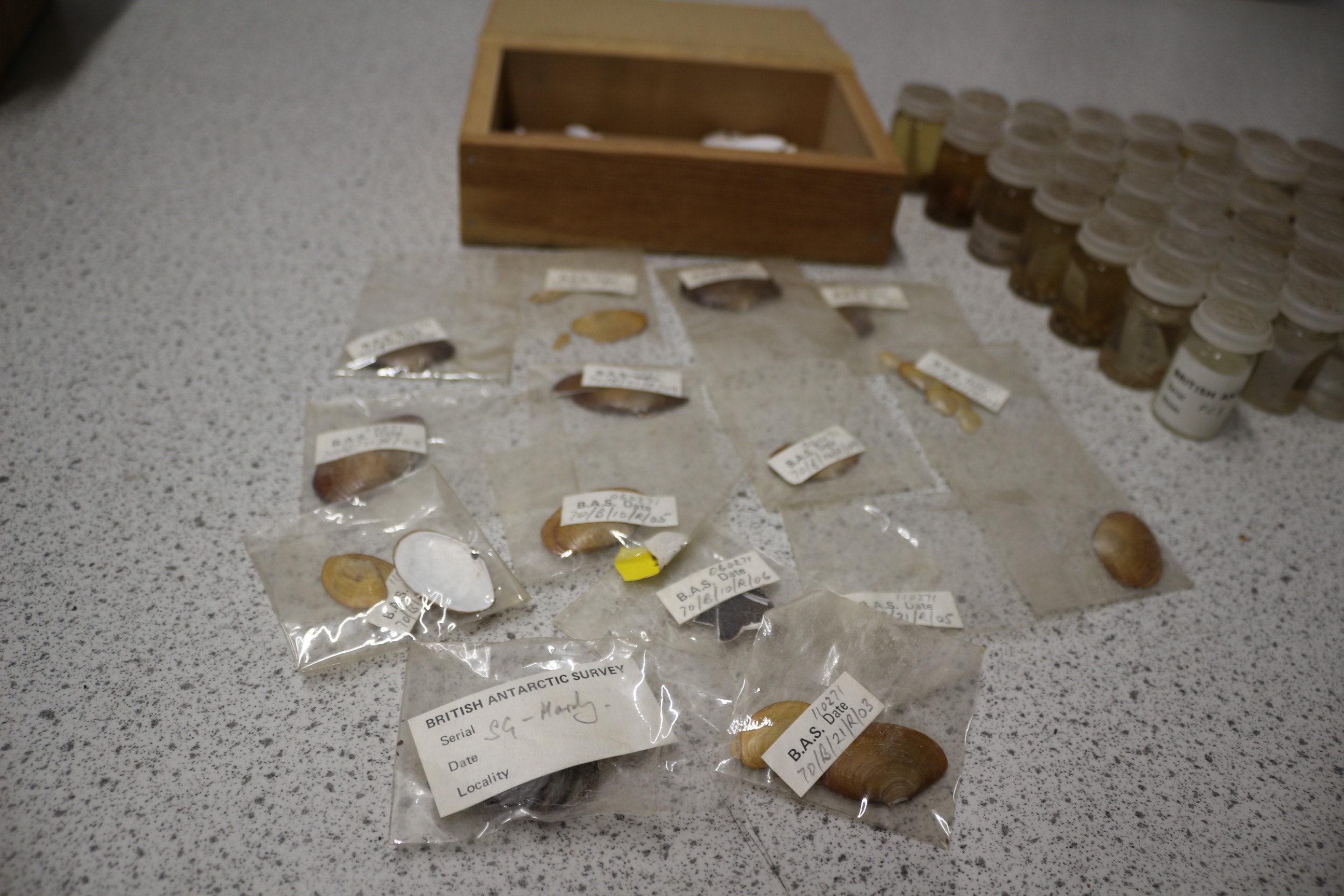 A collection of British Antarctic Survey biological specimens, including shells and granules, in bags, vials, and a wooden box.