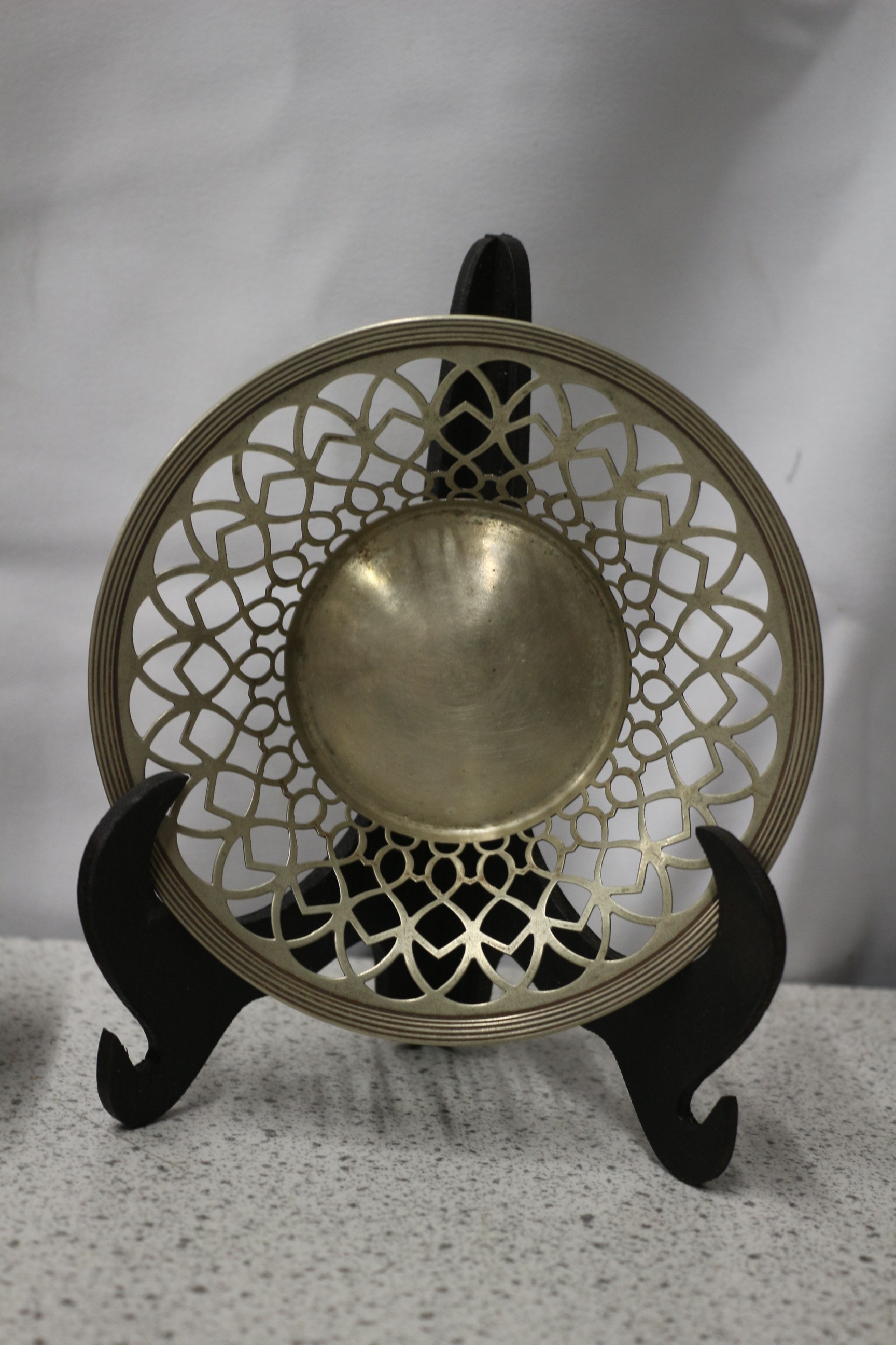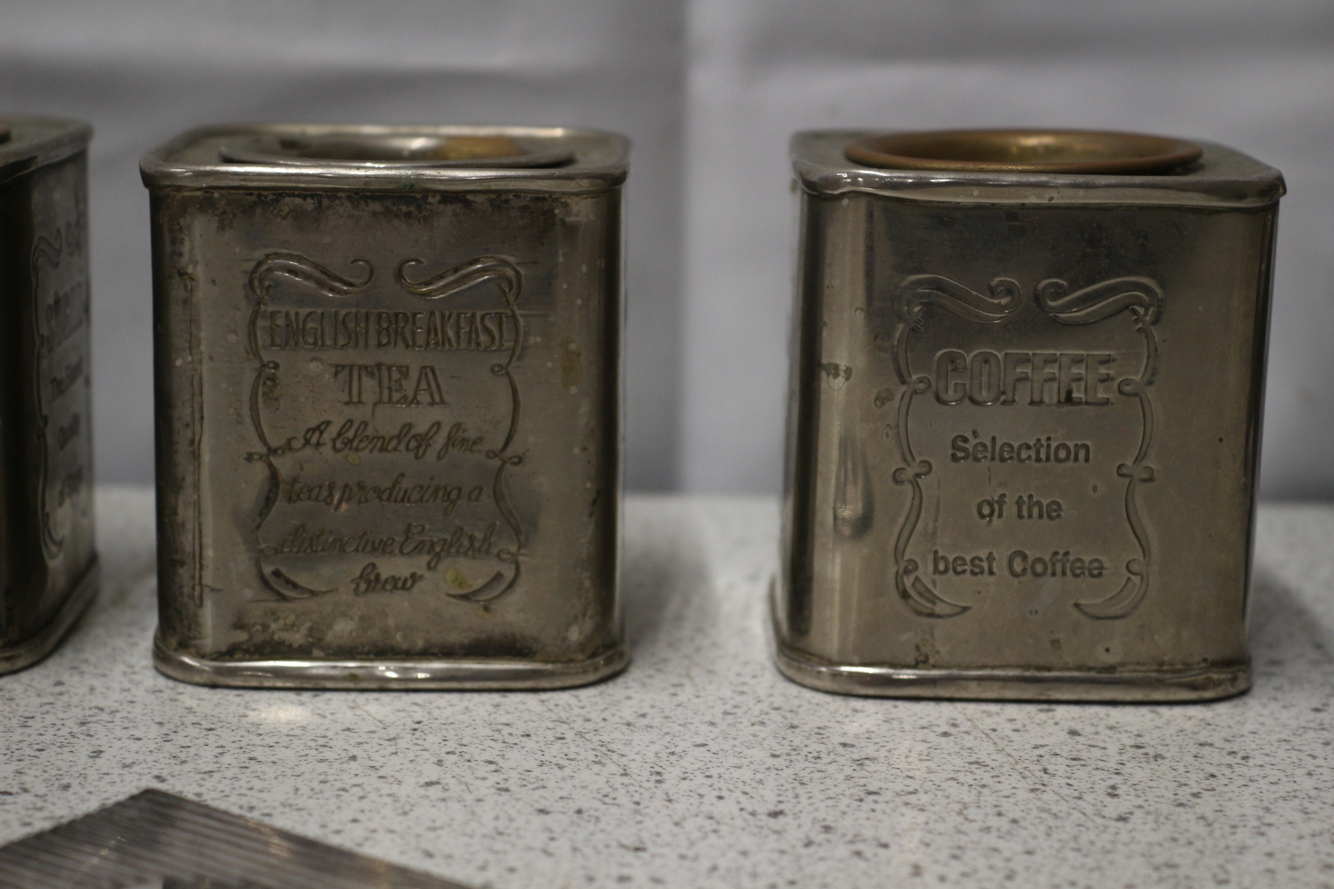 A collection of six metal items, including an engraved hip flask, three labelled storage caddies for ‘Sugar’, ‘English Breakfast Tea’, and ‘Coffee’, a decorative openwork plate on a stand, and a ribbed case.