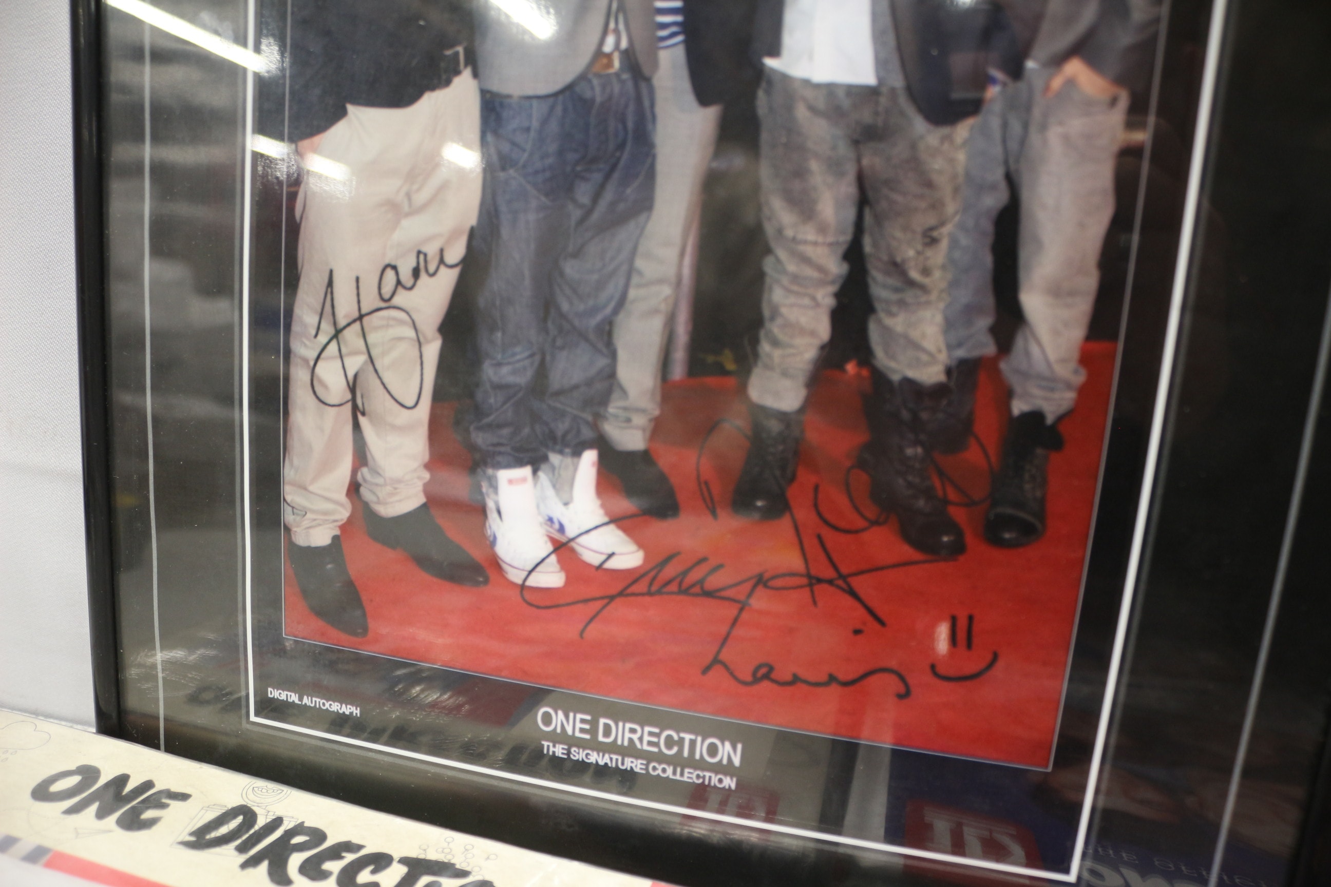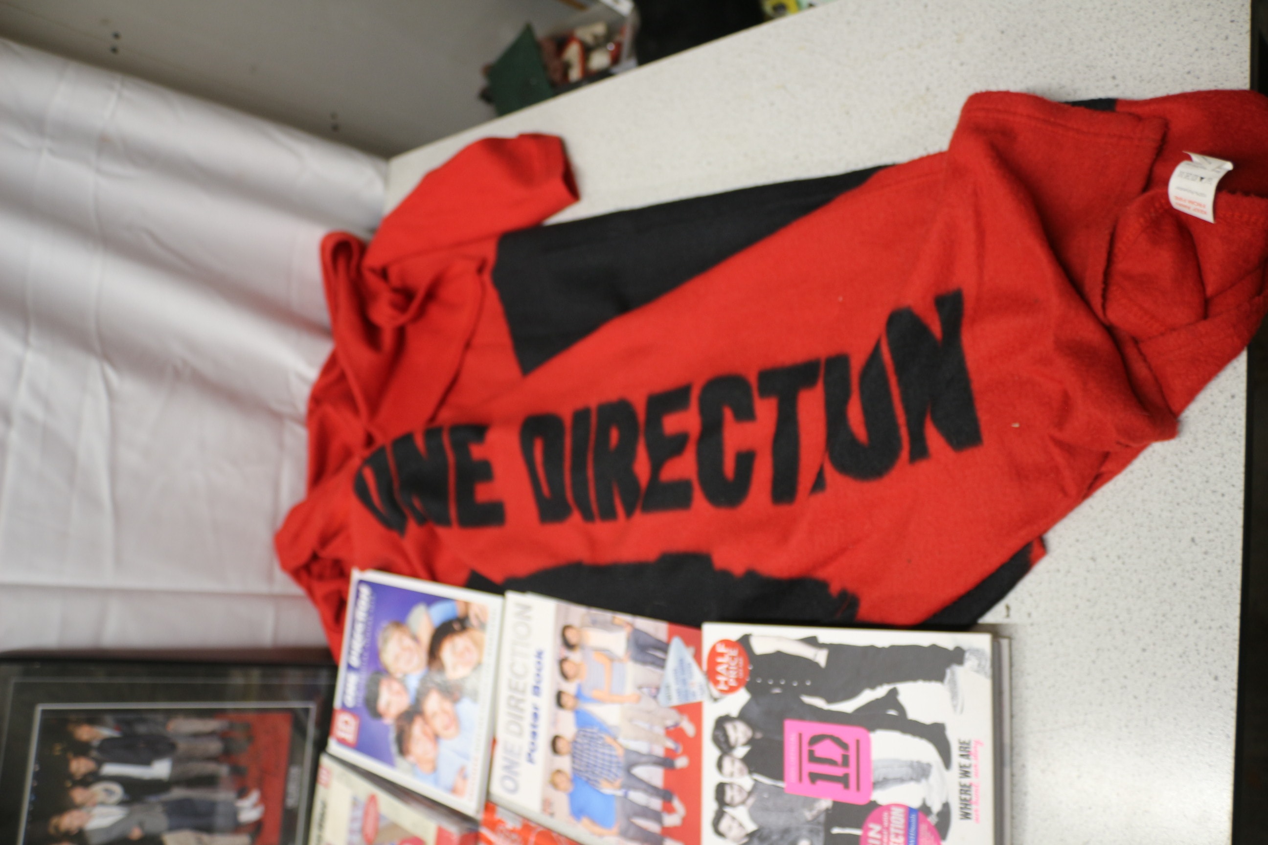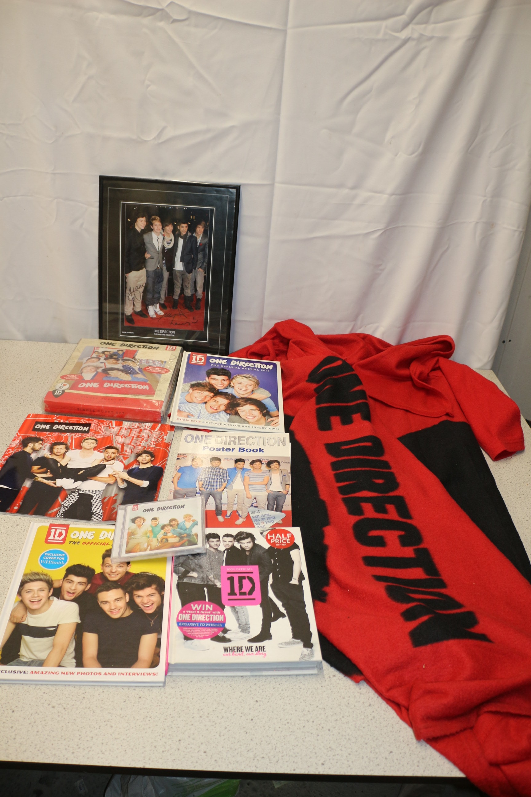 A collection of One Direction memorabilia, including a framed ‘Digital Autograph’ print, several official annuals and books, a single duvet set, a CD, and a red and black branded garment.