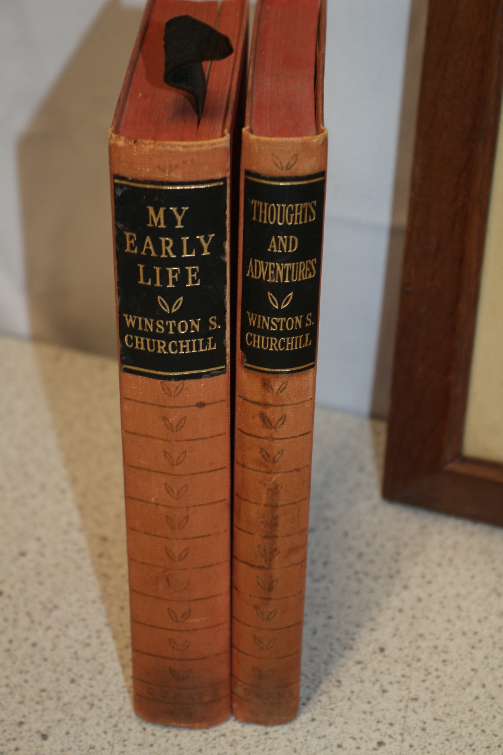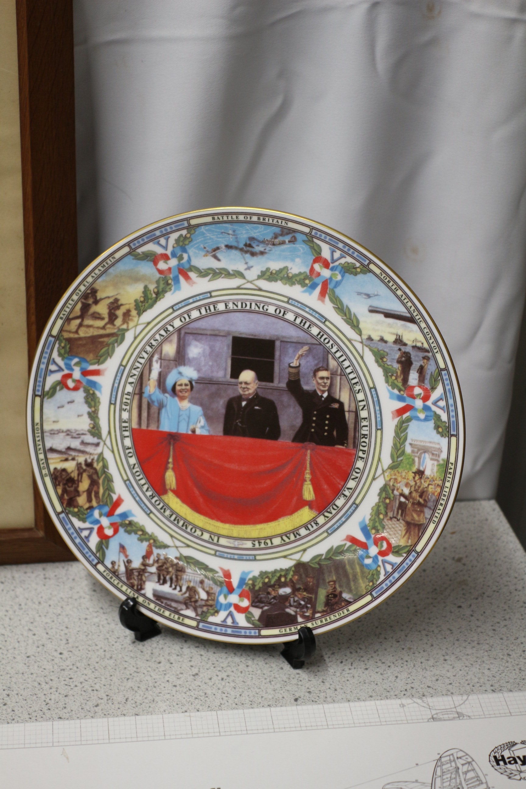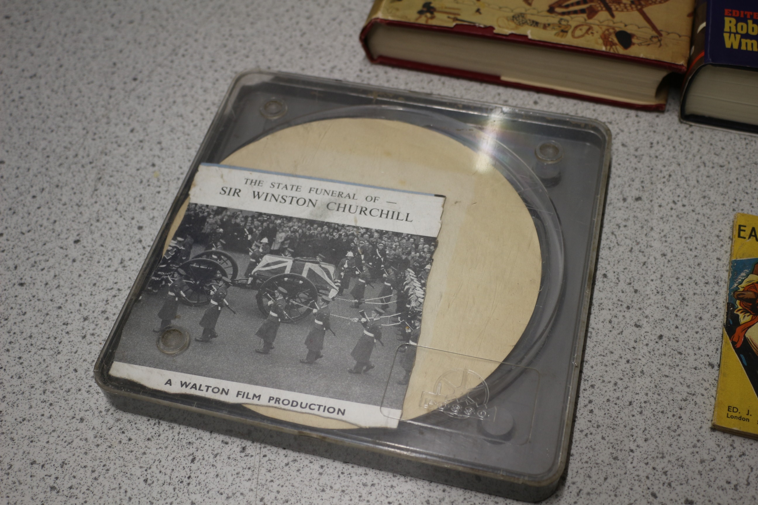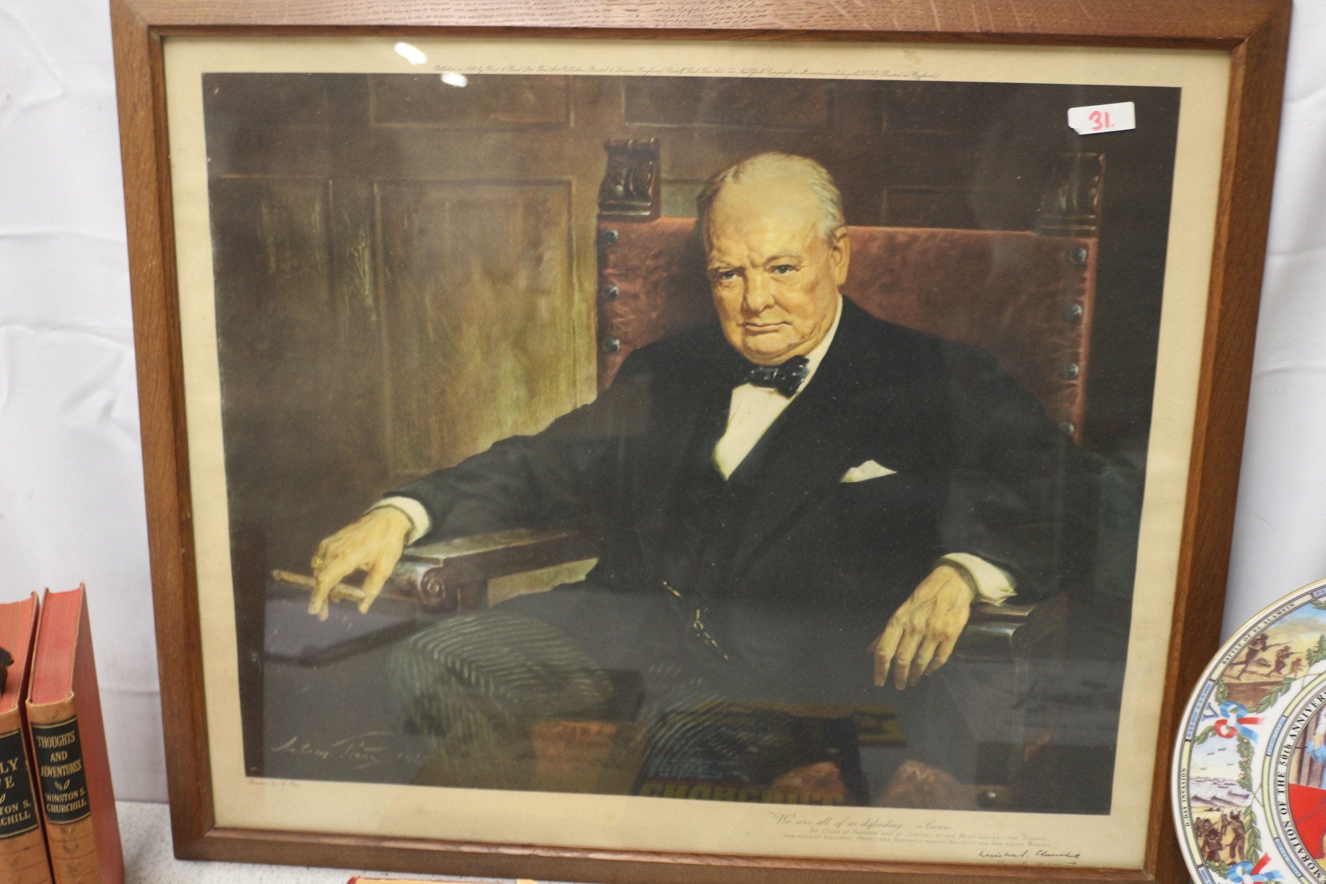 A framed colour print featuring Winston Churchill seated, published by The Fine Art Society Ltd. on October 1st, 1930, with visible text including “© WALTER SICKERT” and a quote. Film of his funeral, commemorative plate and other items