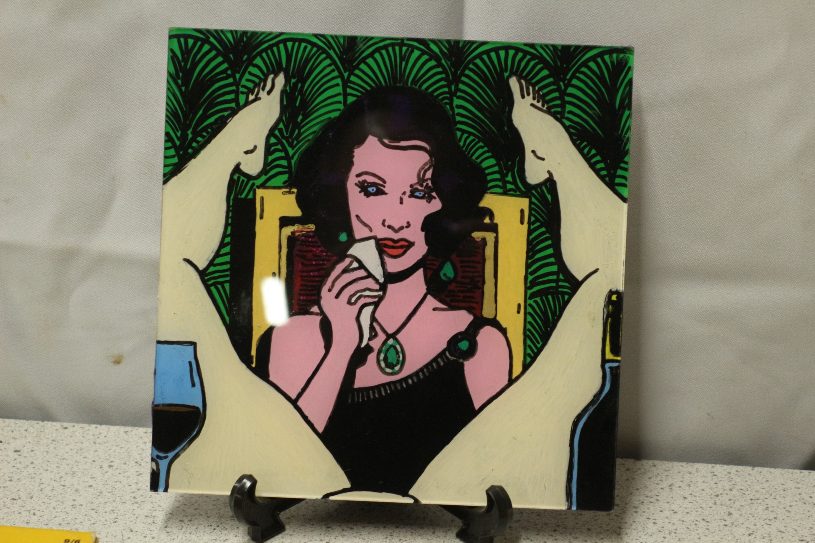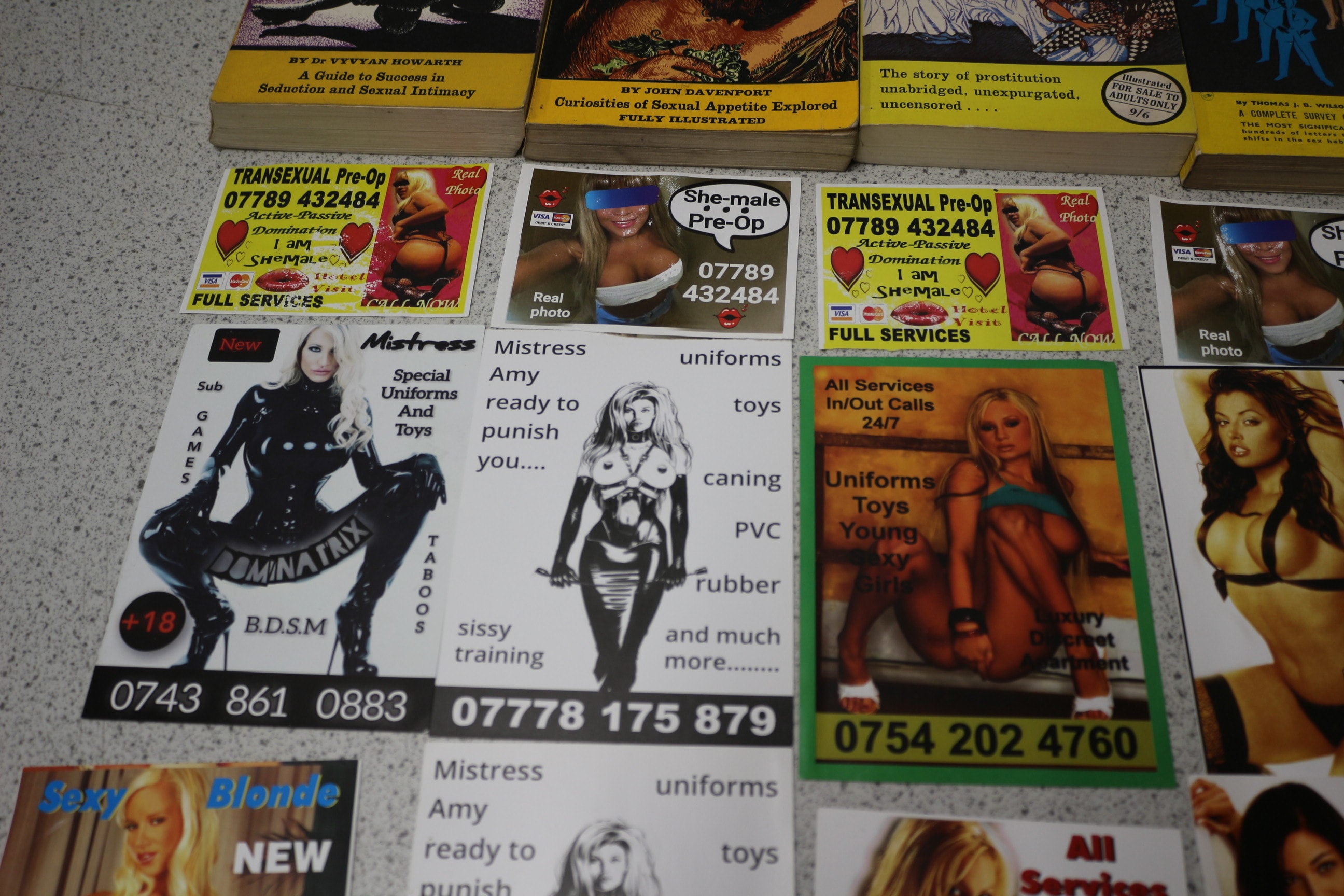 A square pop art glass piece depicting a woman, accompanied by four vintage adult-themed books and a collection of numerous adult services advertisement cards.