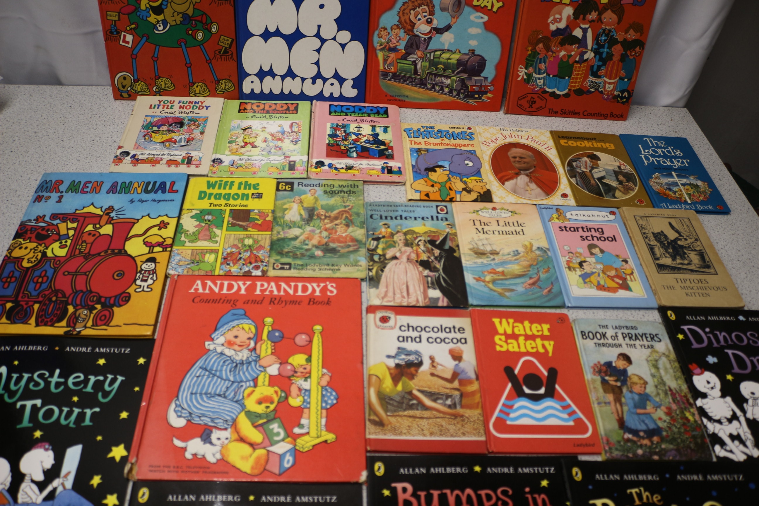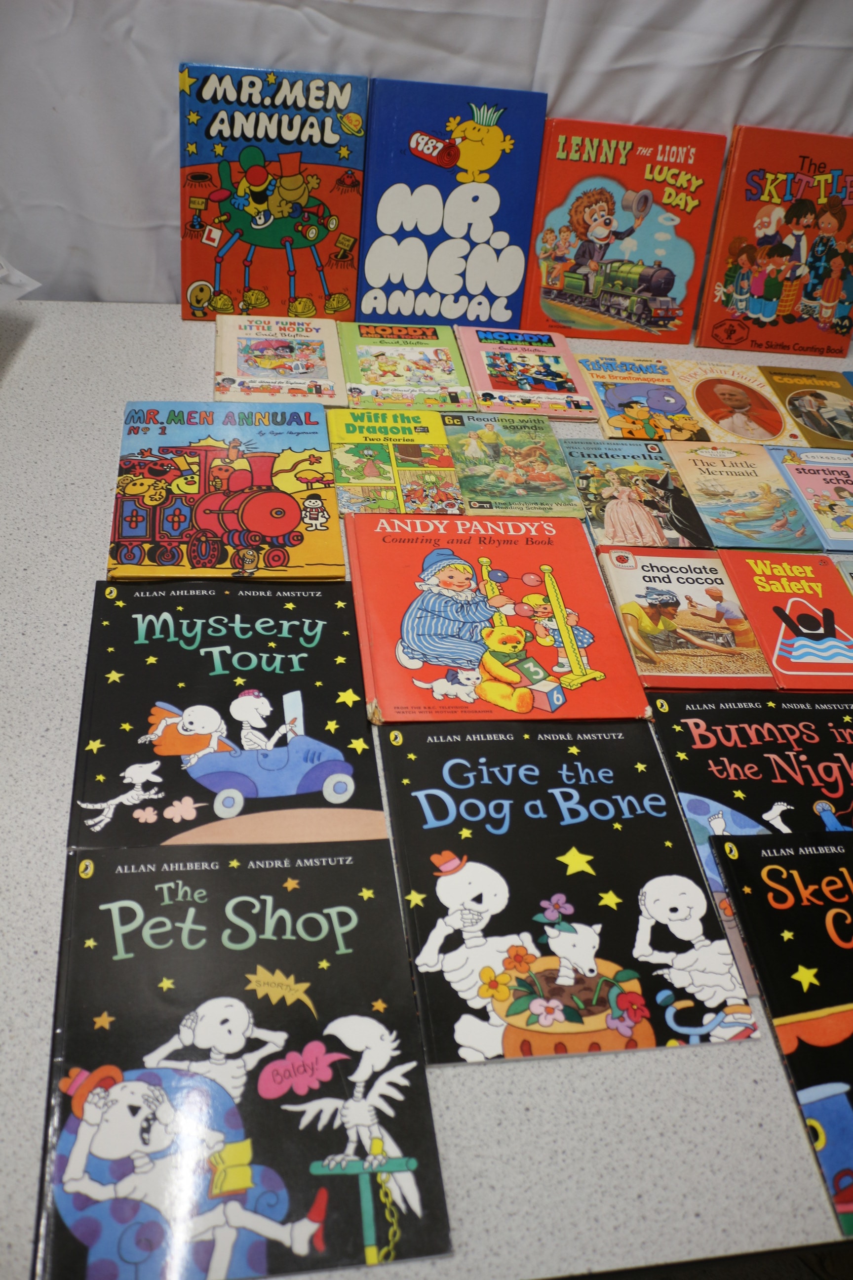 A collection children’s hardcover and softcover books in various colours, including titles like “MR. MEN ANNUAL”, “LENNY THE LION’S LUCKY DAY”, “THE SKITTLES Counting Book”, “ANDY PANDY’S Counting and Rhyme Book”, and several “Funnybones” series books by Allan Ahlberg and André Amstutz.