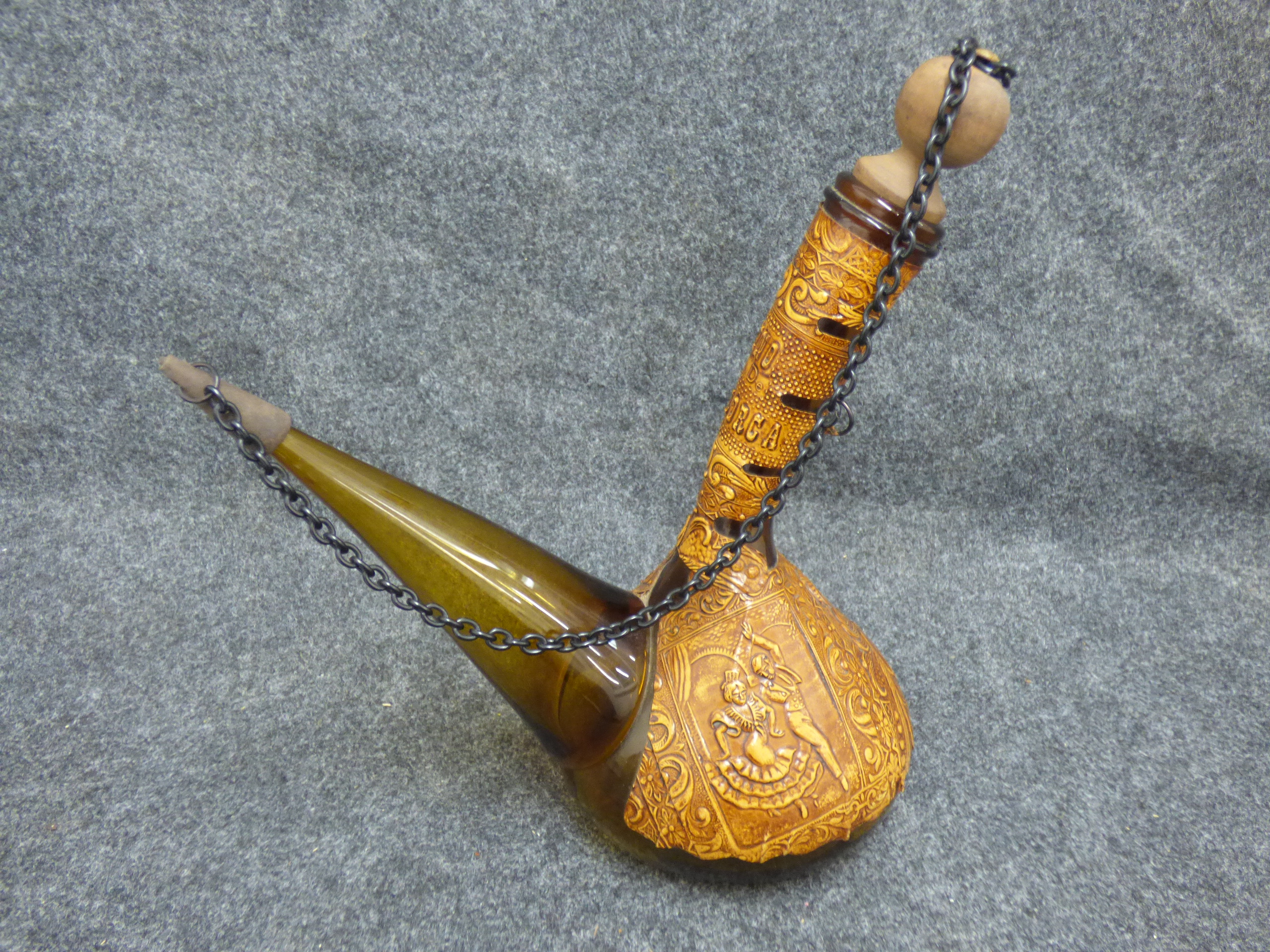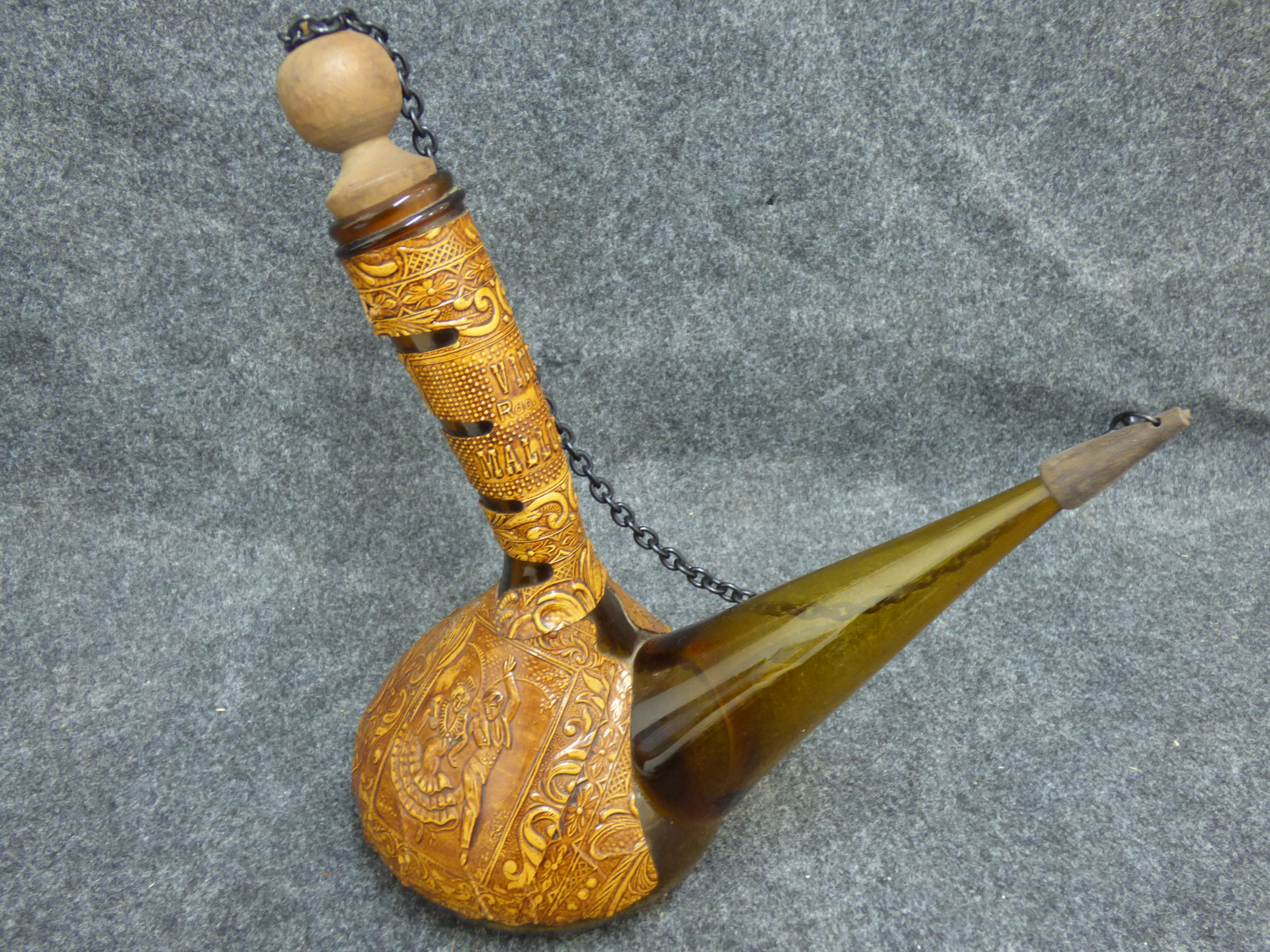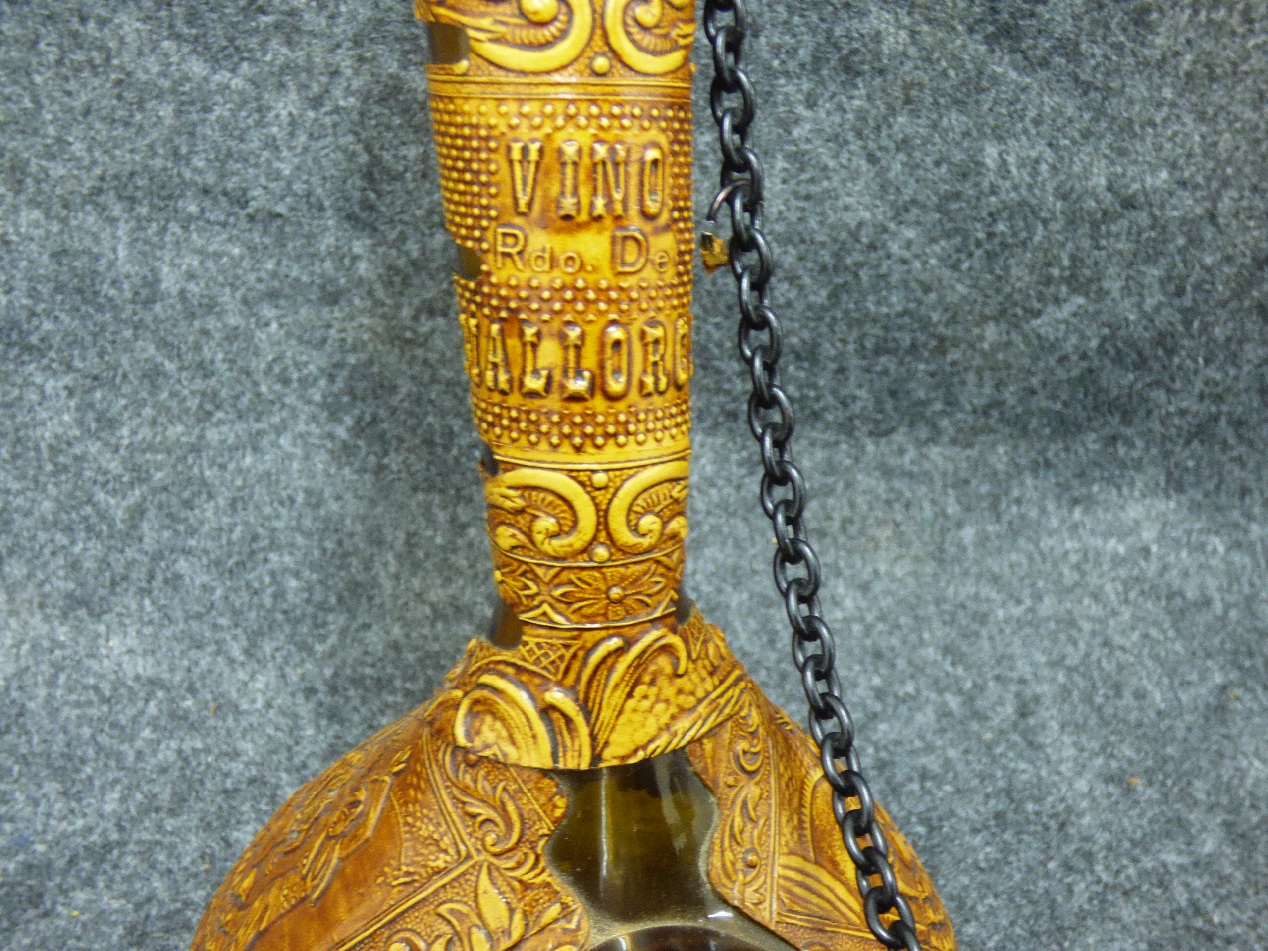 A brown glass porron wine pitcher with wooden stoppers, encased in a tan leather cover featuring embossed flamenco dancers and the inscription VINO Rdo. De MALLORCA. 29cm tall