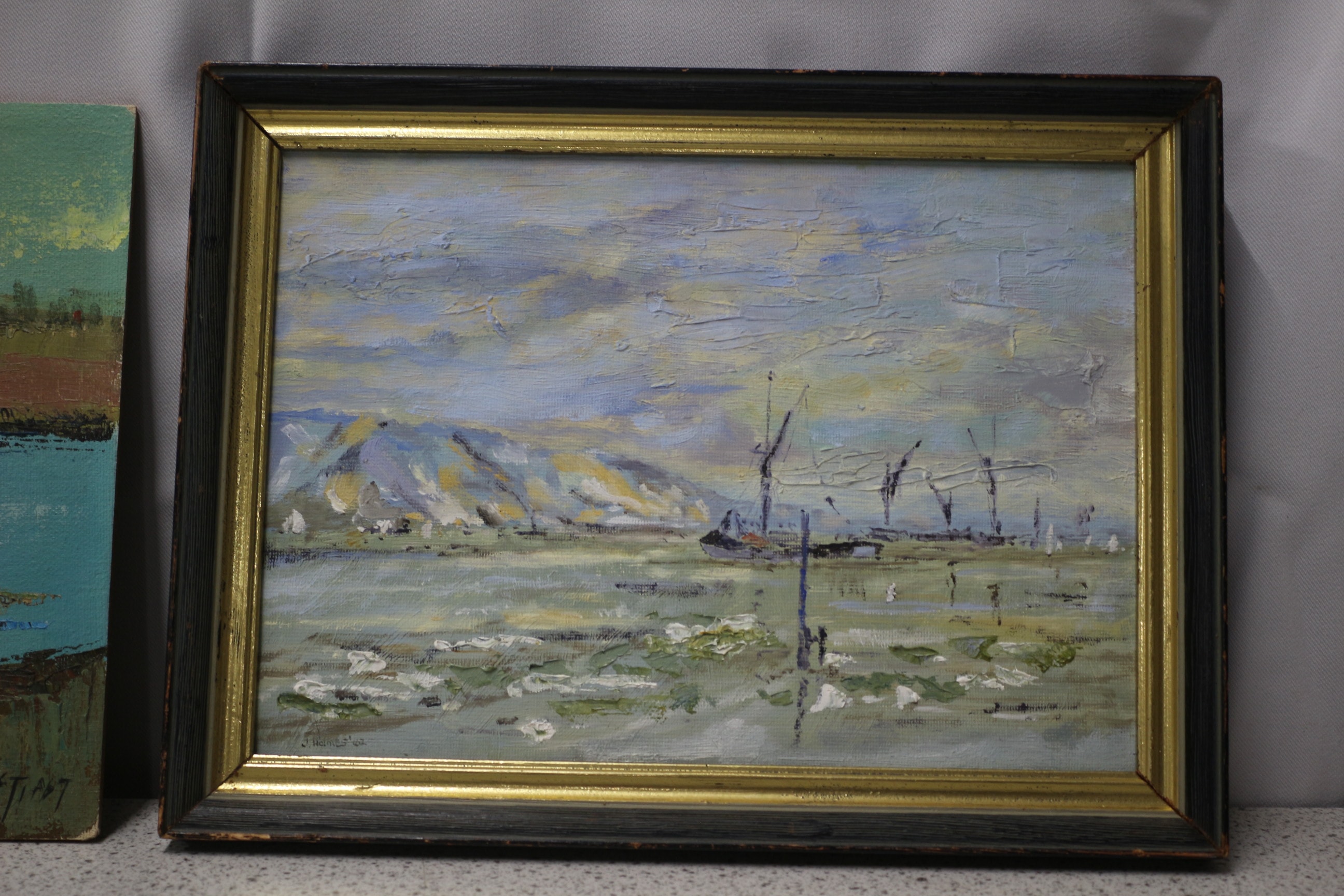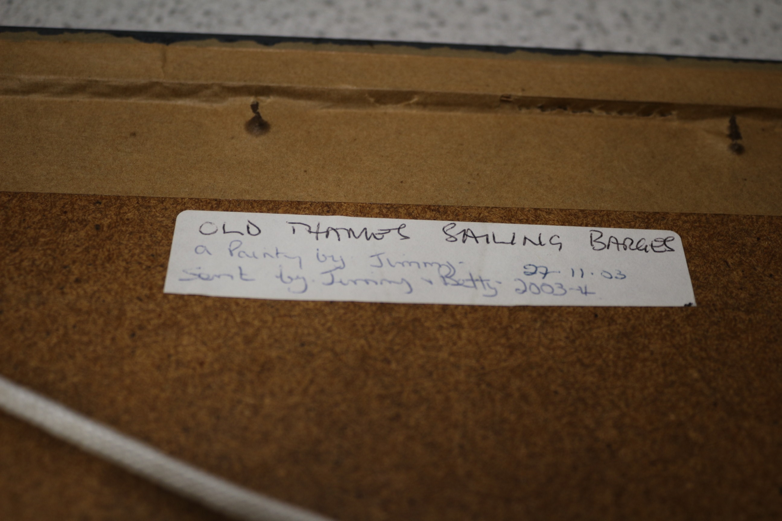 A pair of oil paintings, one unframed landscape signed ‘V.VENAT.07’, and one framed seascape depicting ‘OLD THAMES SAILING BARGES’ identified as ‘a Painting by Jimmy.’. Largest 28x21cm